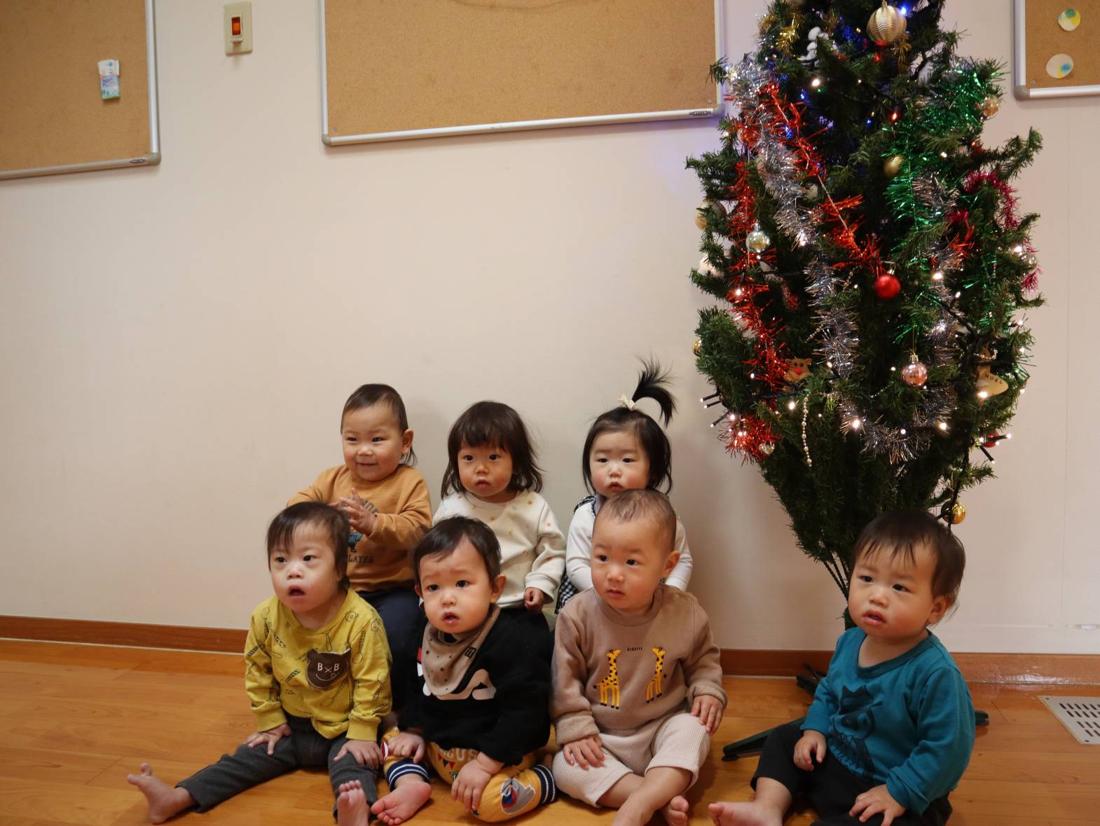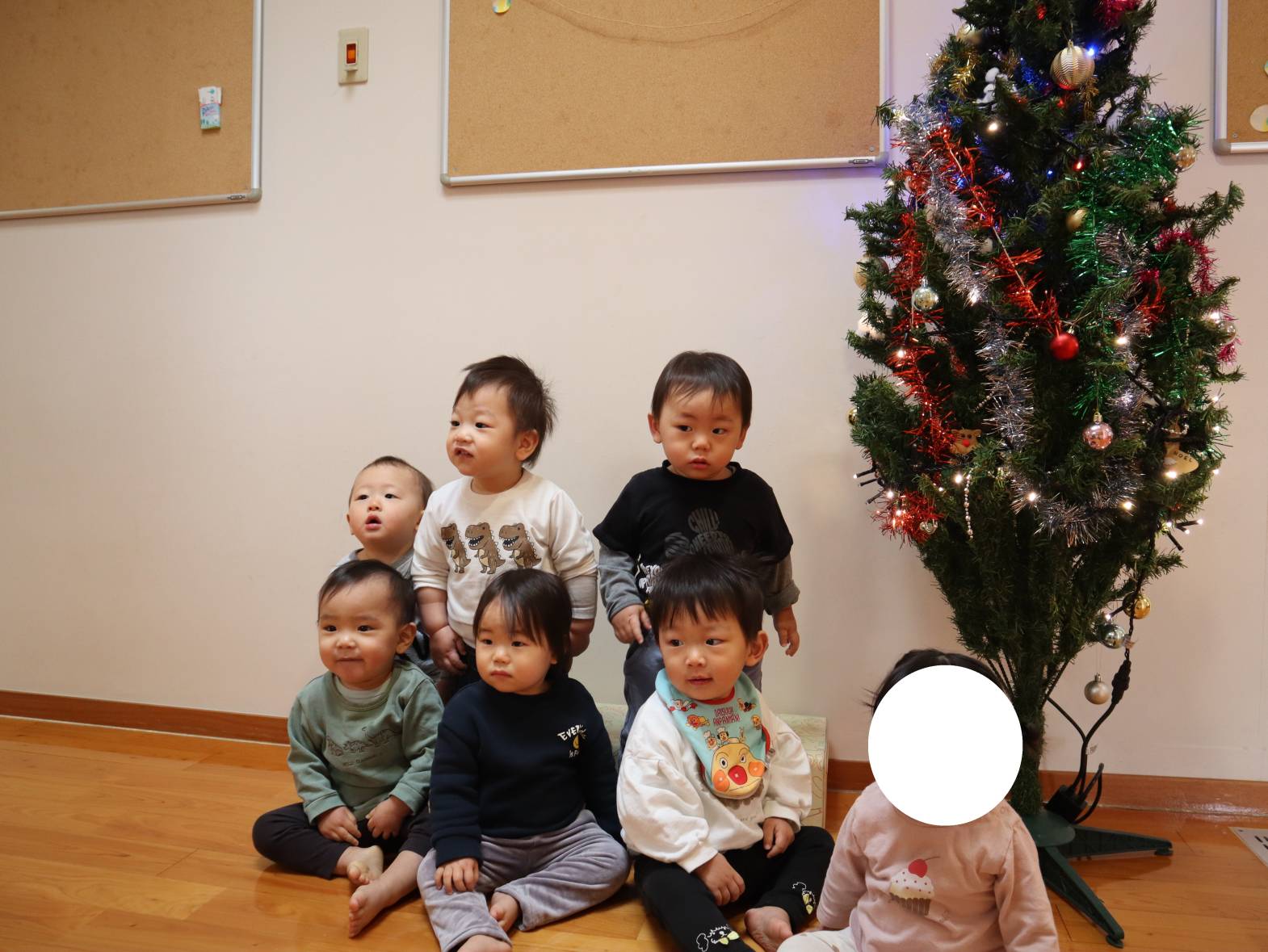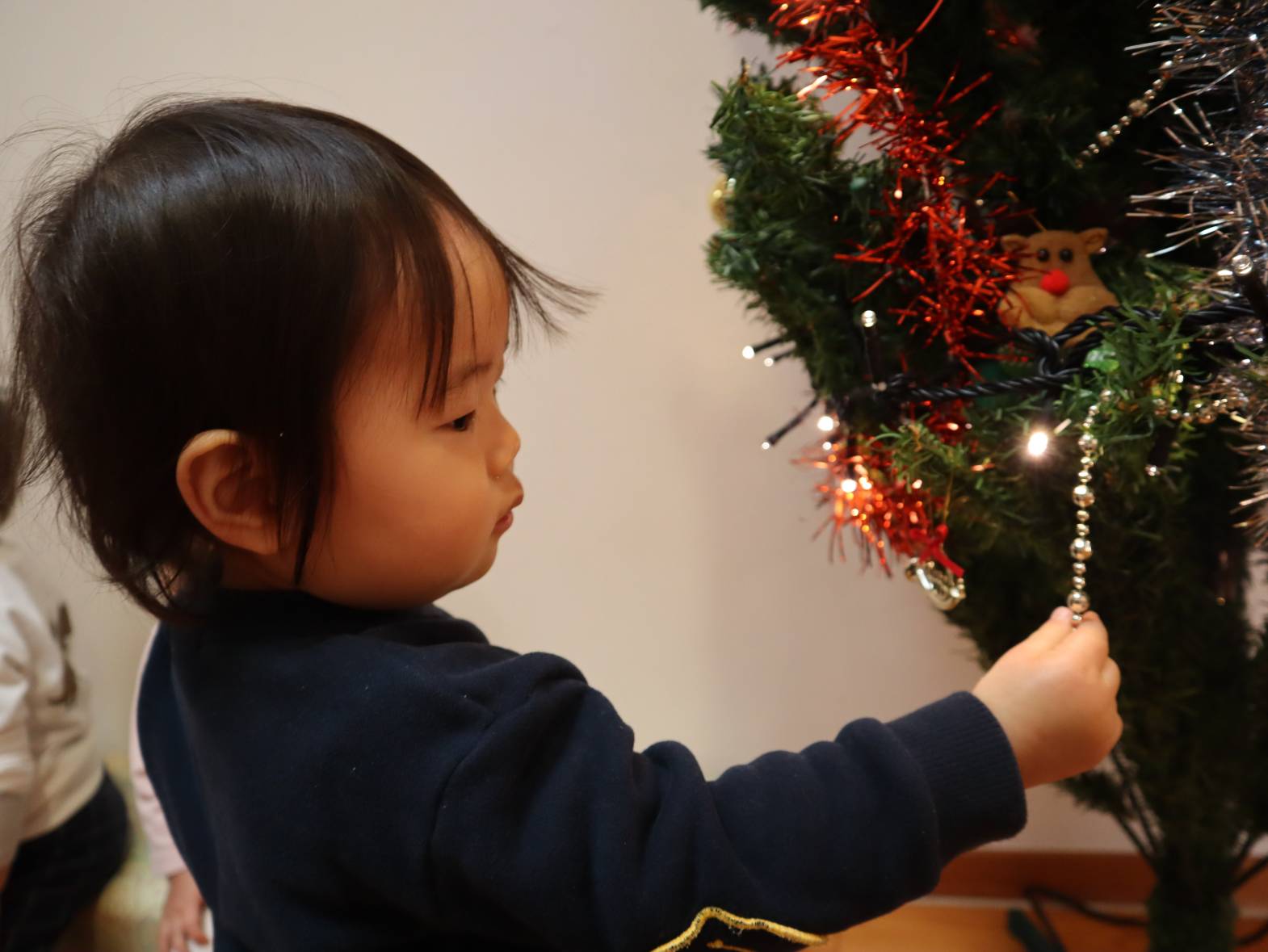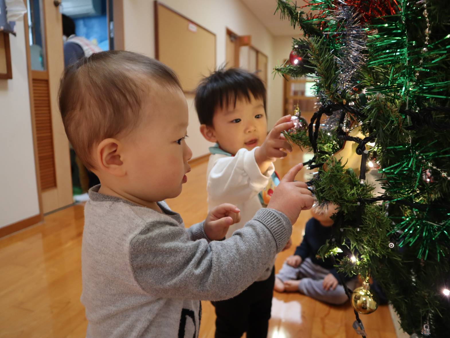 きりん組さんが飾りつけをしてくれたクリスマスツリーを見に行きました! ライトを点けた瞬間、「わあ!」、「きれーい!」と大喜びの子どもたち。 飾りにちょんと触れてみたり、ピカピカ光る電飾を近くで見つめたりと、じっくりとツリーを堪能することができました。 クリスマスの雰囲気を味わうことができたひよこ組さんです。