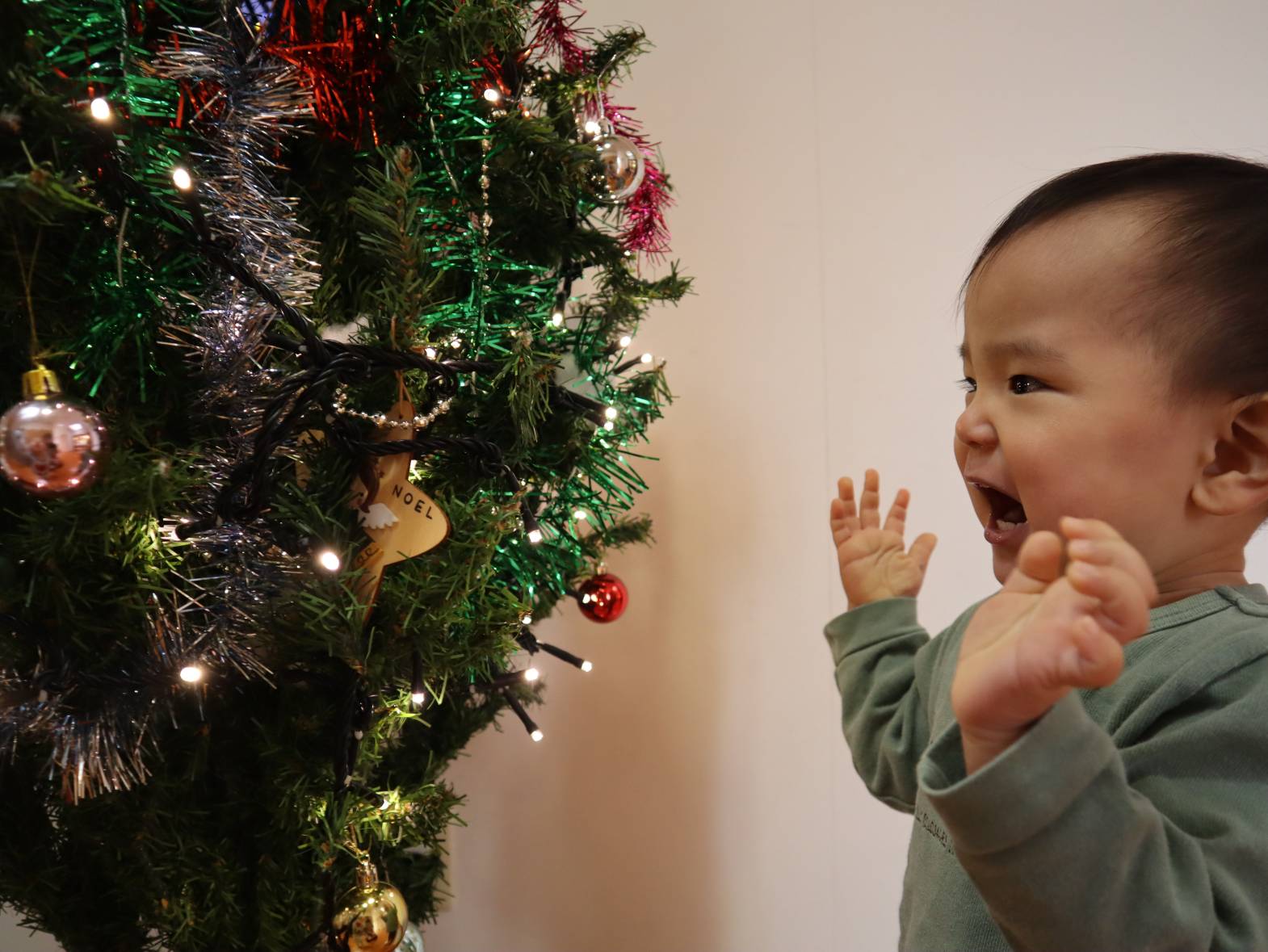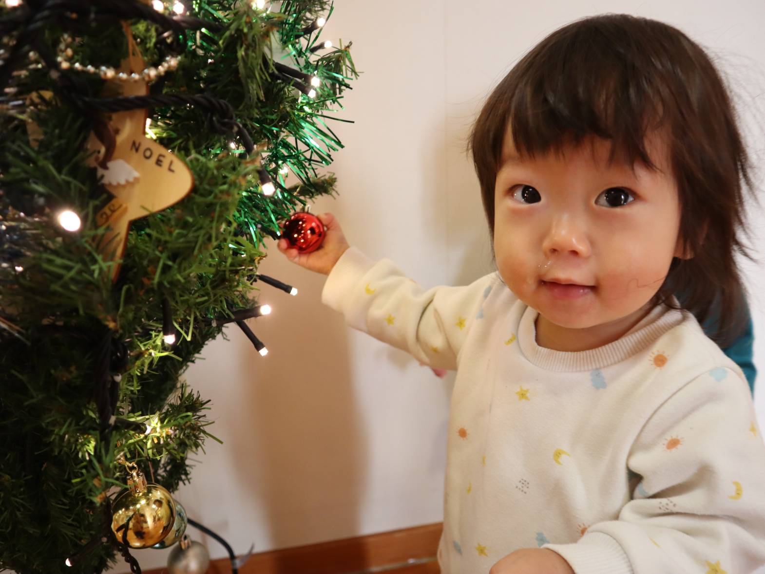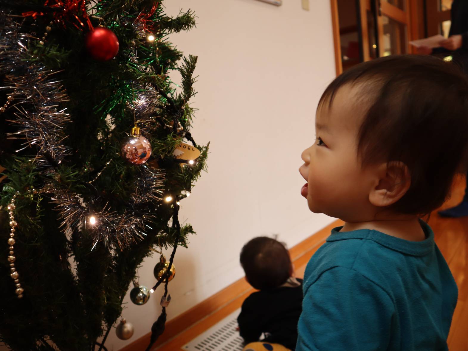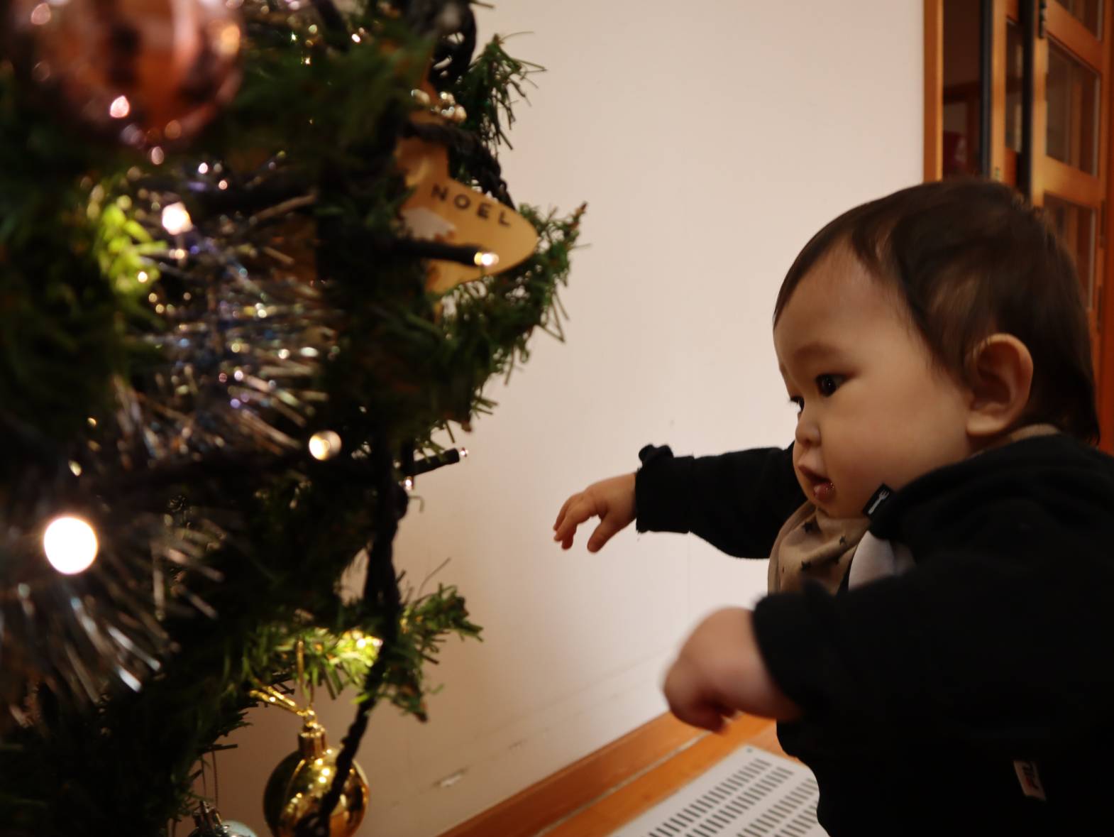 きりん組さんが飾りつけをしてくれたクリスマスツリーを見に行きました! ライトを点けた瞬間、「わあ!」、「きれーい!」と大喜びの子どもたち。 飾りにちょんと触れてみたり、ピカピカ光る電飾を近くで見つめたりと、じっくりとツリーを堪能することができました。 クリスマスの雰囲気を味わうことができたひよこ組さんです。