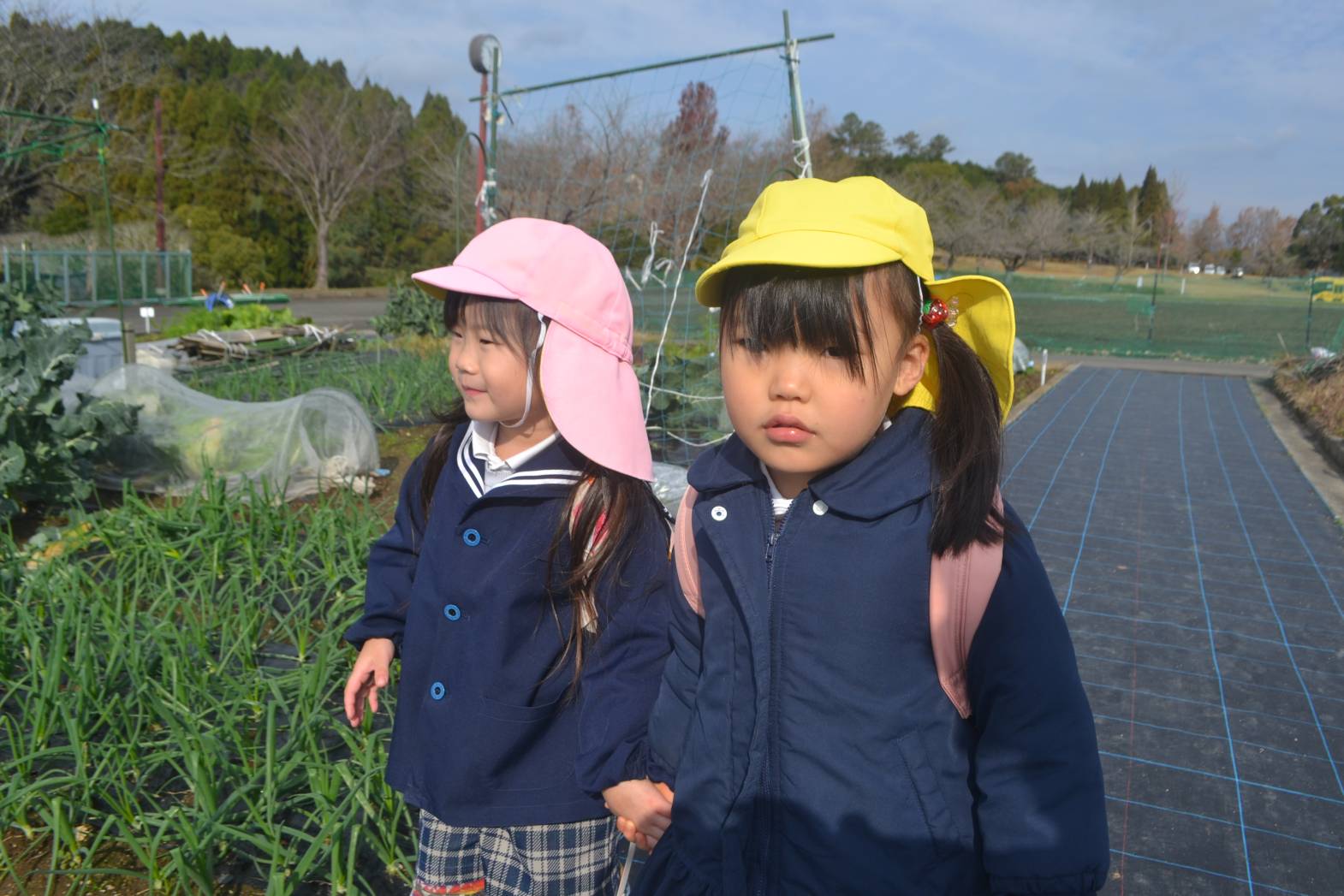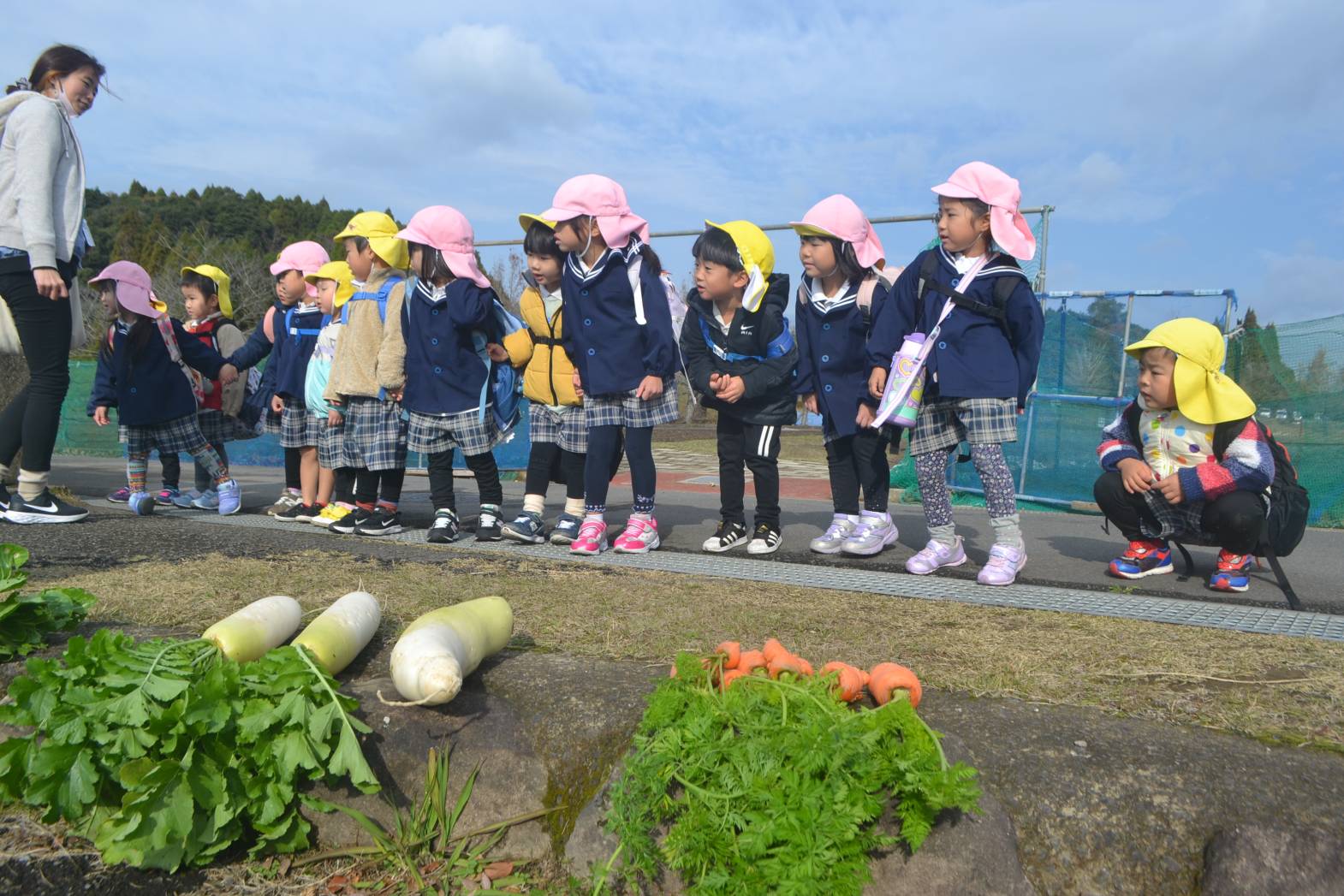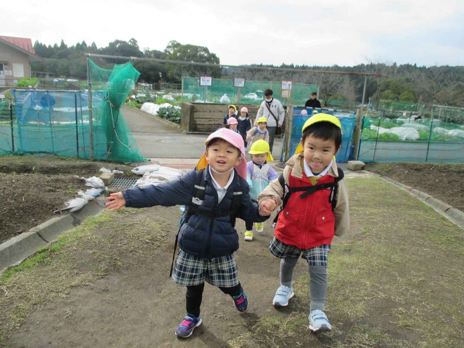 また敷地内の散策では、「見て!野菜がある。」、「こんにちは、何を作ってるんですか?」と野菜を作って入り人に声を掛けて野菜に興味を持つ姿も見られました。