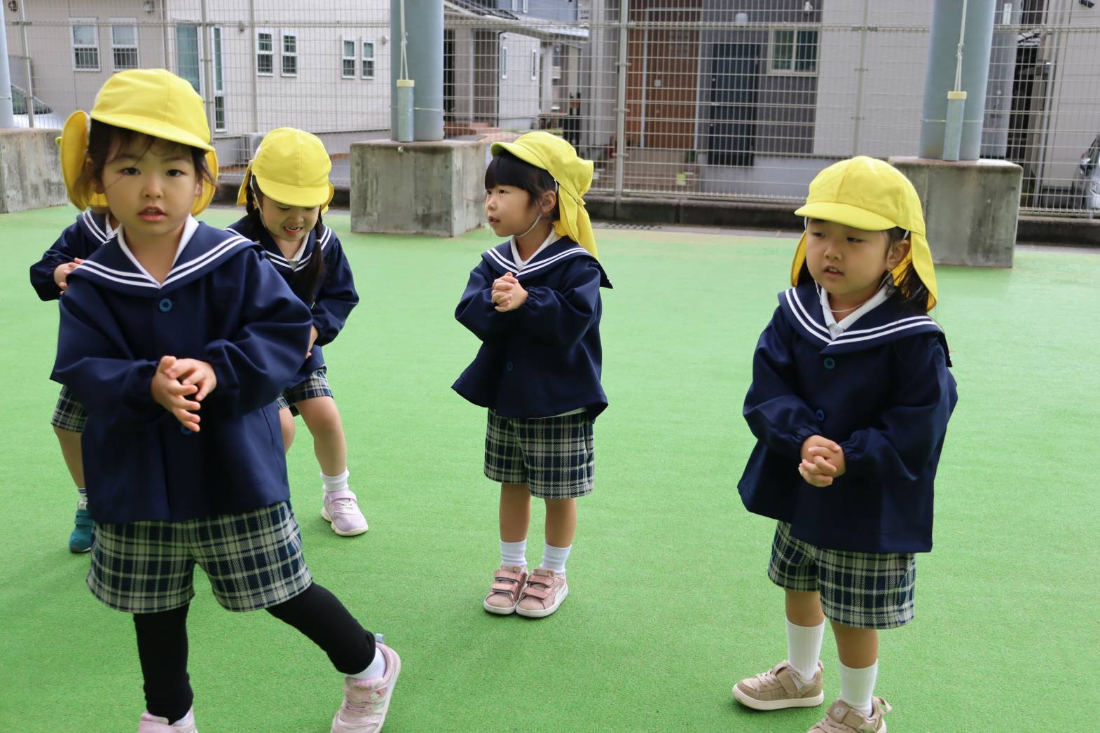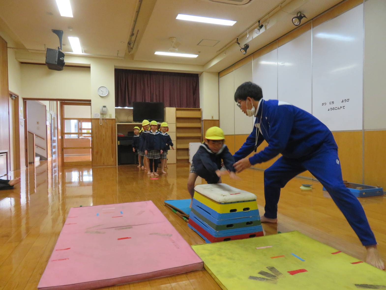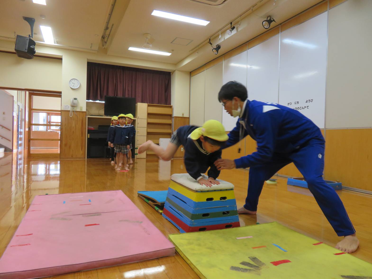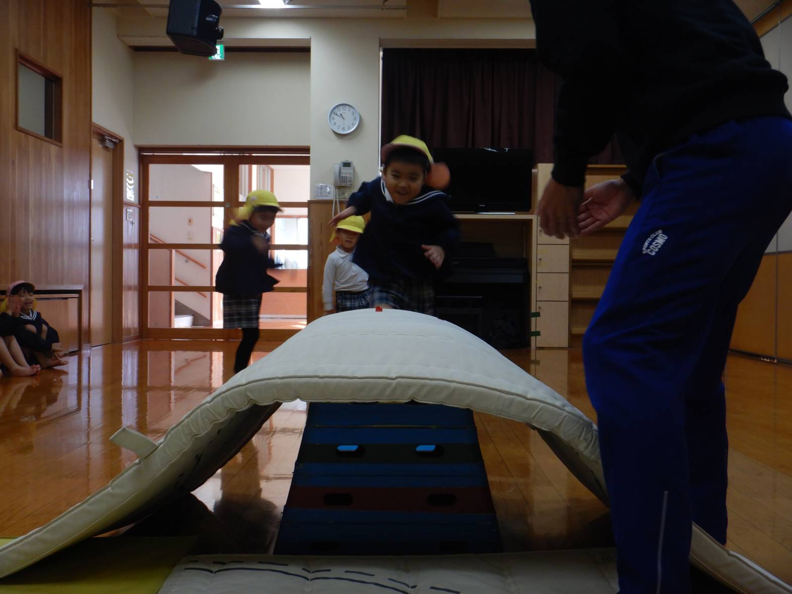 「小学校では跳び箱この向きで跳ぶんだよ。小学校のお兄ちゃんお姉ちゃんといっしょだね。」と先生から声が掛かると、「小学校のお兄ちゃんお姉ちゃんたちといっしょ!」とやる気満々最後まで挑戦するきりん組さんでした。