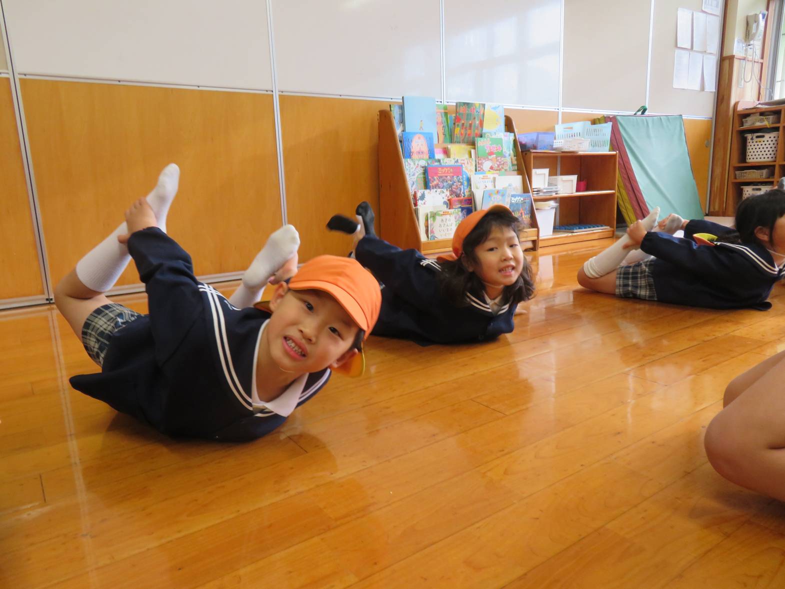 元気いっぱいに体操を行うと、足をチョキ、グーの形にして飛び込みの練習を行います。