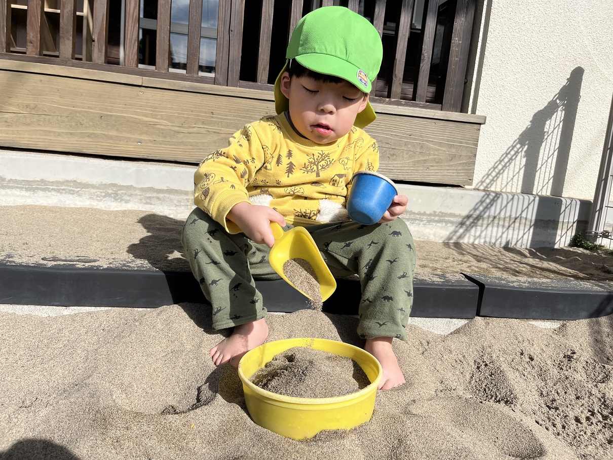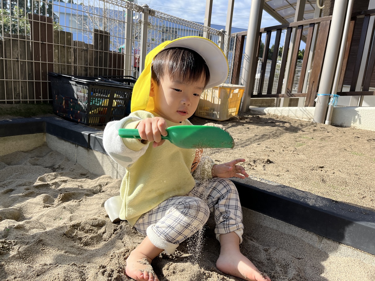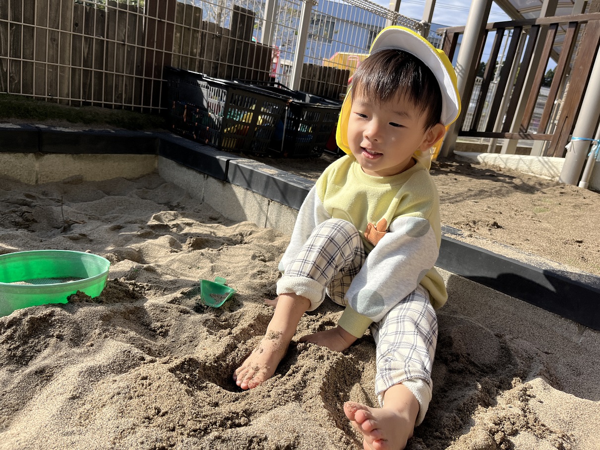 今回は、保育園の砂場をお借りして、砂遊びを行いました。 最初は、足裏に砂が付くことに抵抗のある子どももいましたが、すぐに慣れる様子が見られました。 スコップですくって、カップに詰めてケーキを作ったり、自分の足に砂をかけたりして遊ぶ子どもたち! 「気持ちいい!」、「先生にケーキ作ったよ!」と言う声も聞かれました☆ たくさん手足で砂の感触を味わうことができ、笑顔いっぱいのいぬグループさんでした!