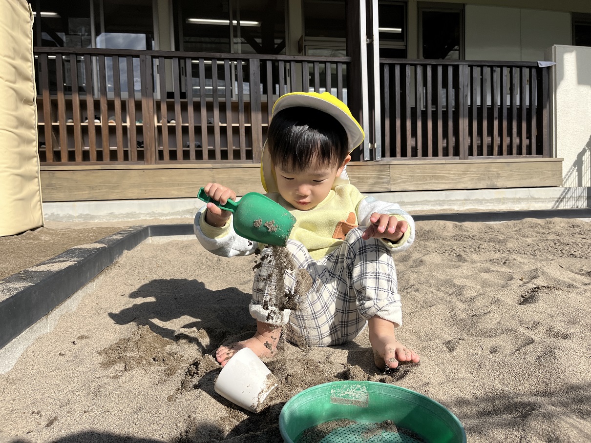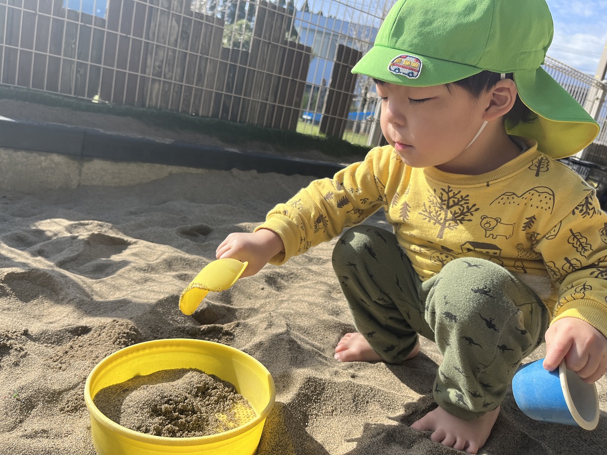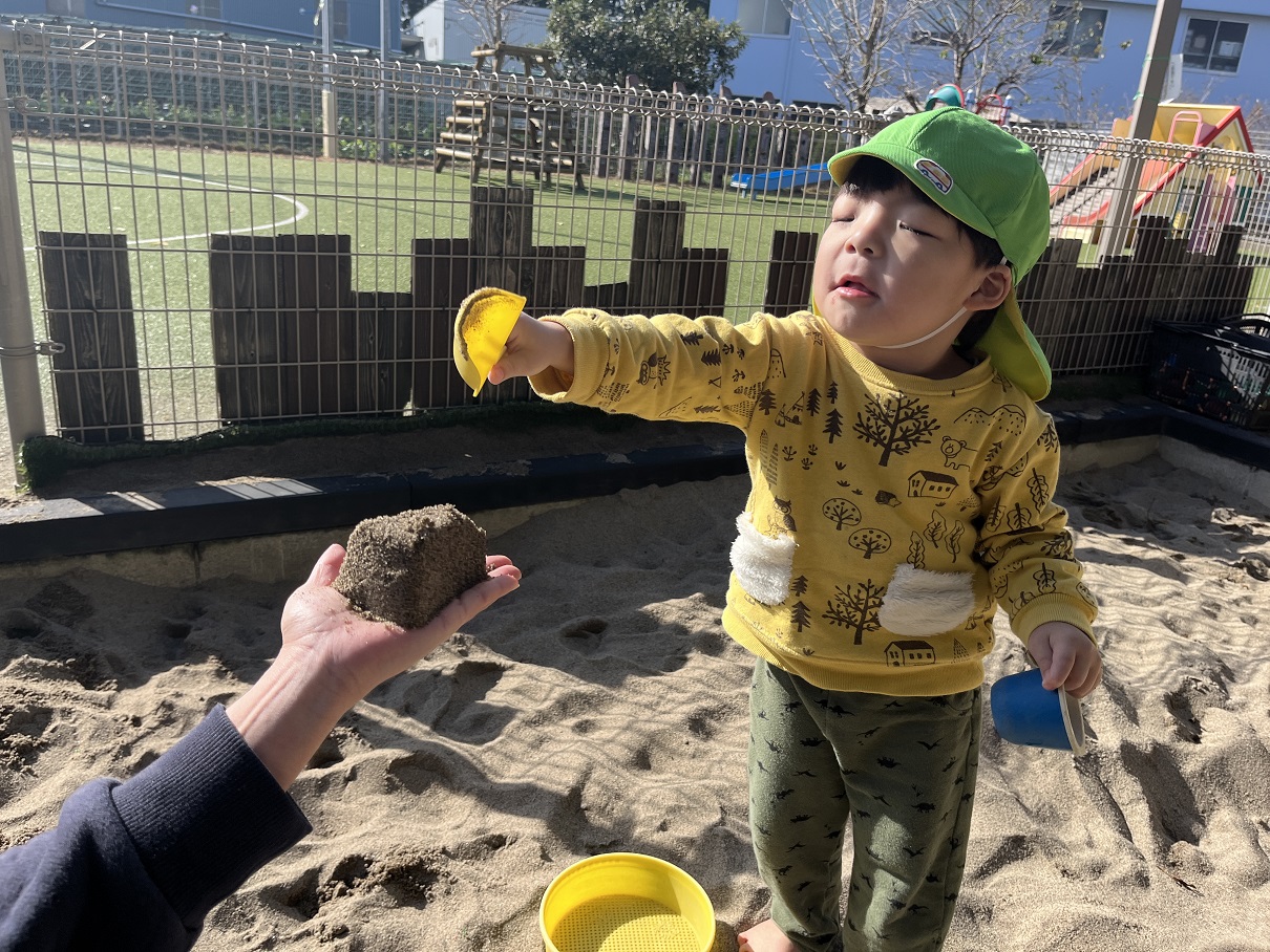 今回は、保育園の砂場をお借りして、砂遊びを行いました。 最初は、足裏に砂が付くことに抵抗のある子どももいましたが、すぐに慣れる様子が見られました。 スコップですくって、カップに詰めてケーキを作ったり、自分の足に砂をかけたりして遊ぶ子どもたち! 「気持ちいい!」、「先生にケーキ作ったよ!」と言う声も聞かれました☆ たくさん手足で砂の感触を味わうことができ、笑顔いっぱいのいぬグループさんでした!