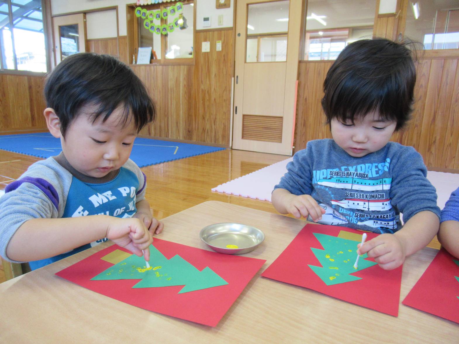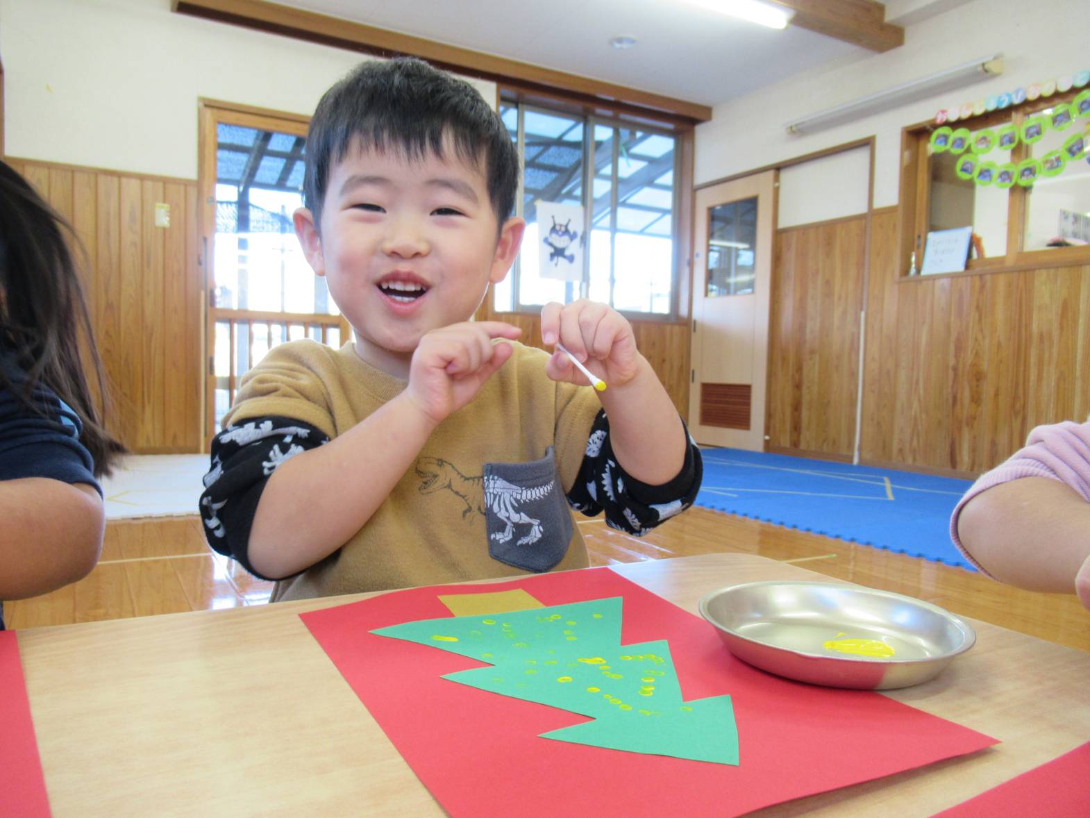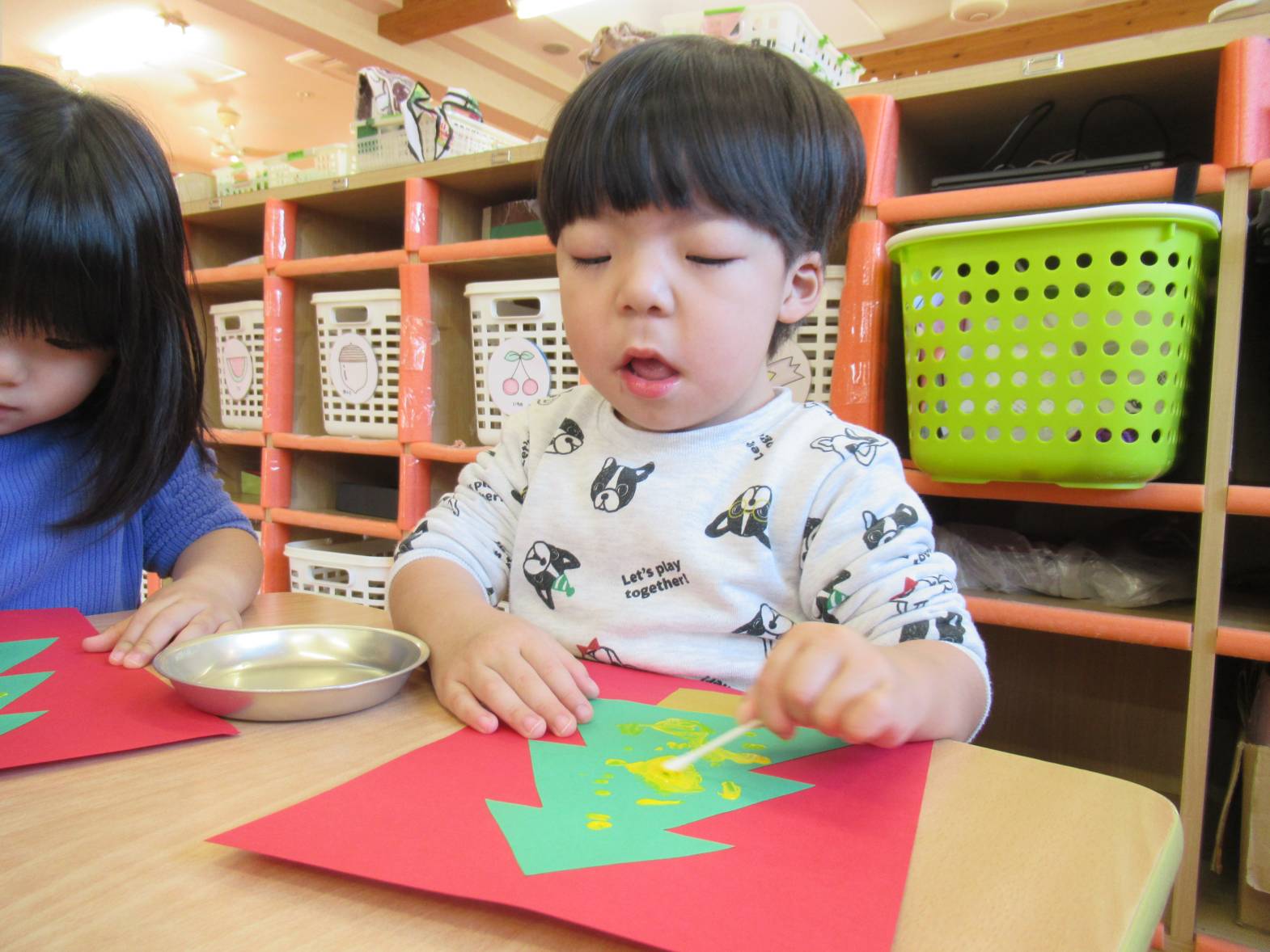 もうすぐクリスマスということでクリスマスツリー製作をしました。 綿棒に絵の具を付け、ツリーに模様を付けていく子どもたち。 「丸がいっぱい!」と綿棒で付いた模様に面白さを感じる姿が見られました。 最後にシールでデコレーションをして、サンタをぶら下げて完成! 「サンタさん来るかな~?」とクリスマスを楽しみにしているぱんだ組さんでした!