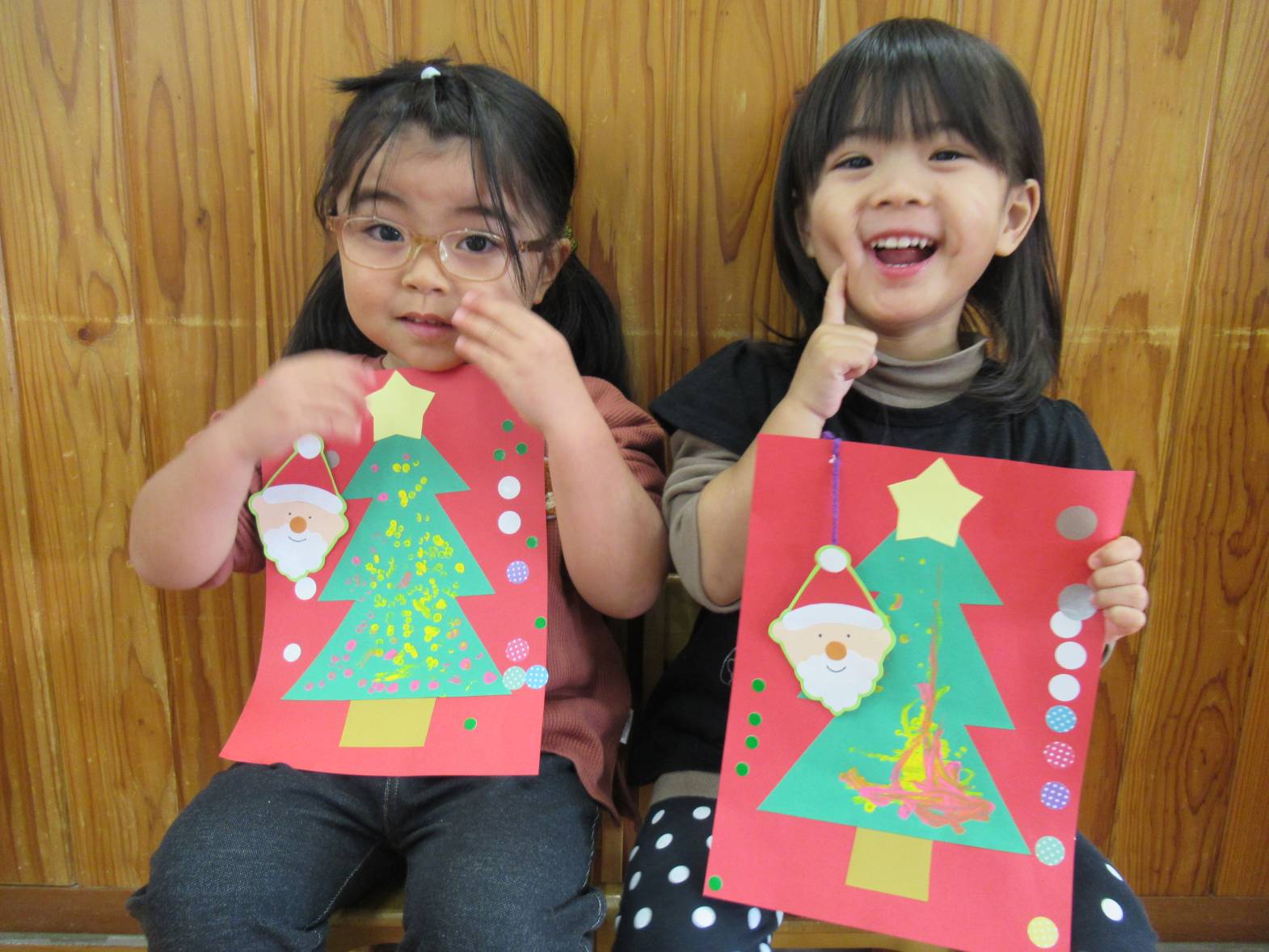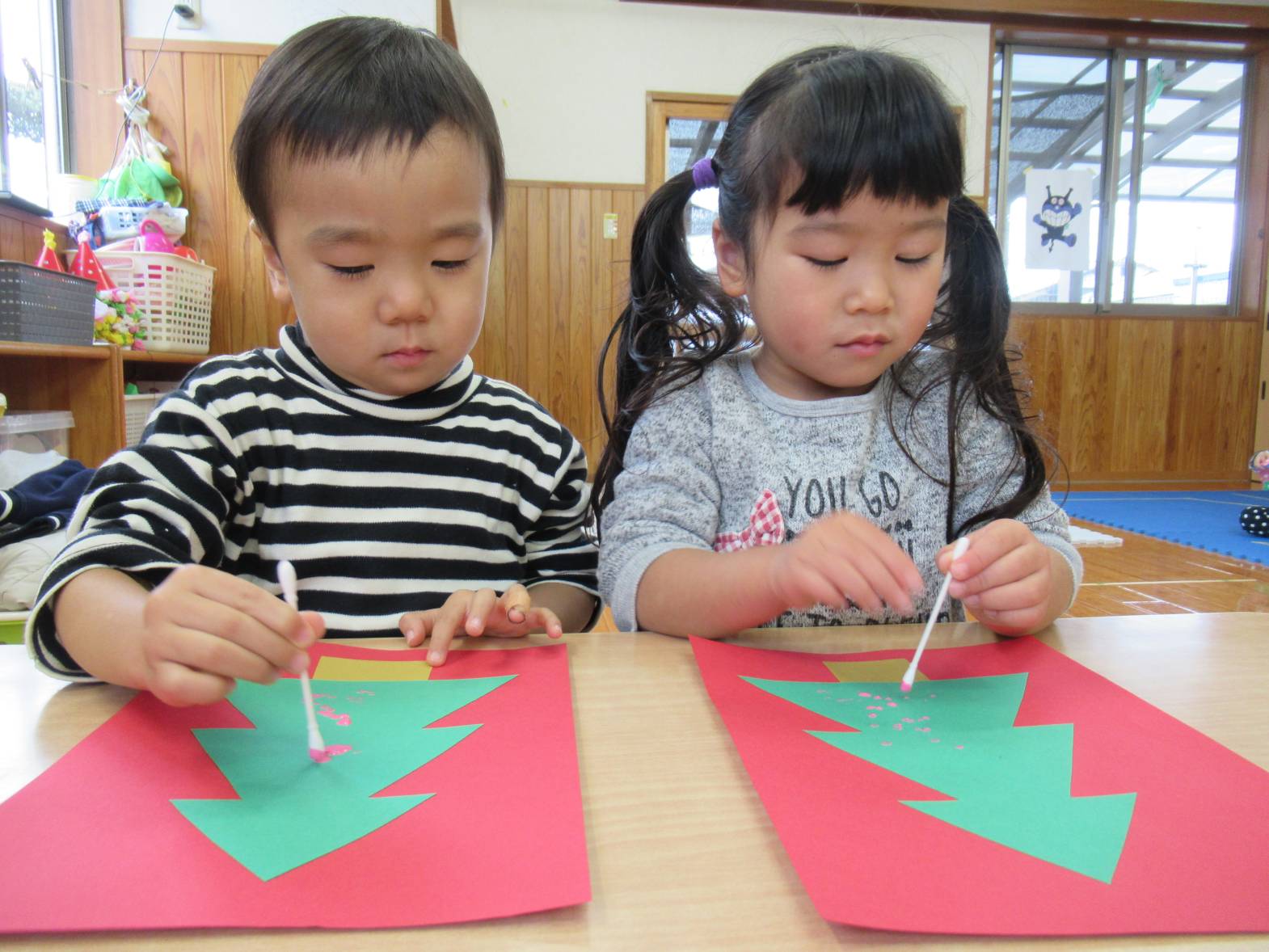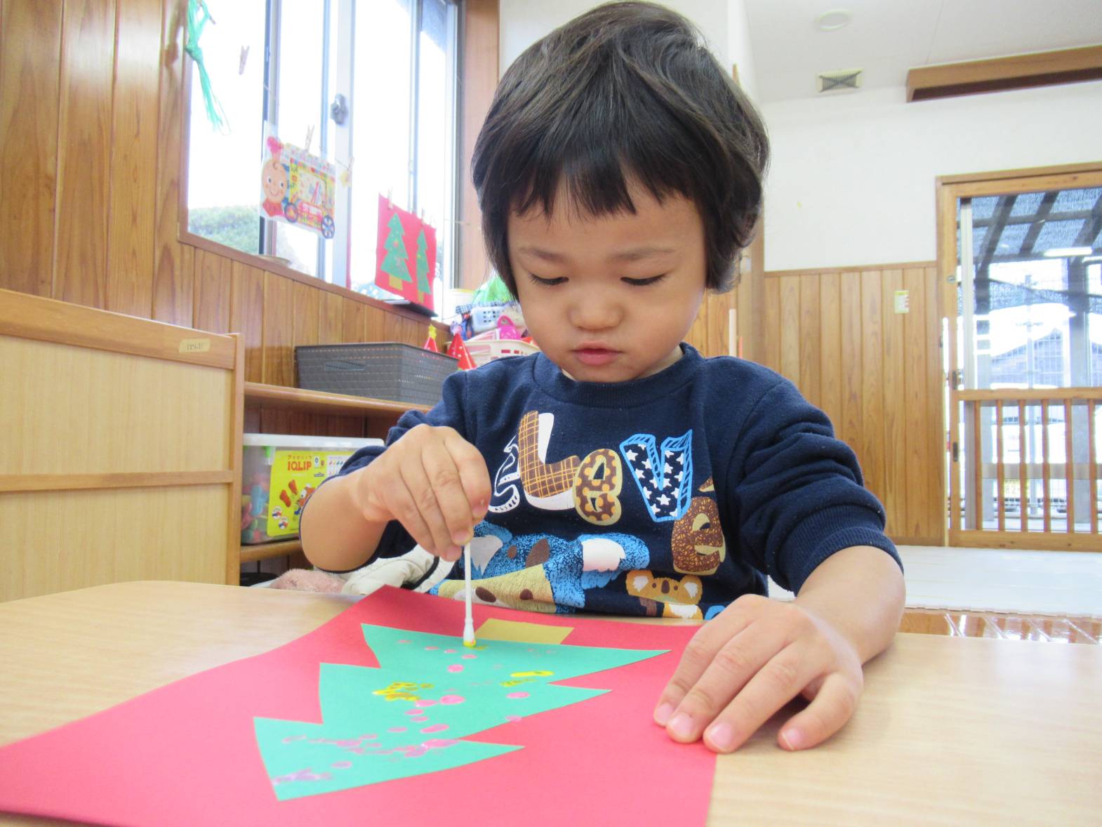 もうすぐクリスマスということでクリスマスツリー製作をしました。 綿棒に絵の具を付け、ツリーに模様を付けていく子どもたち。 「丸がいっぱい!」と綿棒で付いた模様に面白さを感じる姿が見られました。 最後にシールでデコレーションをして、サンタをぶら下げて完成! 「サンタさん来るかな~?」とクリスマスを楽しみにしているぱんだ組さんでした!