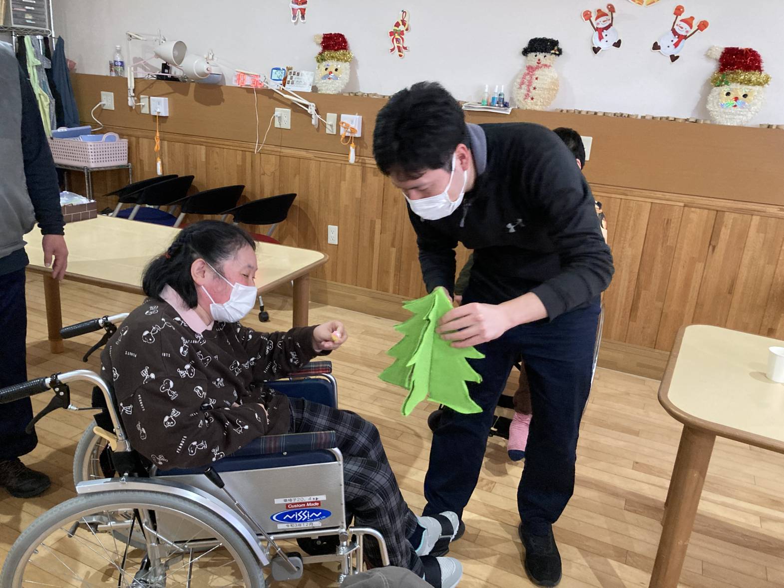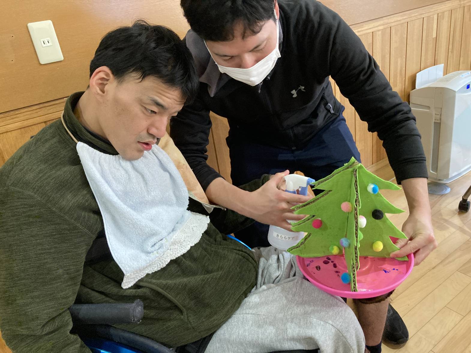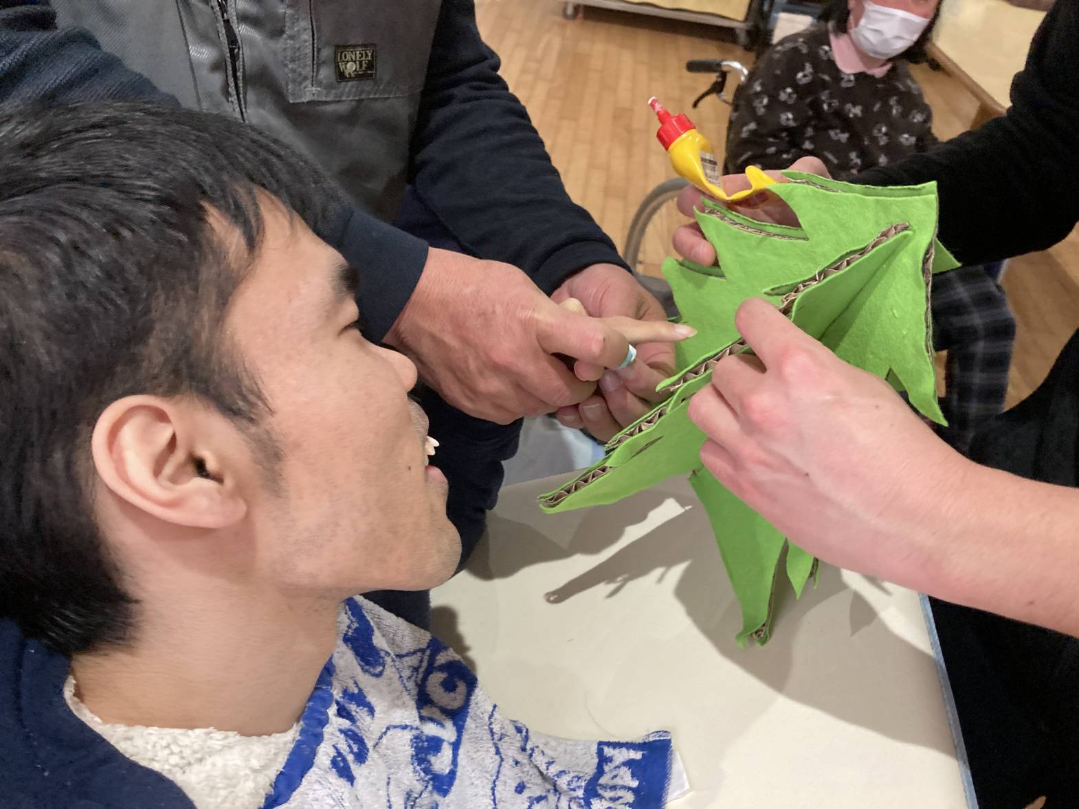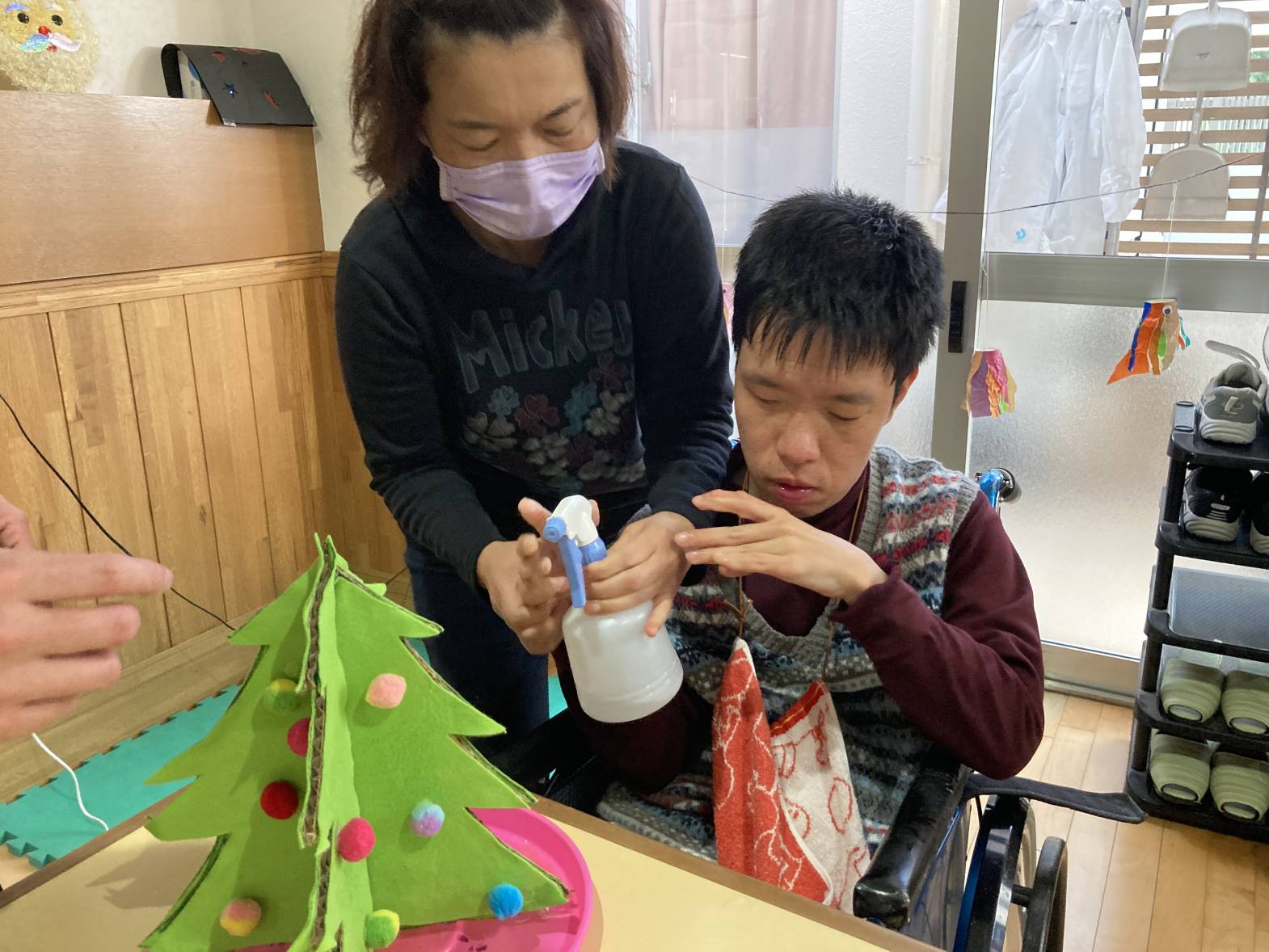 まずはクリスマスツリーにポンポンを付けて飾りつけを行いました。