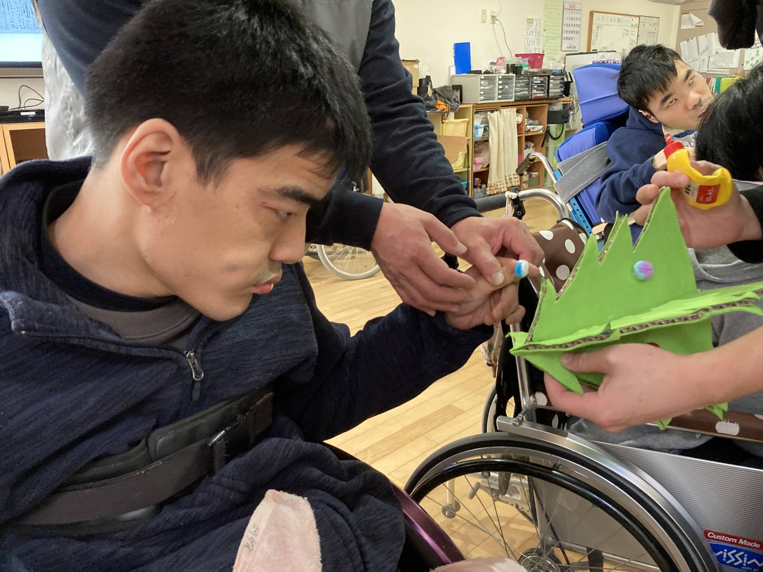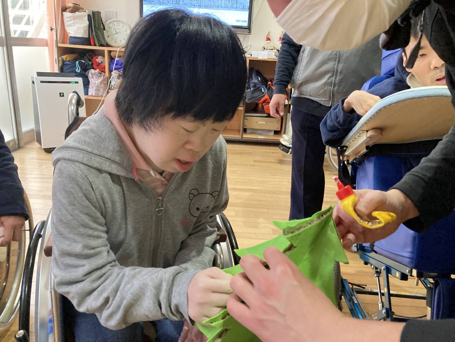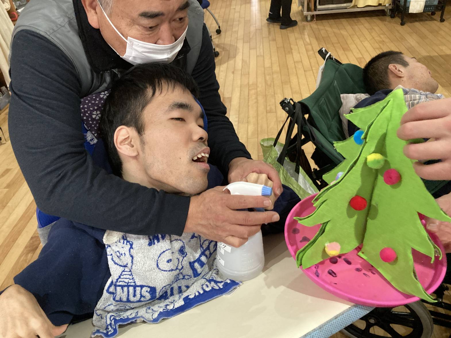 まずはクリスマスツリーにポンポンを付けて飾りつけを行いました。