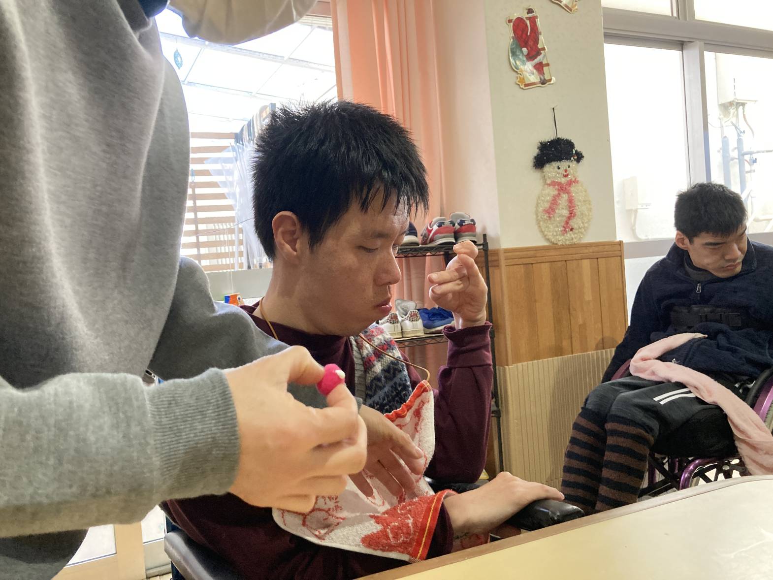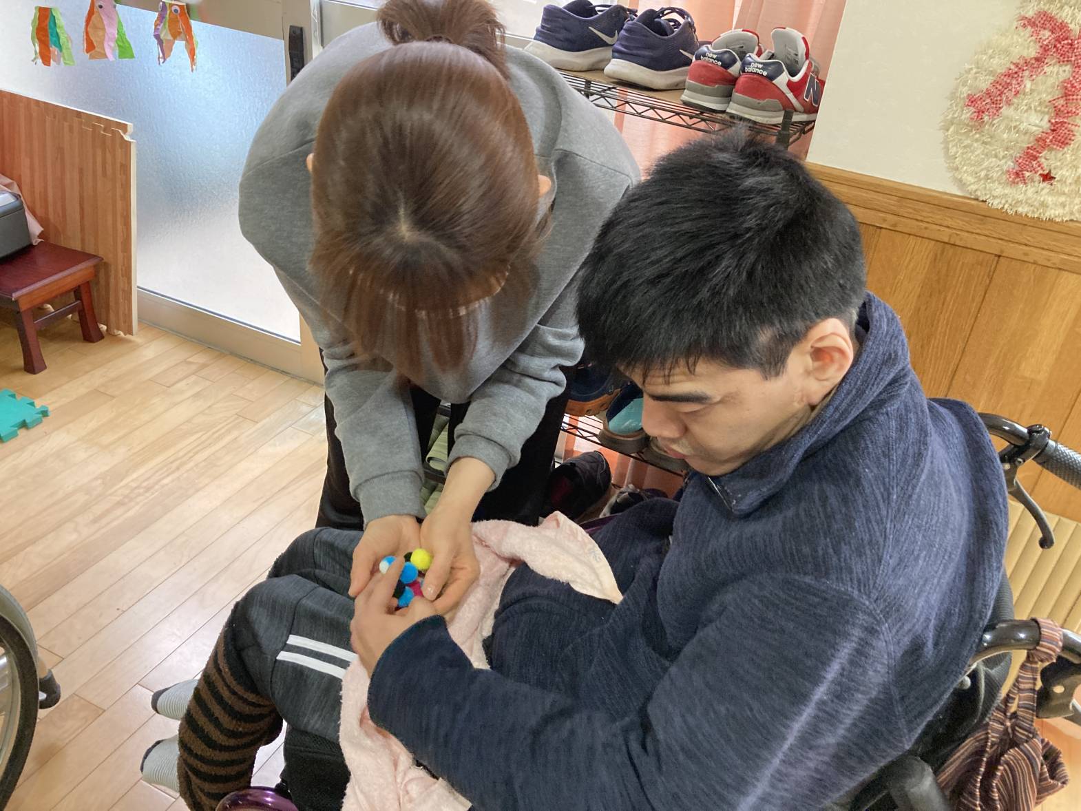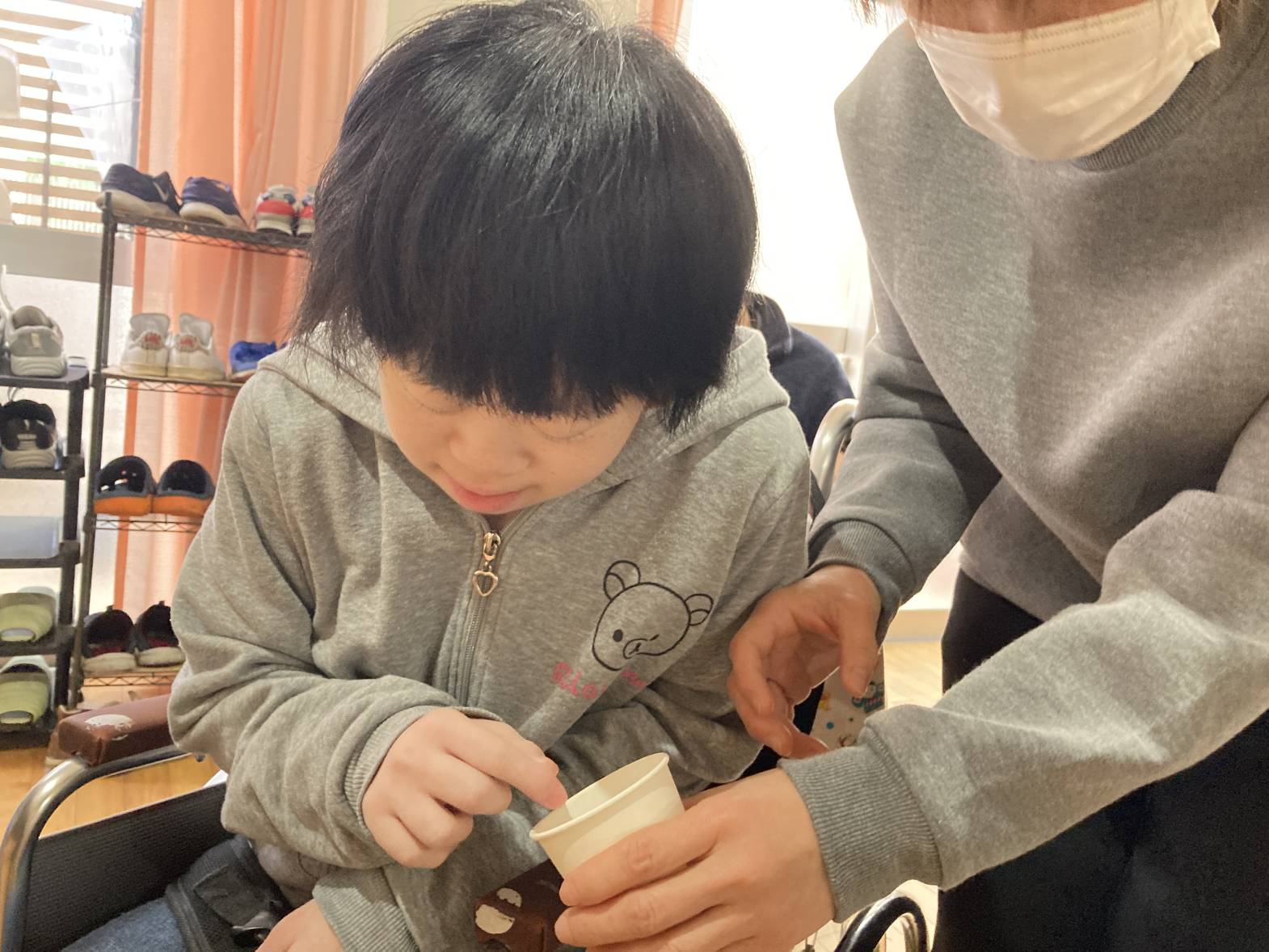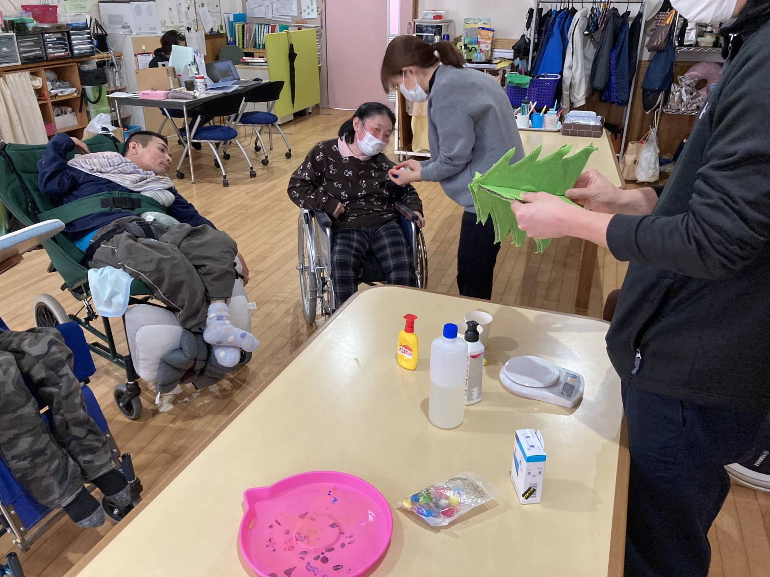 まずはクリスマスツリーにポンポンを付けて飾りつけを行いました。