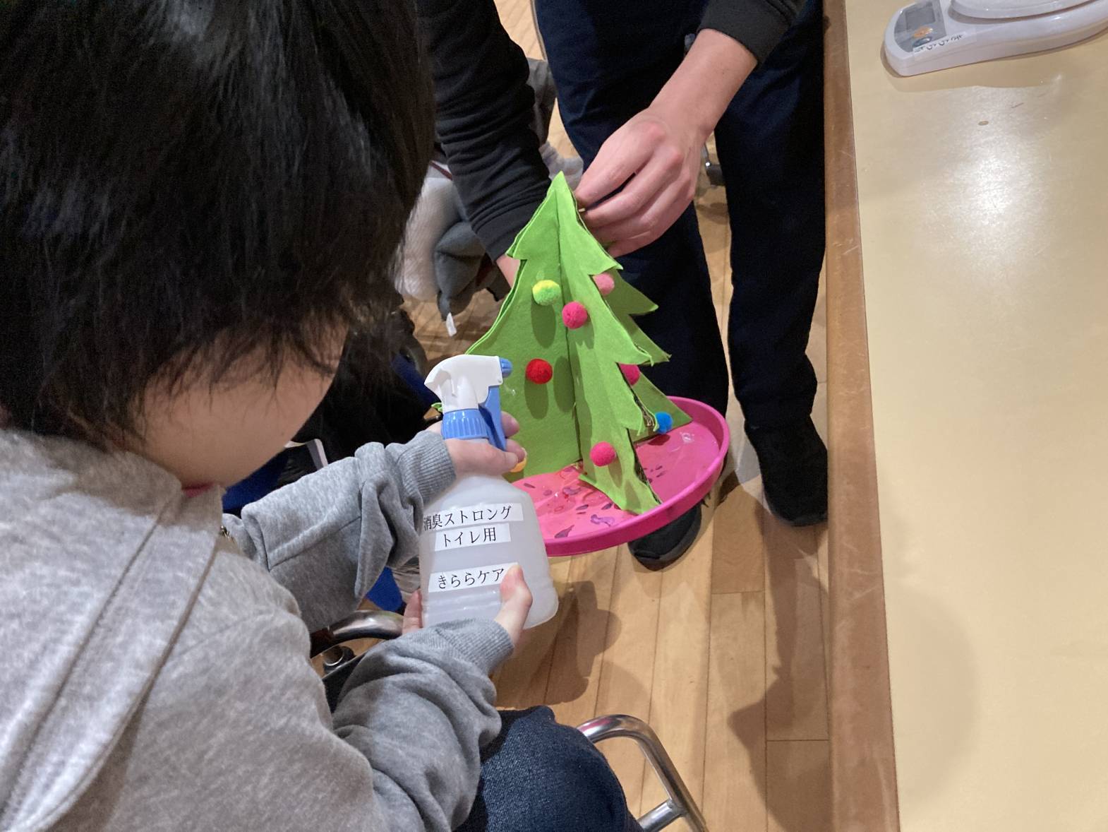 最後は、雪の結晶の素が入ったスプレーをツリーに吹きかけます。