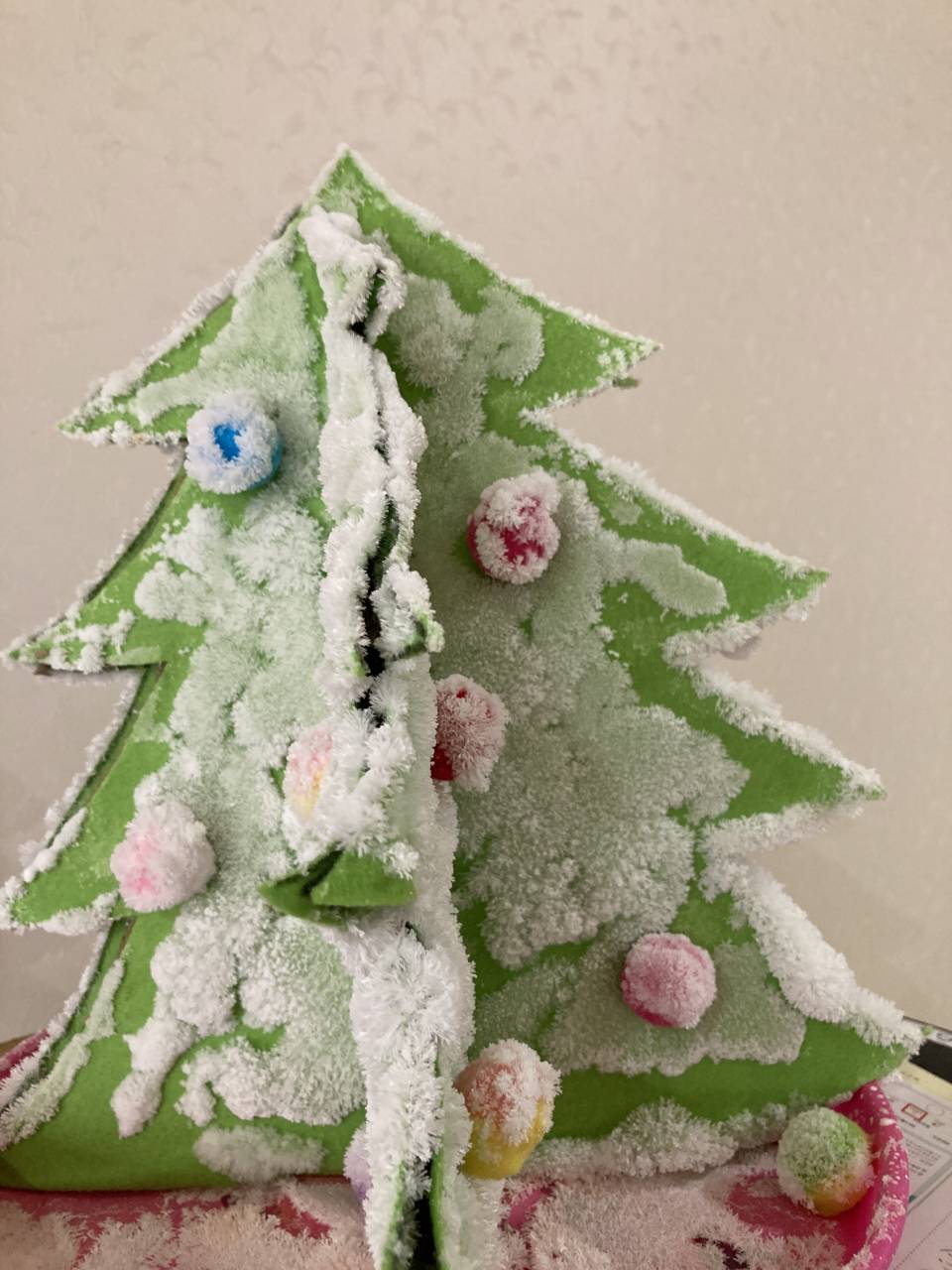 色々な模様のポンポンをツリーに飾り付け、素敵なツリーが出来上がりました。