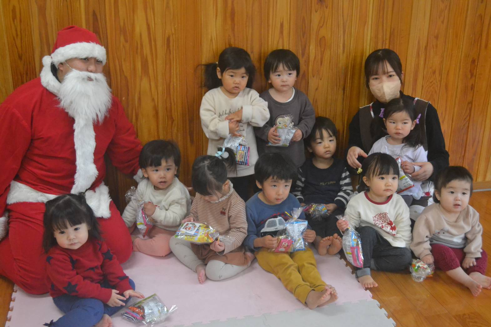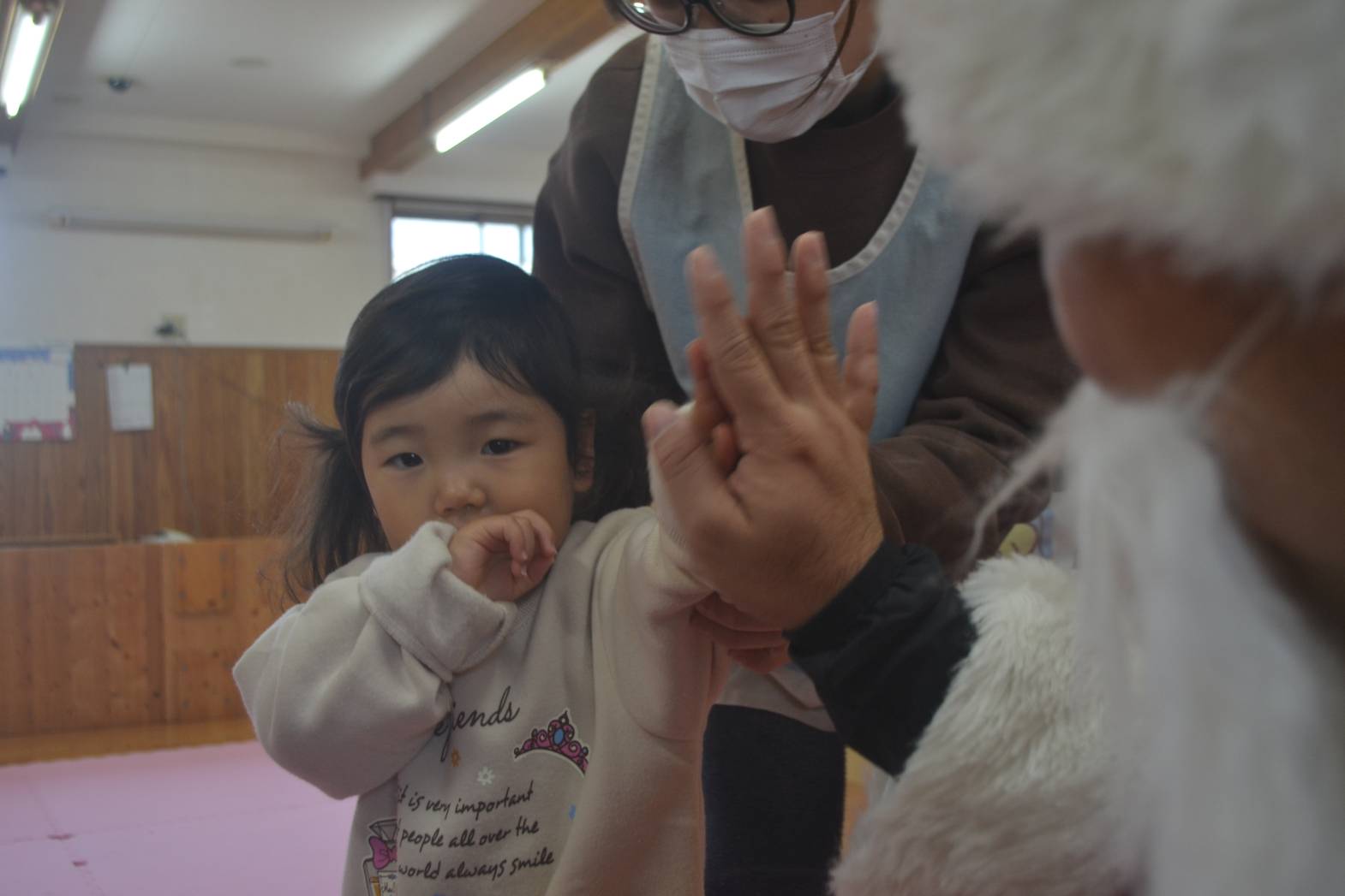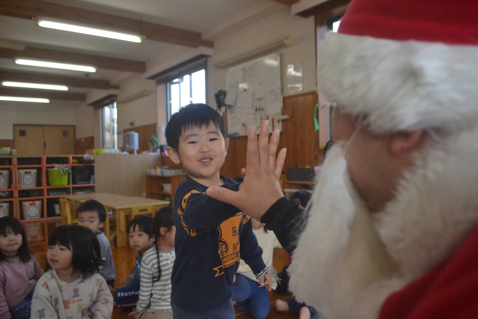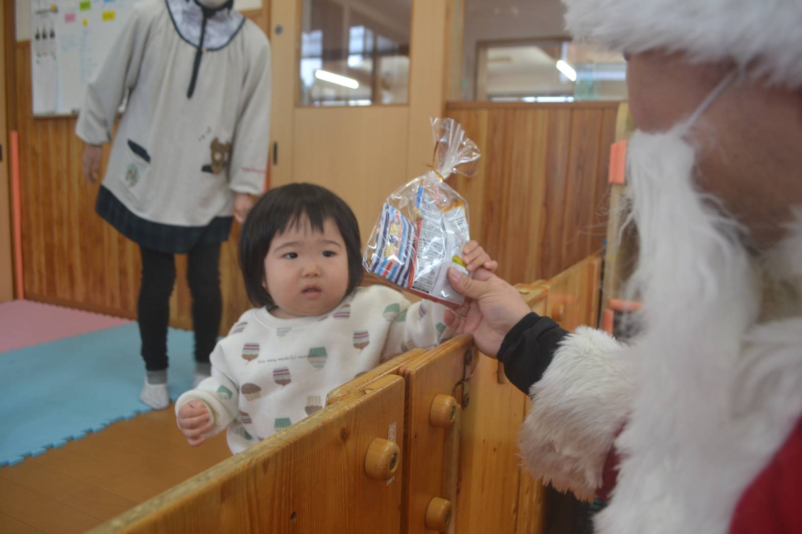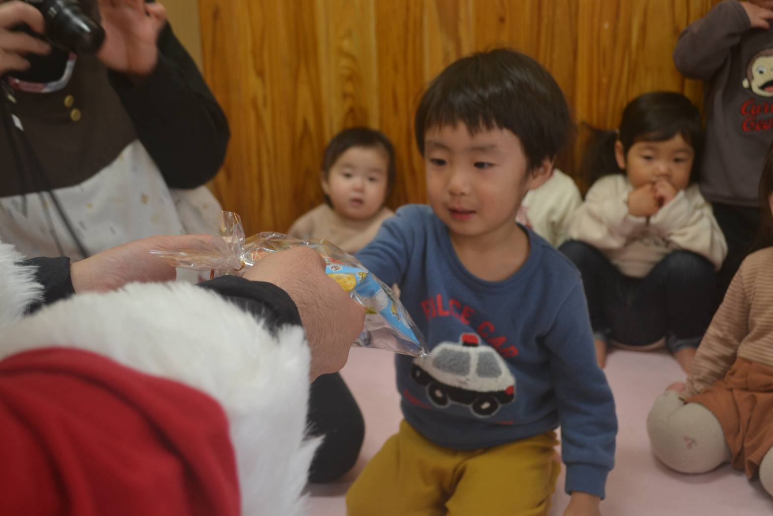小さい組さんは、サンタに少し驚く様子もありましたが、「こんにちは!」と元気に挨拶をしたり、プレゼントをもらって笑顔になったりする様子が見られました。