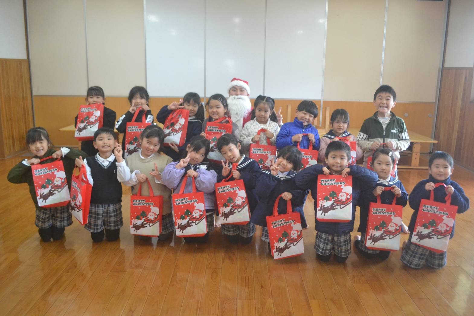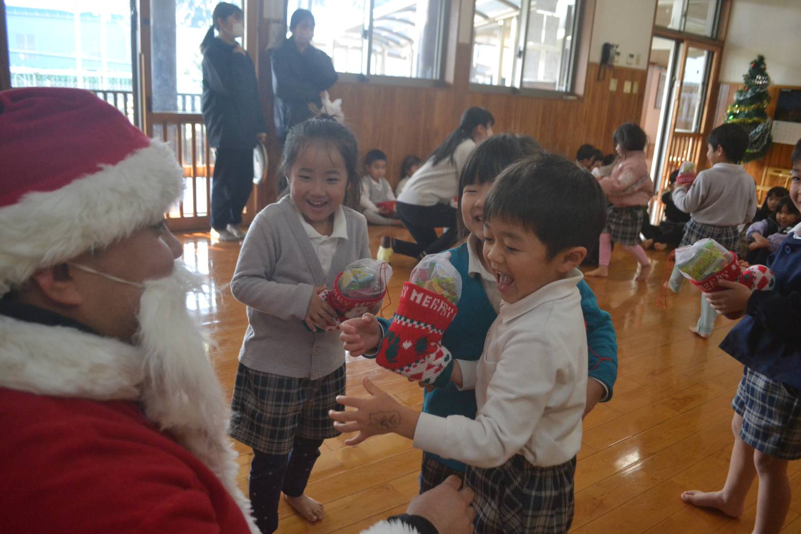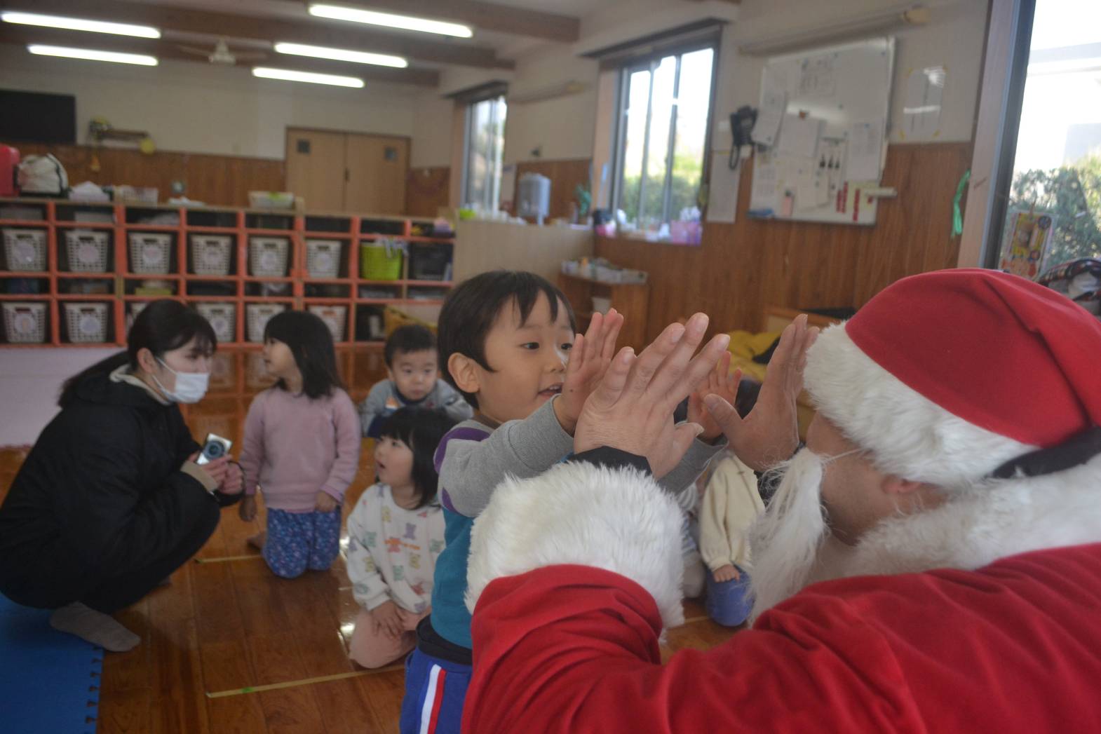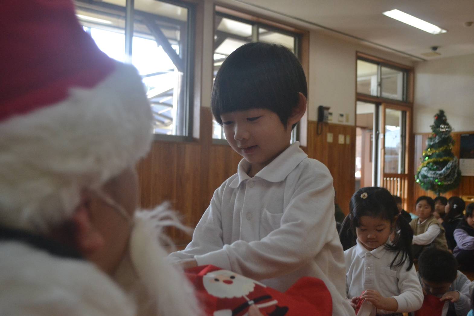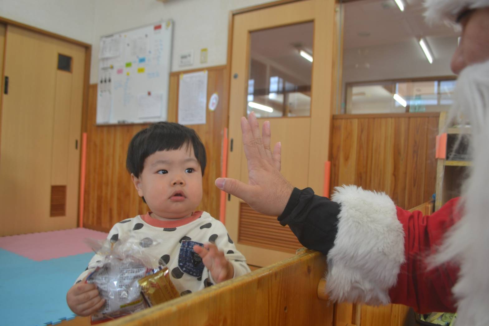 小さい組さんは、サンタに少し驚く様子もありましたが、「こんにちは!」と元気に挨拶をしたり、プレゼントをもらって笑顔になったりする様子が見られました。