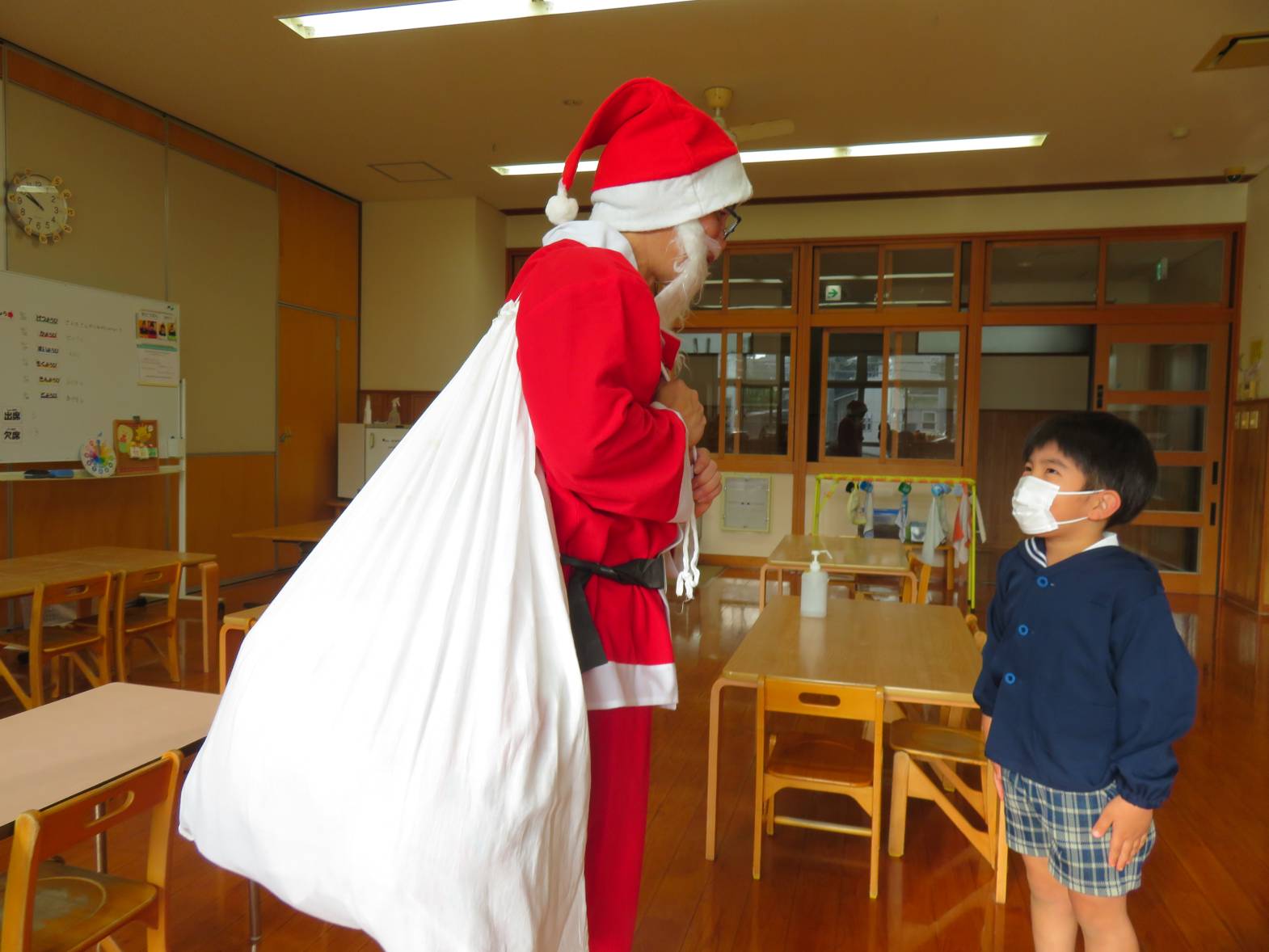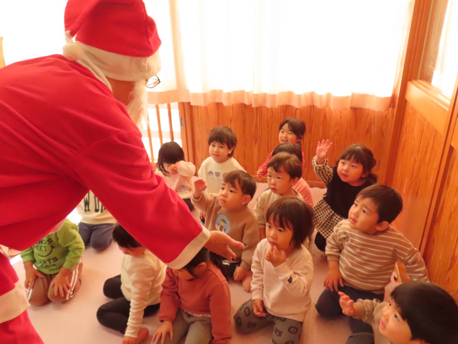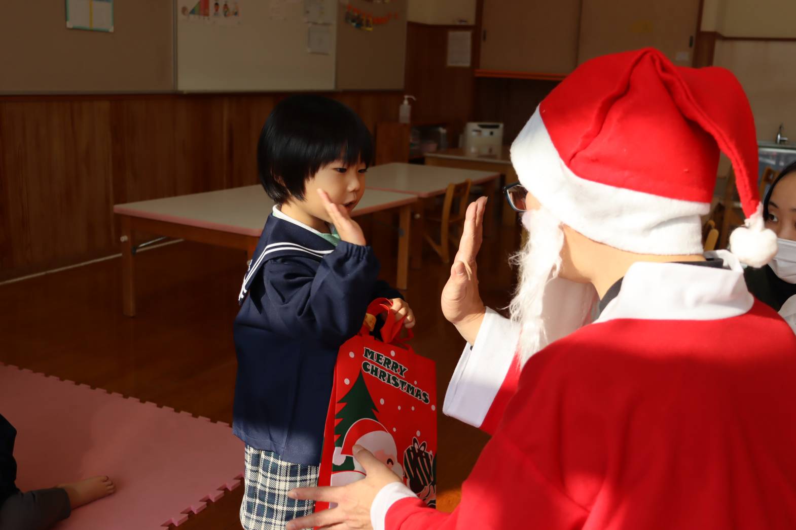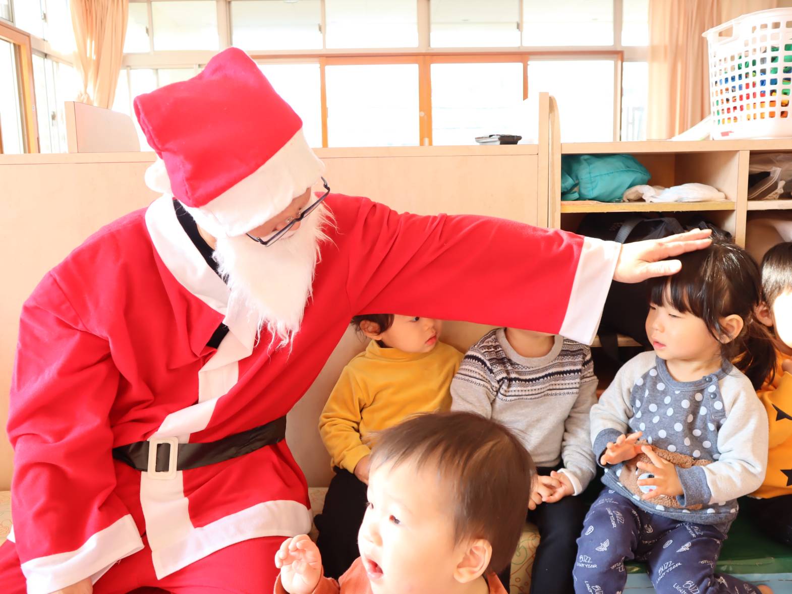 子どもたちが待ちに待ったクリスマス! 今日は、ひろき保育園にもサンタさんが来てくれました。 小さい組さんはサンタさんの姿に少し驚きつつも、タッチしたり、手を振ったりと 触れ合うことができました。 大きい組さんでは、「好きな色は何ですか?」「トナカイさんは今日はどこにいますか?」 等とハキハキと質問することができました。 一人ひとりプレゼントを貰い、嬉しそうな表情を見せる子どもたち。 最後はサンタさんと一緒に写真を撮りました。