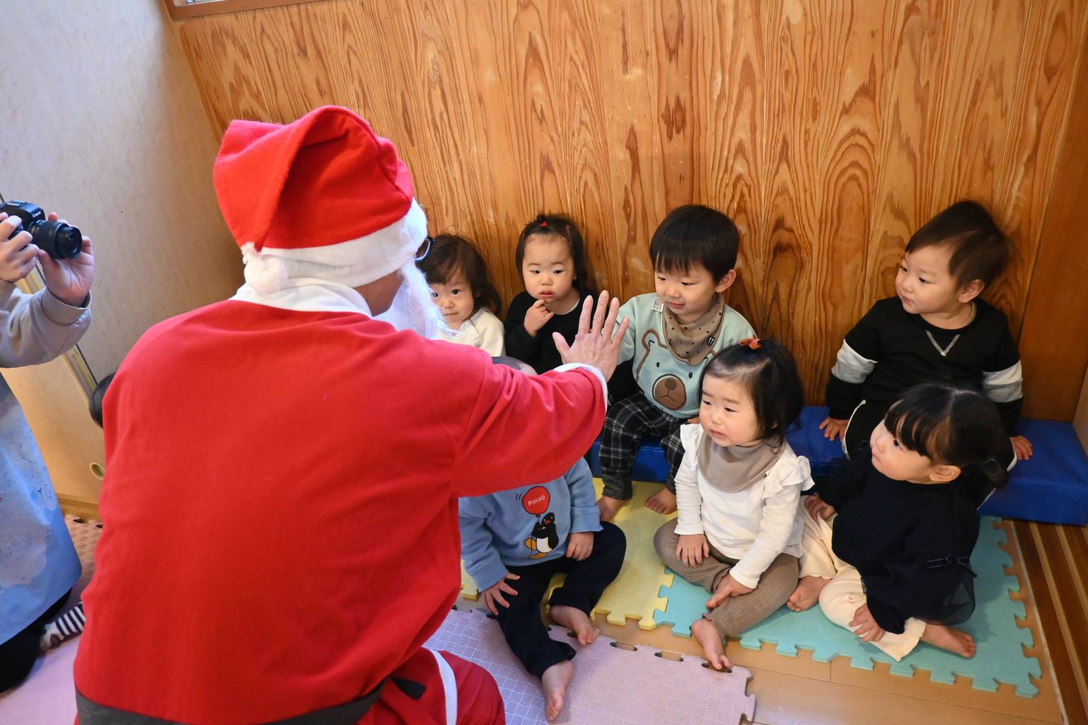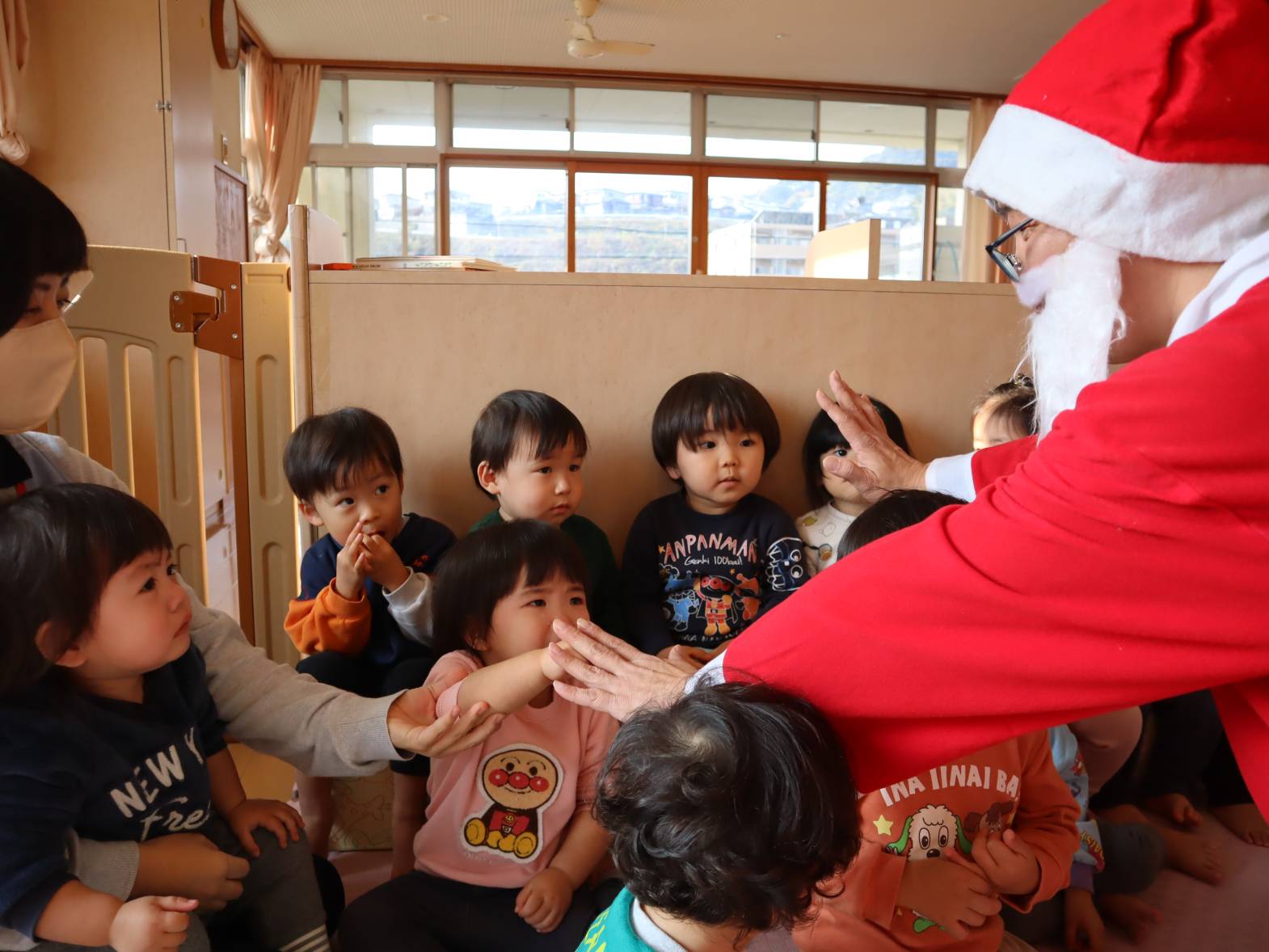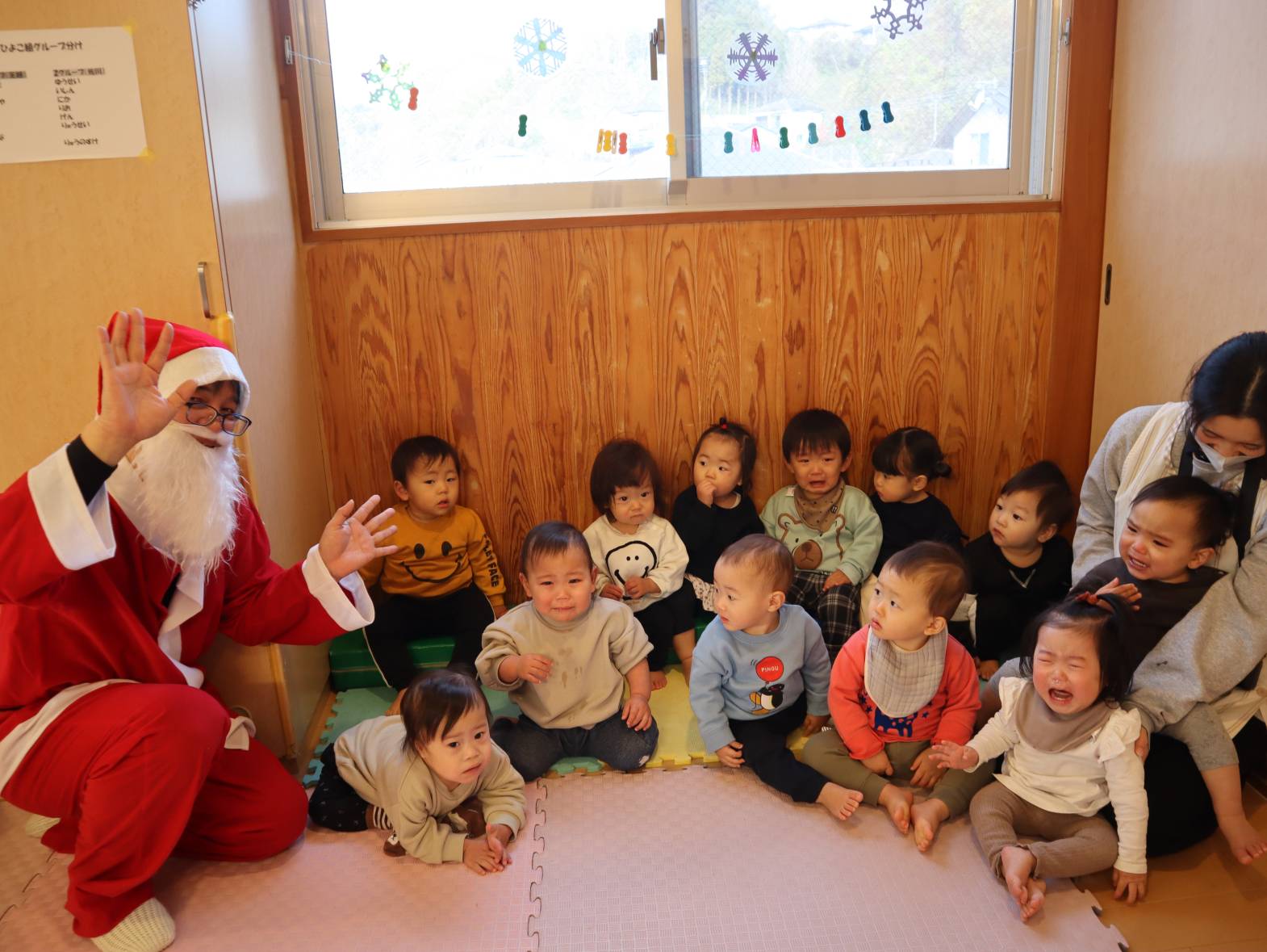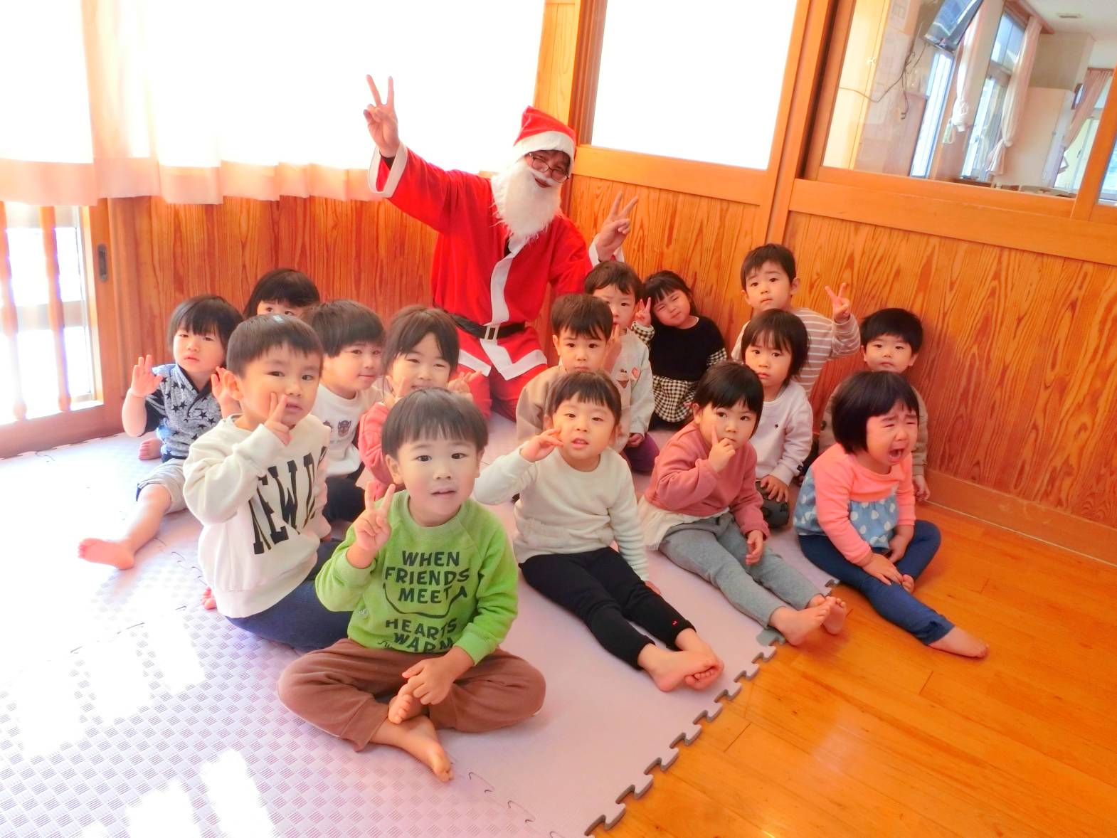 子どもたちが待ちに待ったクリスマス! 今日は、ひろき保育園にもサンタさんが来てくれました。 小さい組さんはサンタさんの姿に少し驚きつつも、タッチしたり、手を振ったりと 触れ合うことができました。 大きい組さんでは、「好きな色は何ですか?」「トナカイさんは今日はどこにいますか?」 等とハキハキと質問することができました。 一人ひとりプレゼントを貰い、嬉しそうな表情を見せる子どもたち。 最後はサンタさんと一緒に写真を撮りました。