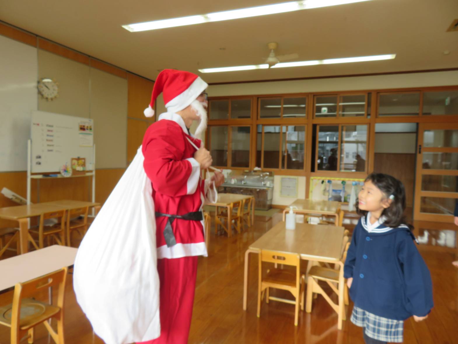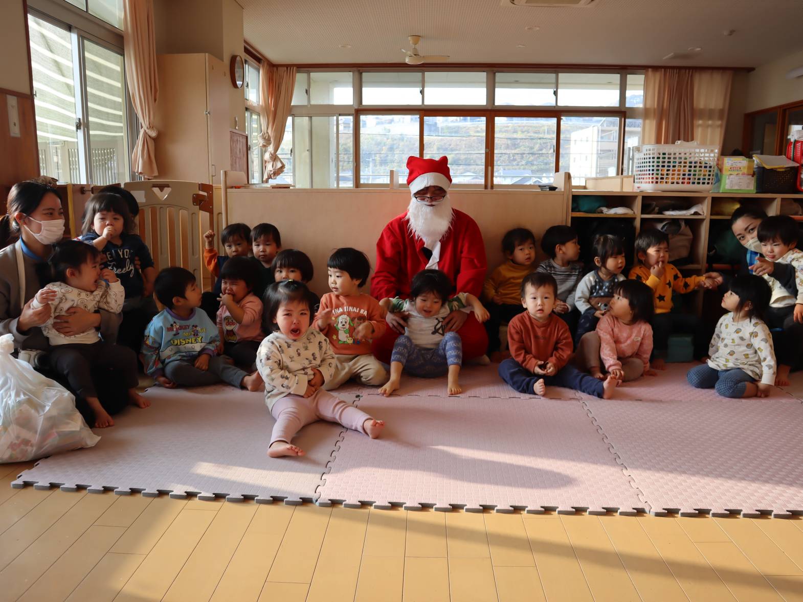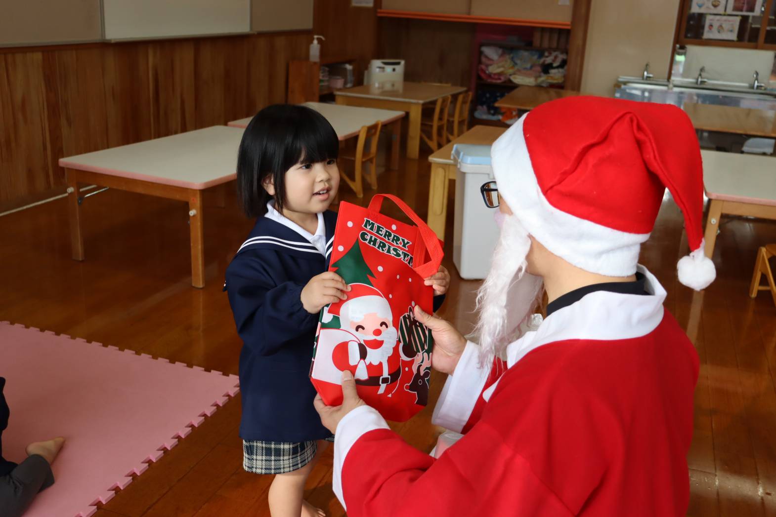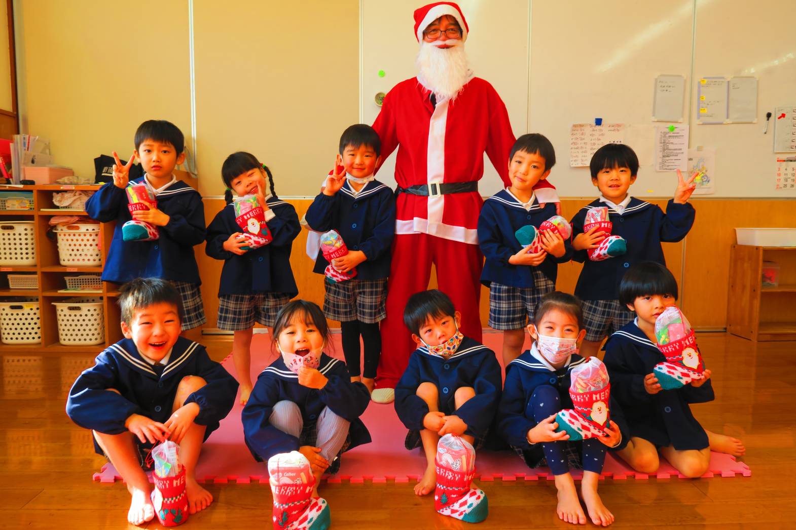 子どもたちが待ちに待ったクリスマス! 今日は、ひろき保育園にもサンタさんが来てくれました。 小さい組さんはサンタさんの姿に少し驚きつつも、タッチしたり、手を振ったりと 触れ合うことができました。 大きい組さんでは、「好きな色は何ですか?」「トナカイさんは今日はどこにいますか?」 等とハキハキと質問することができました。 一人ひとりプレゼントを貰い、嬉しそうな表情を見せる子どもたち。 最後はサンタさんと一緒に写真を撮りました。