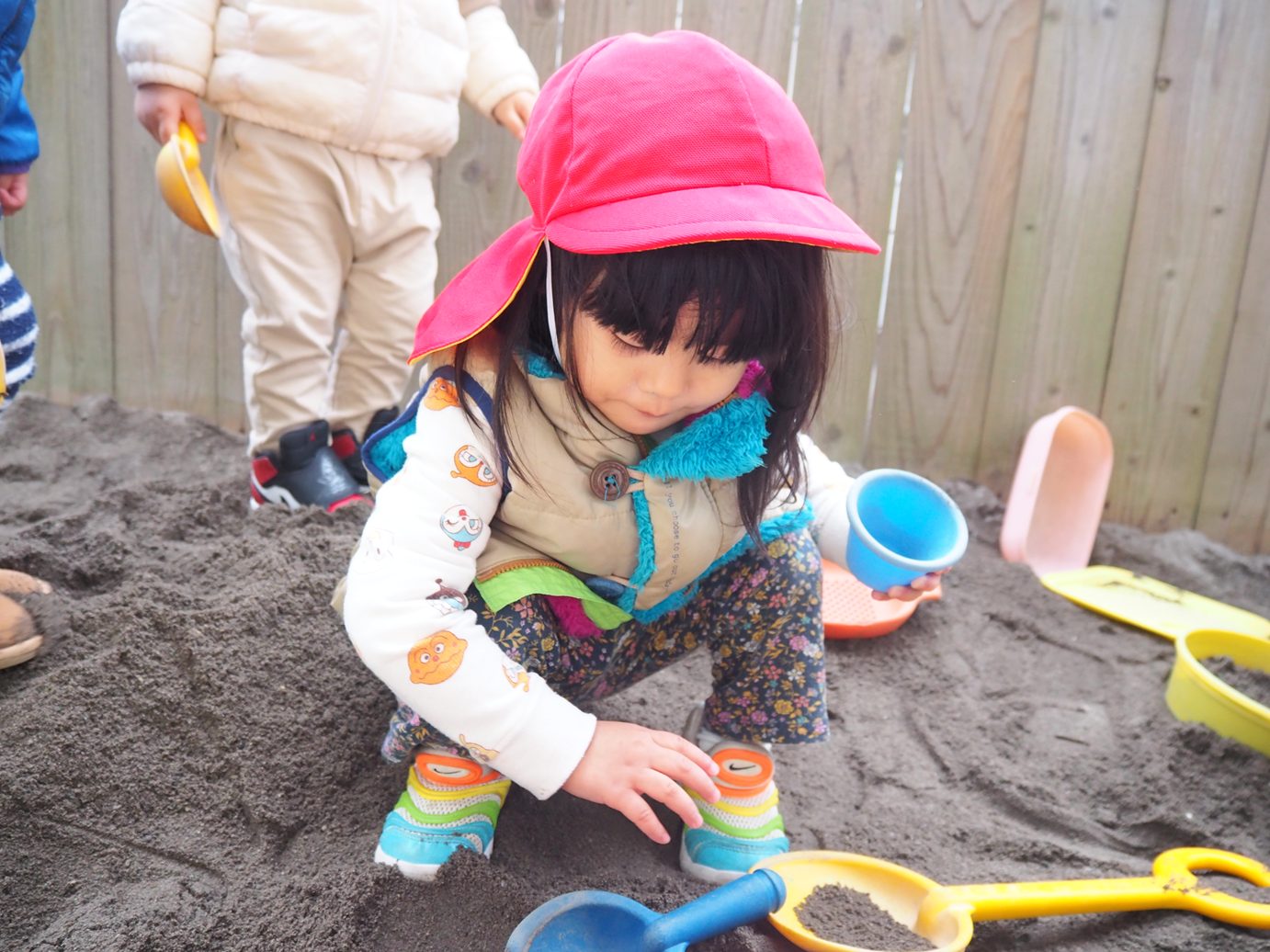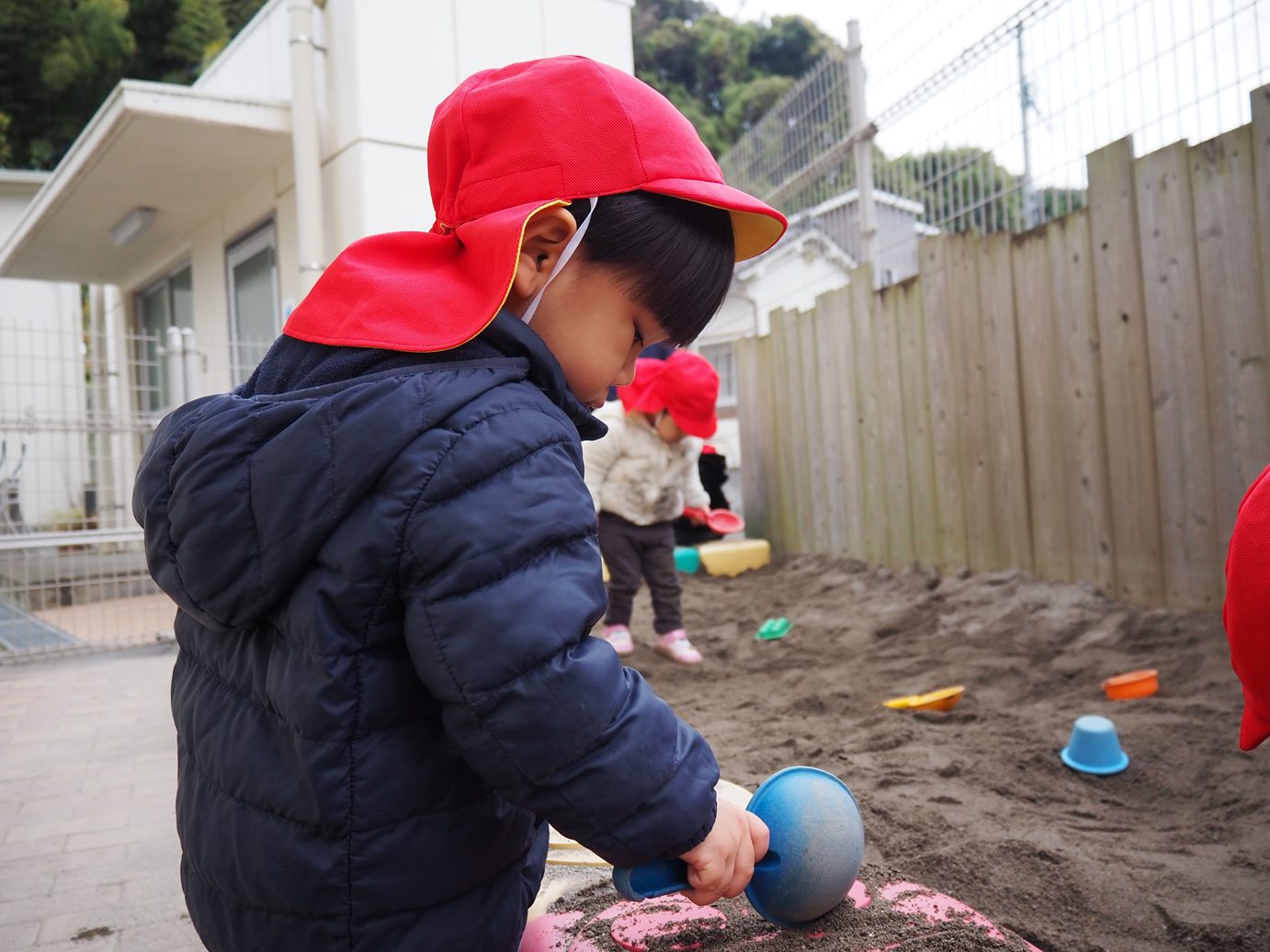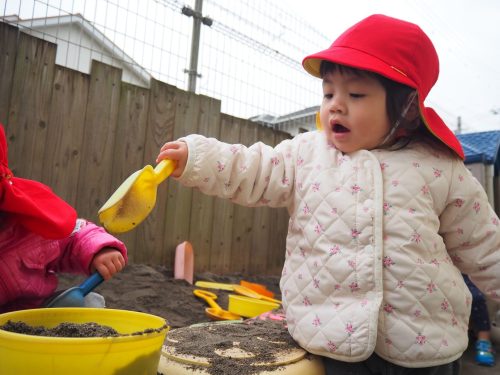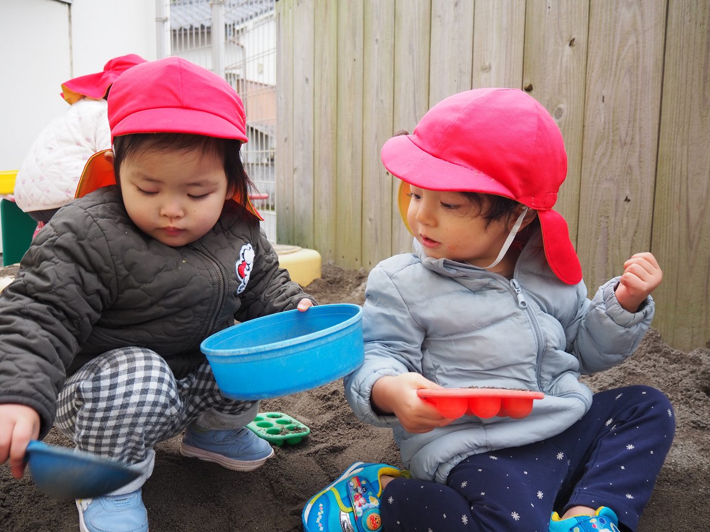 寒い日が続く中、元気いっぱいのこあら組さん。今日は初めて滑り台に挑戦する子どもたち。「あはは!」と嬉しそうに滑ったり、しっかり順番を守りながらゆっくり登ったりすることができました。 園庭で少し遊んだ後は大好きな砂場遊びです。ご飯を作り、友だちに食べさせてあげたり、中では買い物ごっこをする姿が見られます。「~くん、一緒に買い物に行こう。」、「~ちゃん、一緒に食べよう。」など見立て遊びやごっこ遊びが上手になりました。 砂の感触にも慣れ、容器に砂を入れて食べ物を作る子どもたちでした。
