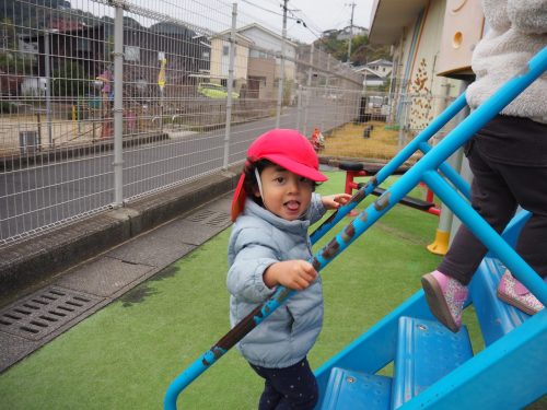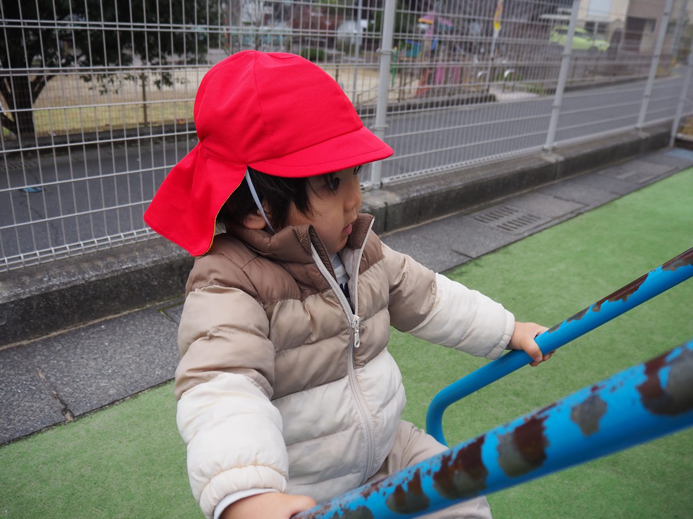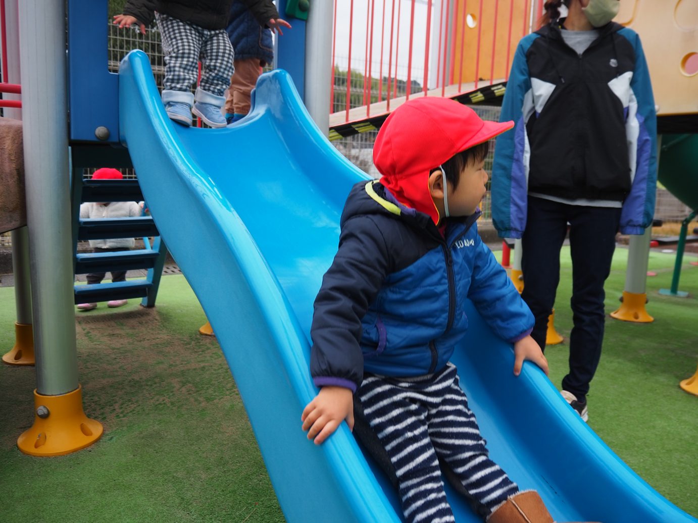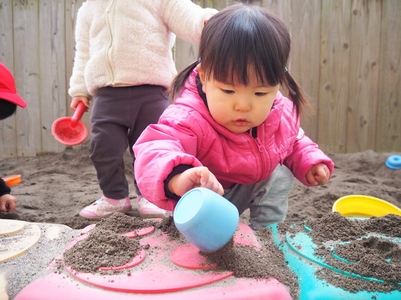 寒い日が続く中、元気いっぱいのこあら組さん。今日は初めて滑り台に挑戦する子どもたち。「あはは!」と嬉しそうに滑ったり、しっかり順番を守りながらゆっくり登ったりすることができました。 園庭で少し遊んだ後は大好きな砂場遊びです。ご飯を作り、友だちに食べさせてあげたり、中では買い物ごっこをする姿が見られます。「~くん、一緒に買い物に行こう。」、「~ちゃん、一緒に食べよう。」など見立て遊びやごっこ遊びが上手になりました。 砂の感触にも慣れ、容器に砂を入れて食べ物を作る子どもたちでした。
