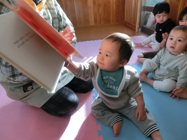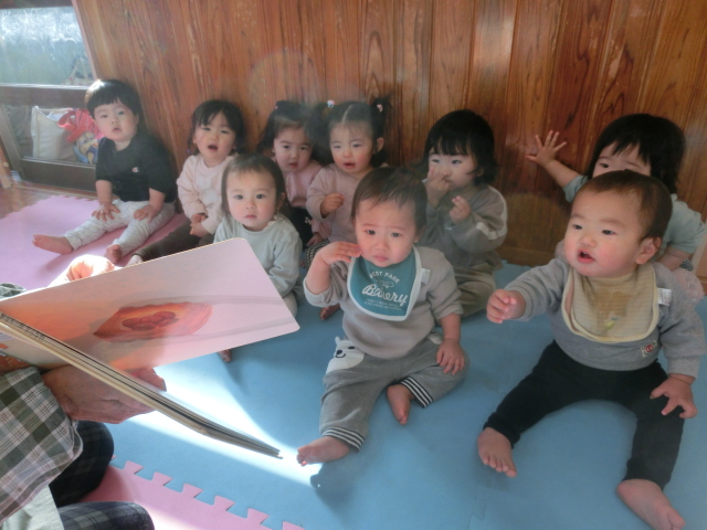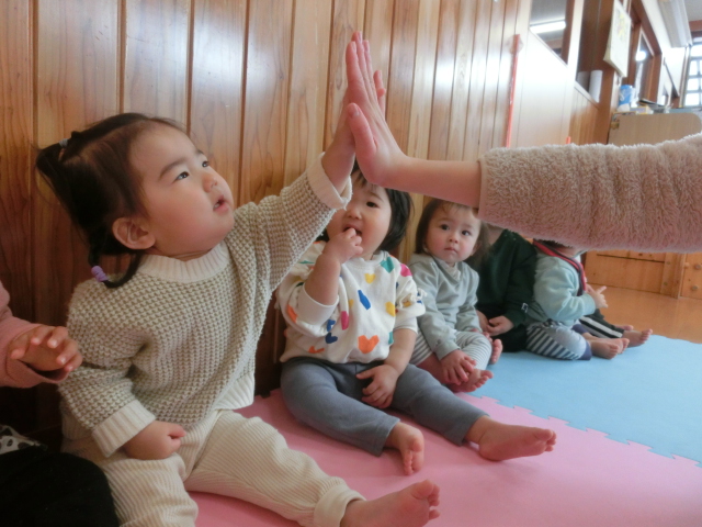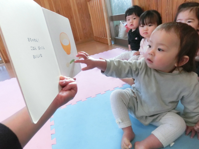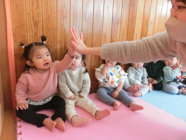 新年を迎え、元気に保育園で過ごしているひよこ組さん! 登園後は、朝の集まりを行い一日がスタートします。 絵本の時間は、保育者の言葉に合わせ「ぱっ。」、「てんてん。」等と言葉を真似する姿が見られ、絵本に興味津々です。 また、名前を読んだり、挨拶をしたりするとハイタッチをするなどして、 保育者とコミュニケーションを取ることを笑顔でする子どもたち♪ 今後も、子どもたちと楽しく朝の集まりに取り組んでいきたいと思います。