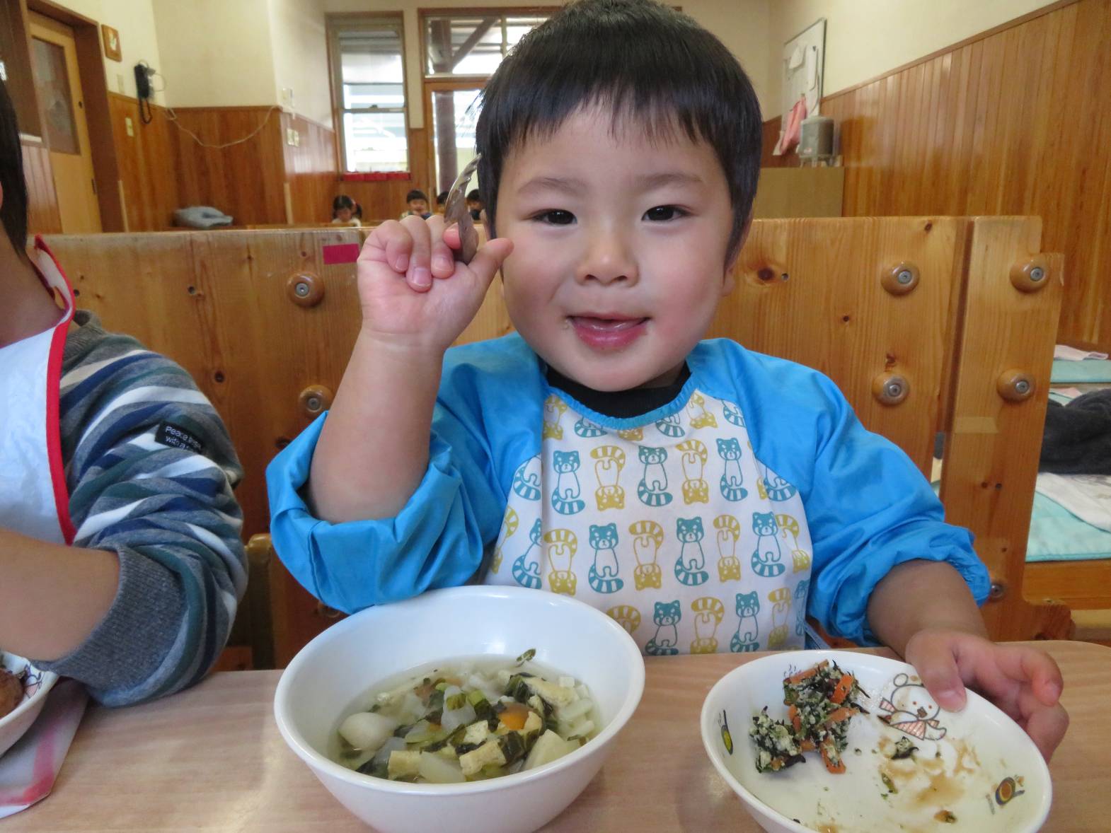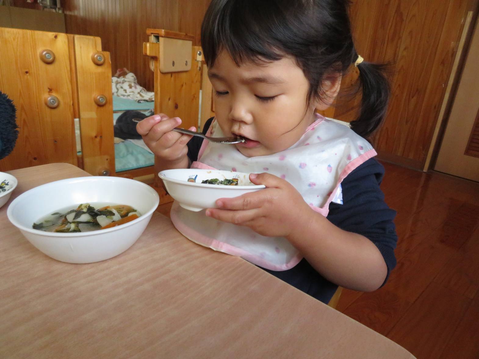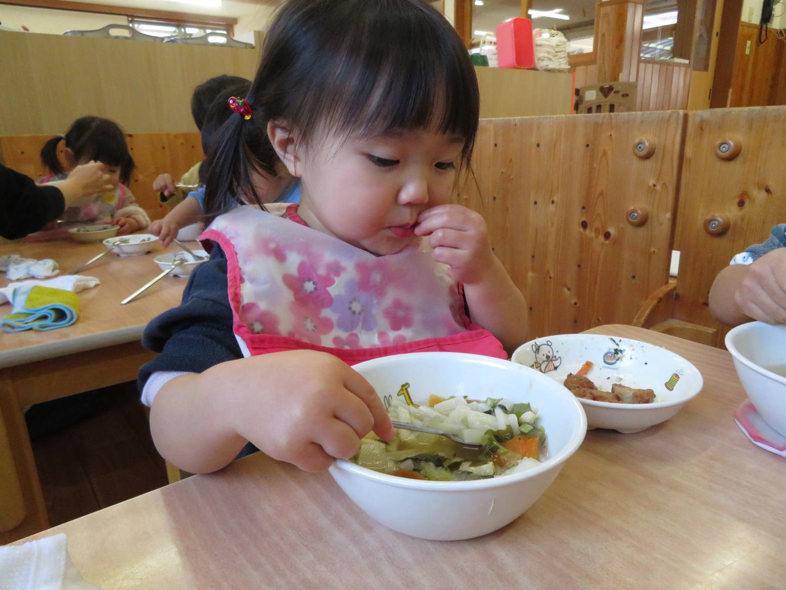 今日はわくわくメニューでした。 どの食材も「おいしい!」と言いながら、意欲的に食べ進めるこあら組さん! 食事のマナーも少しずつ身に付いてきており、皿を持ったり、正しい姿勢で食べ進めることができるようになってきました。 「こう?」、「あってる?」等と、スプーンの持ち方を確認する姿も増えてきました。 その都度バランスよく食べることや正しいスプーンの持ち方を伝えているところです。 今後も子どもたち自身で食べ進める姿を見守りながら、言葉掛けや援助を行っていきたいと思います♪
