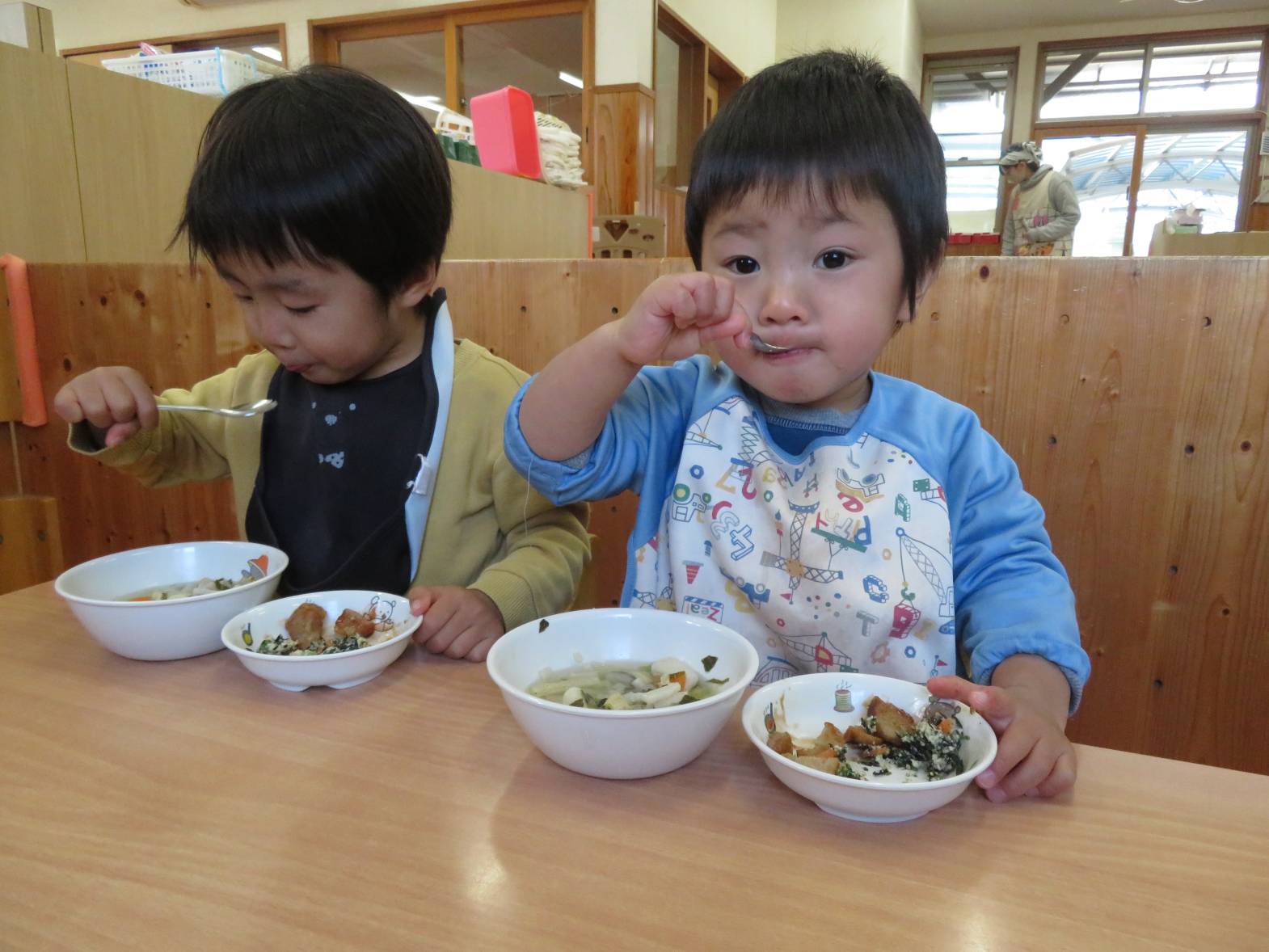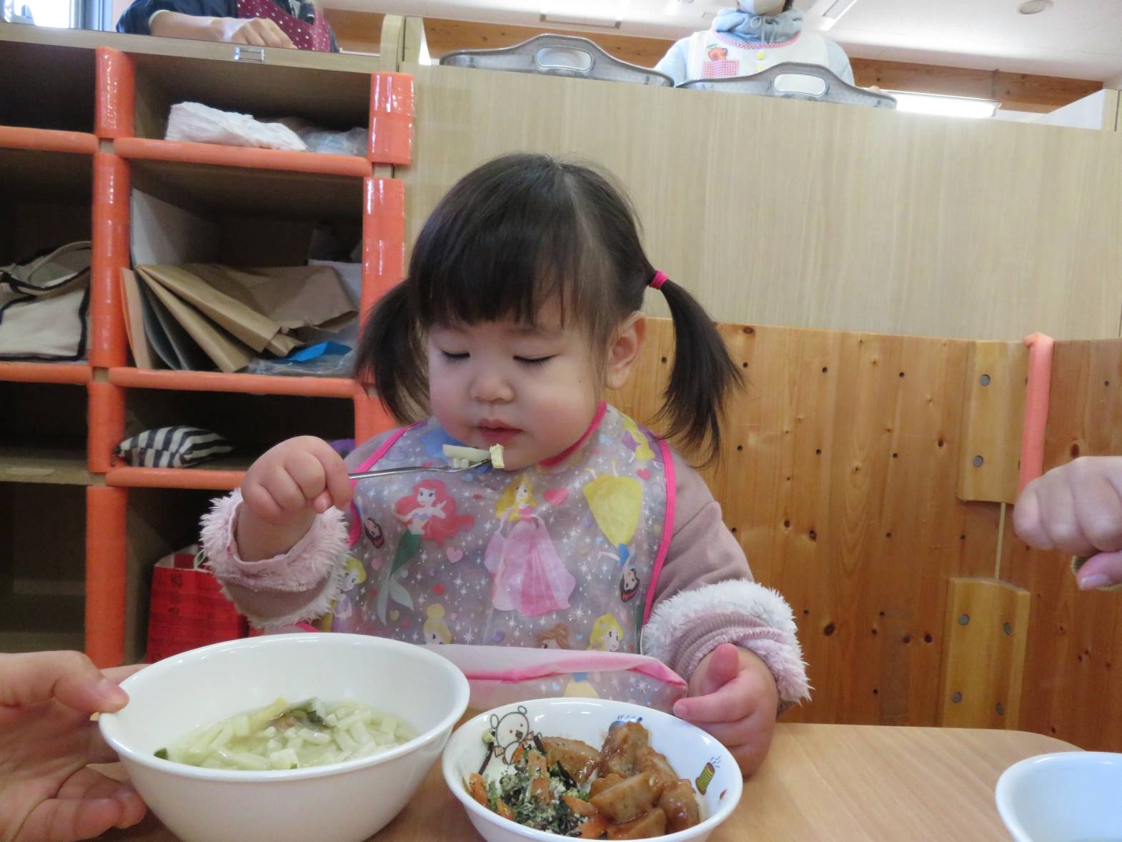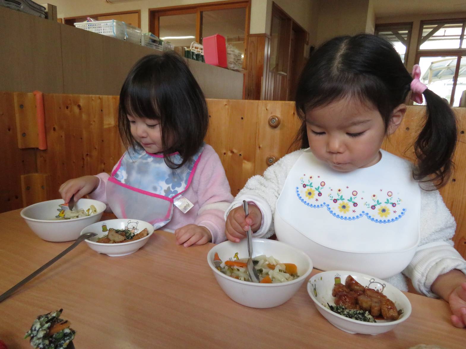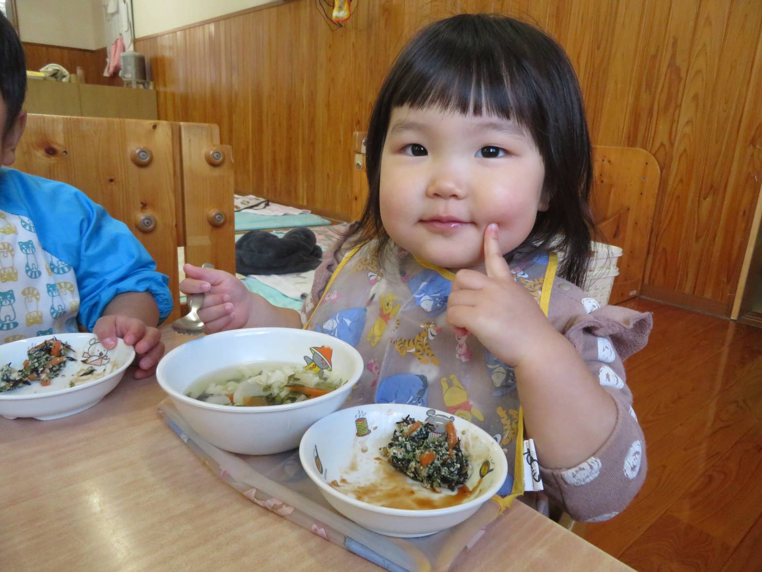 今日はわくわくメニューでした。 どの食材も「おいしい!」と言いながら、意欲的に食べ進めるこあら組さん! 食事のマナーも少しずつ身に付いてきており、皿を持ったり、正しい姿勢で食べ進めることができるようになってきました。 「こう?」、「あってる?」等と、スプーンの持ち方を確認する姿も増えてきました。 その都度バランスよく食べることや正しいスプーンの持ち方を伝えているところです。 今後も子どもたち自身で食べ進める姿を見守りながら、言葉掛けや援助を行っていきたいと思います♪