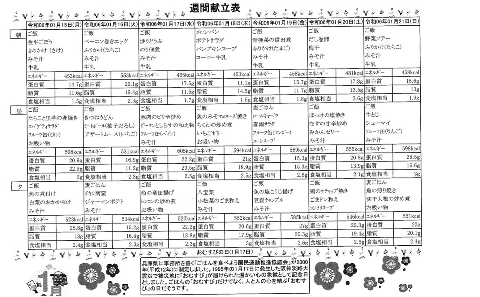 1月15日(月)~1月21日(日)の献立表になります。ぜひご覧ください。