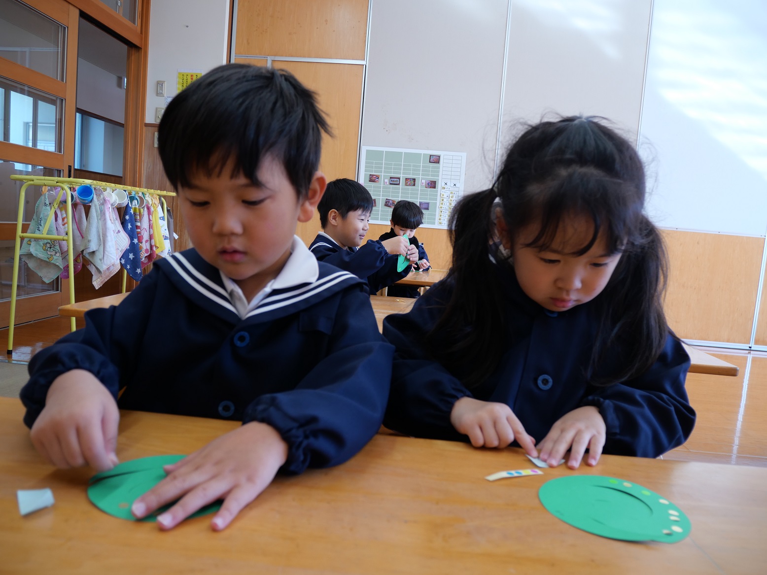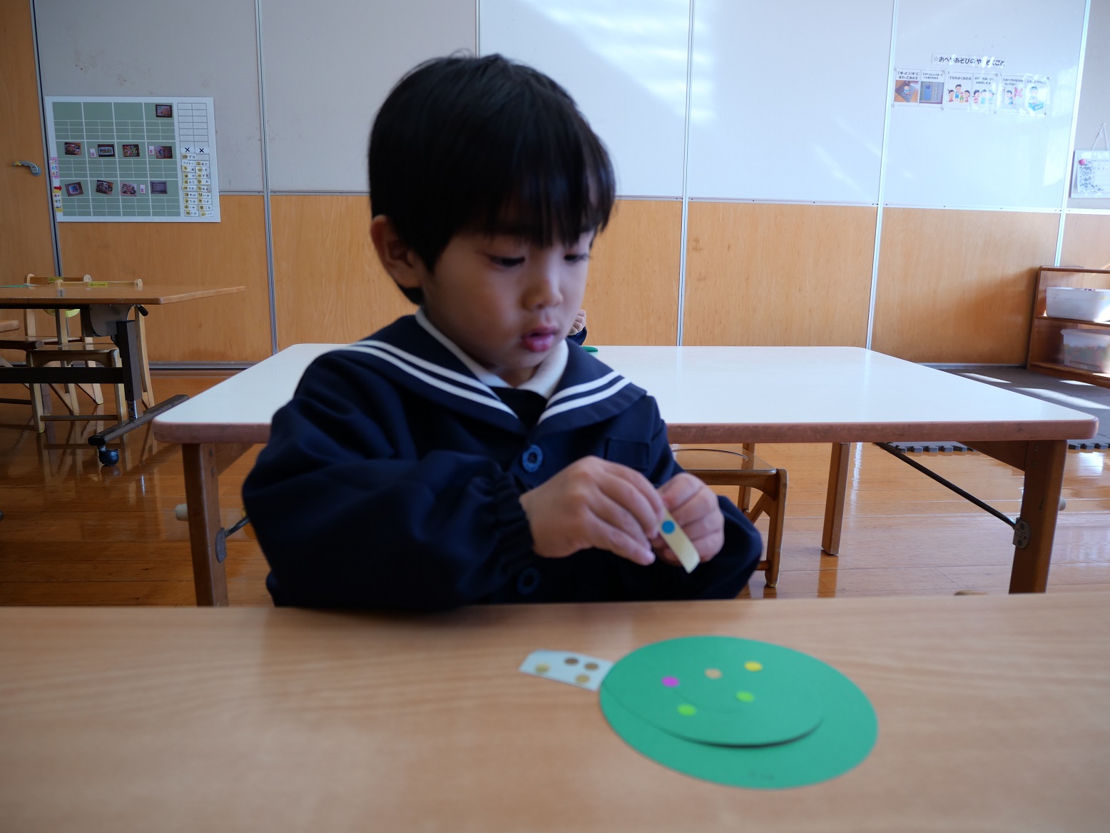 「カラフルな体にしよう!」「ここには何を貼ろうかな?」と、一生懸命考えながら貼っていく姿が見られます。