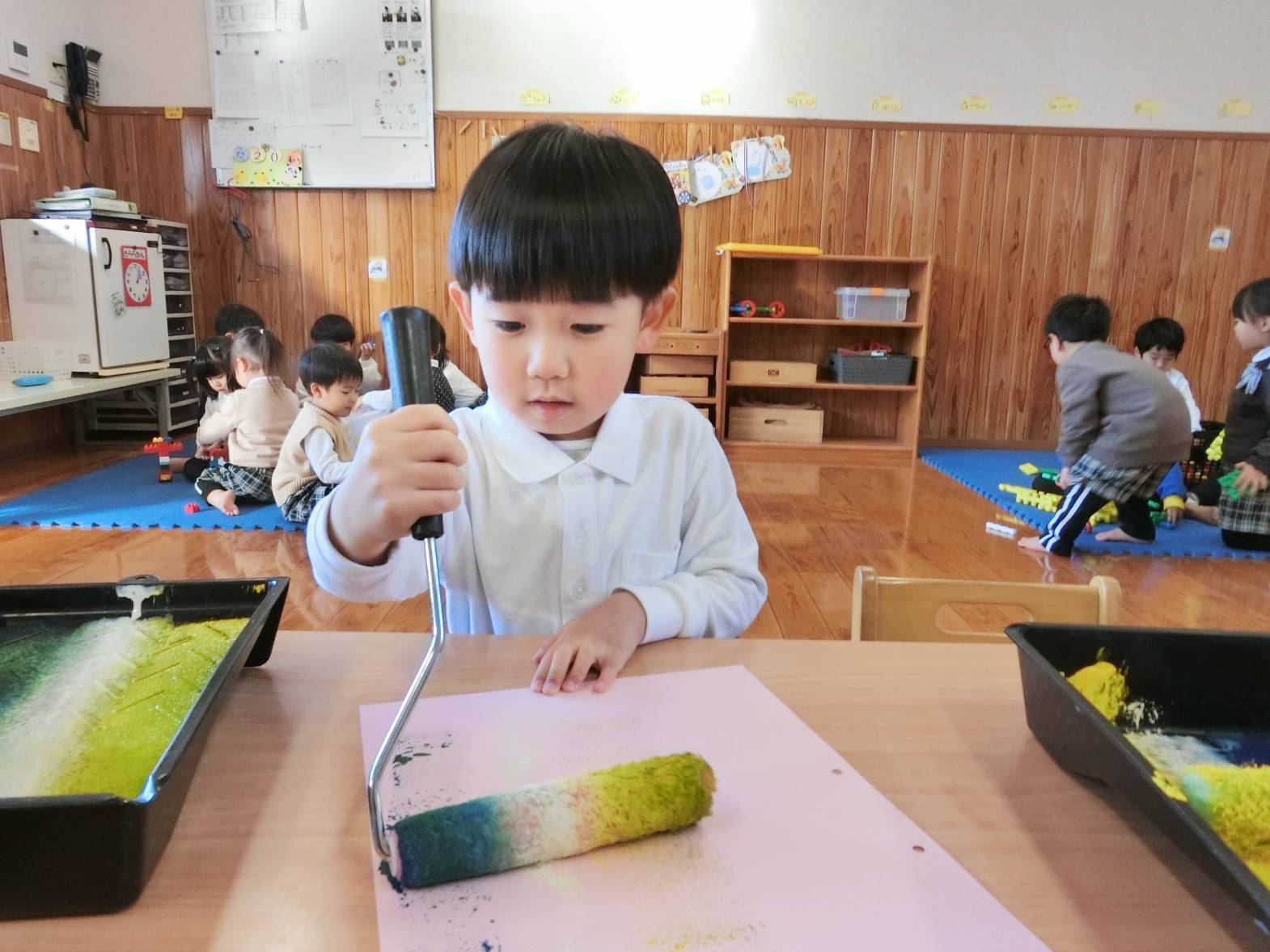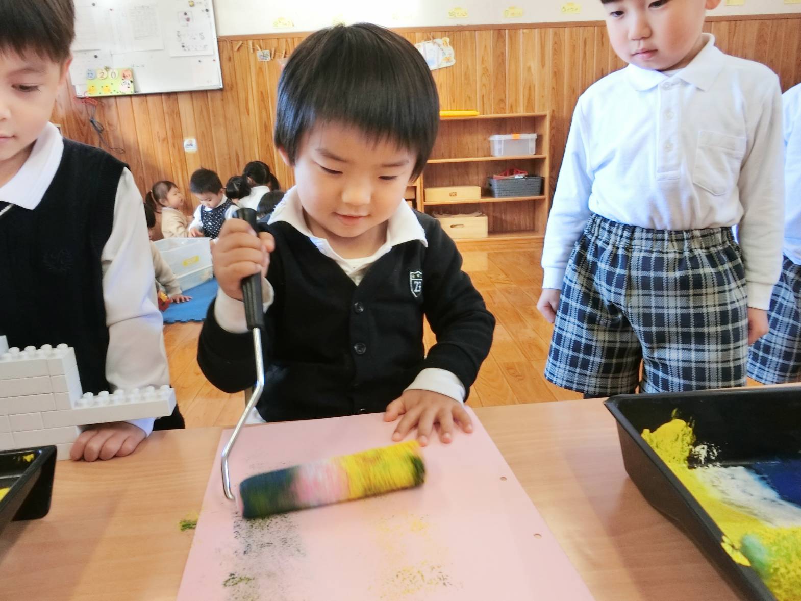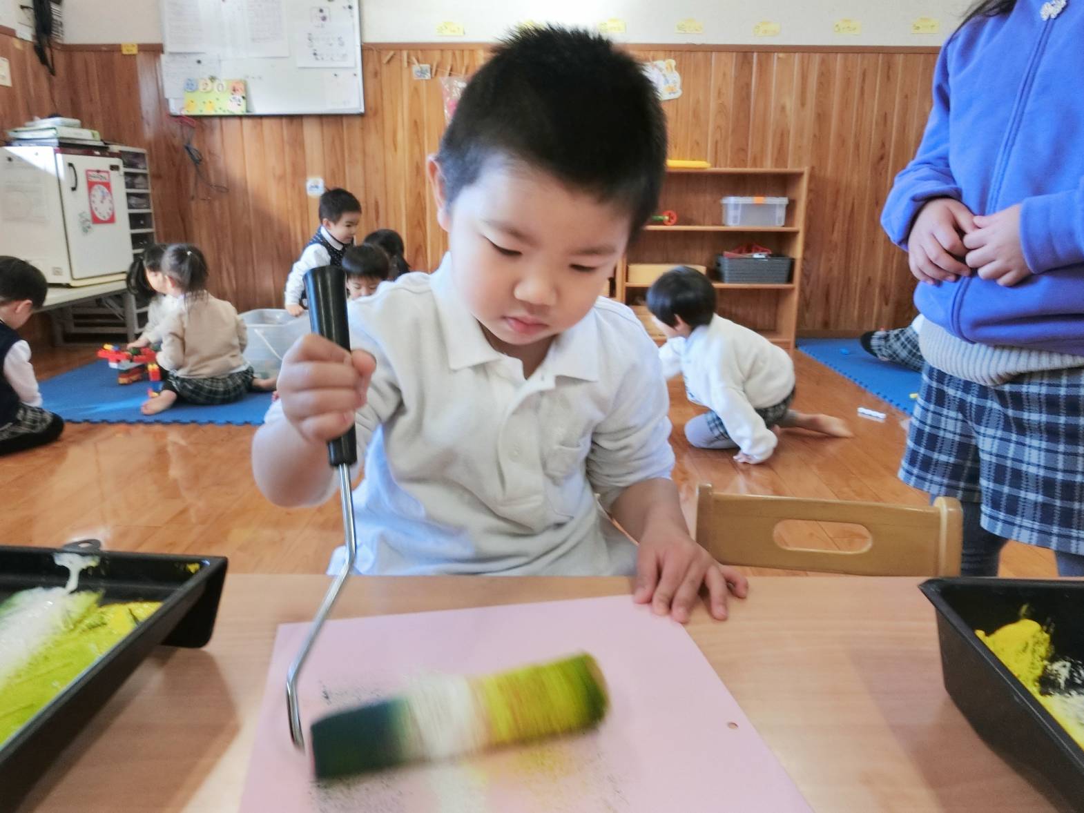 製作に使う画用紙の背景に自分たちで模様を付けました! 今回は、ローラーを使用して絵の具で模様を付けます。 「コロコロ~ってするの!」、「楽しそう♪」と興味を持つりす組さん。 実際にやってみると、「こうやって持ってするんだよね?」、「力がいるね。」、「何か難しい。」と少し苦戦しながらも「見て!緑になってる。」、「黄色が付かないな~」と色の変化に気付いて楽しんでいました。