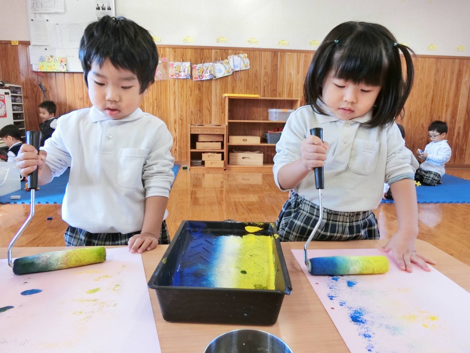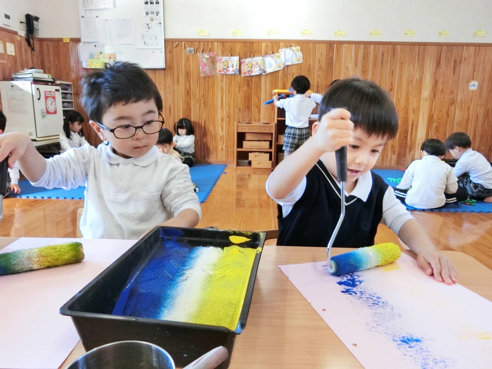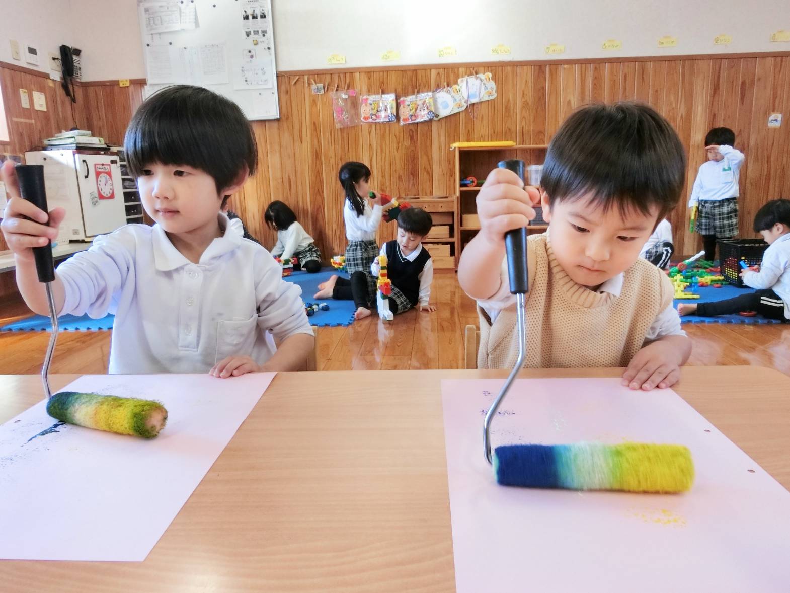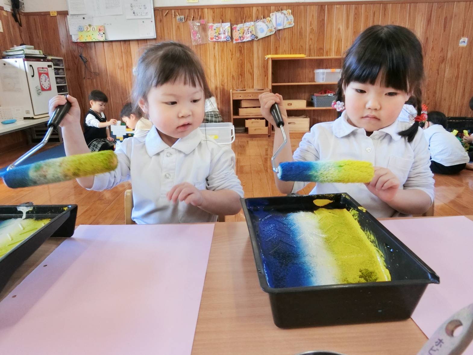 製作に使う画用紙の背景に自分たちで模様を付けました! 今回は、ローラーを使用して絵の具で模様を付けます。 「コロコロ~ってするの!」、「楽しそう♪」と興味を持つりす組さん。 実際にやってみると、「こうやって持ってするんだよね?」、「力がいるね。」、「何か難しい。」と少し苦戦しながらも「見て!緑になってる。」、「黄色が付かないな~」と色の変化に気付いて楽しんでいました。