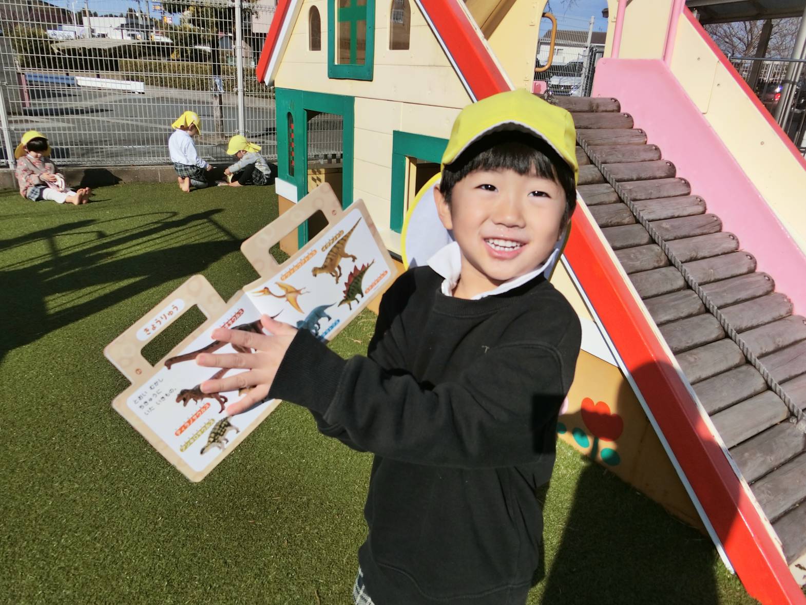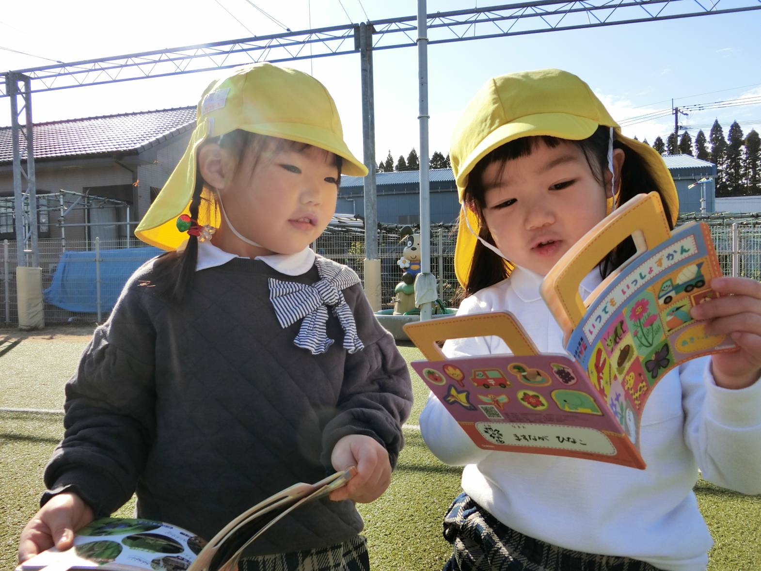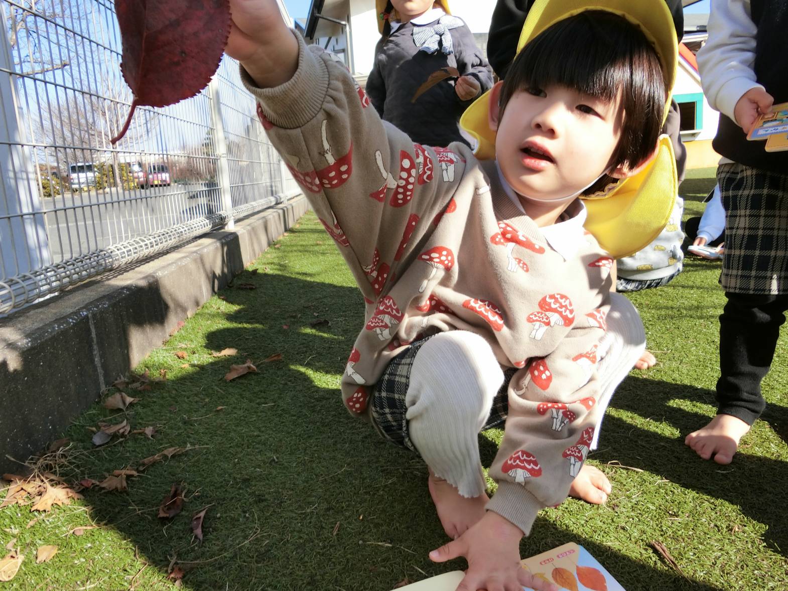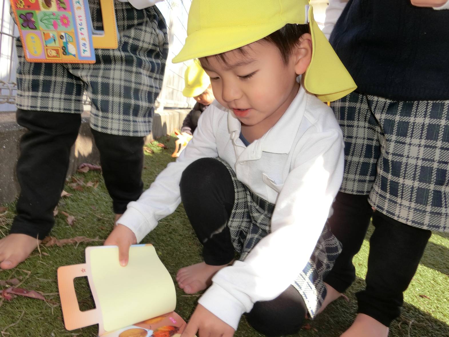 図鑑に興味を持っている子どもたち! 保育室や外で図鑑を見ながらいろいろなことに気付いている様子が見られます。 保育者に「図鑑外に持って行っていい?」と許可をもらうと外に持って観察をするりす組さん。 外に持っていくと「木の上の葉っぱが一緒の形かも!」、「ここに虫がいるはずなんだけどな~。」、「僕は恐竜を見つけてくる!」、「空の上に、同じ飛行機が飛んでいるかも。」と会話も弾みます♪ 図鑑を見て友だちと教え合ったり、一緒に探したりすることを楽しんでいる姿が見られました!