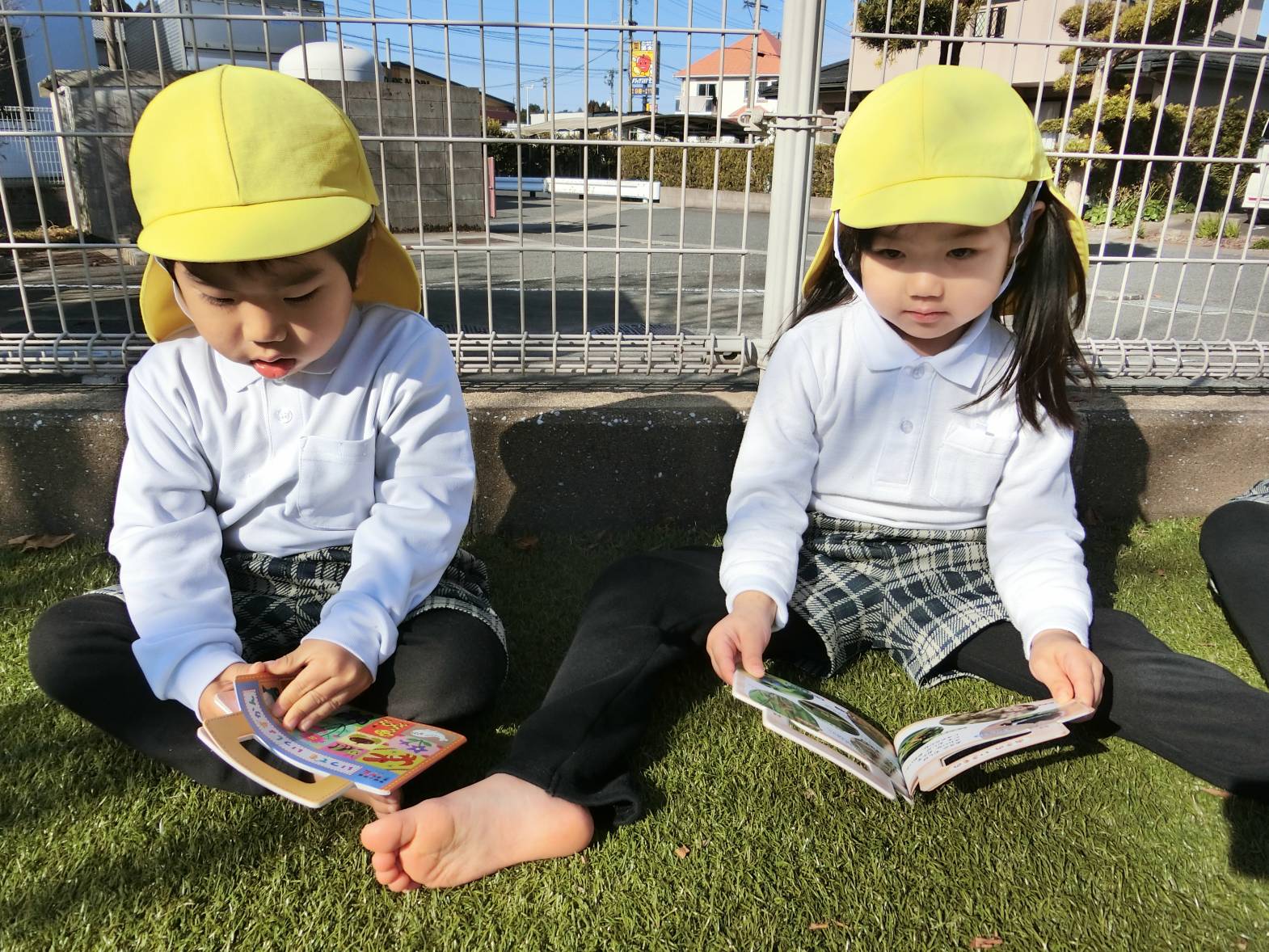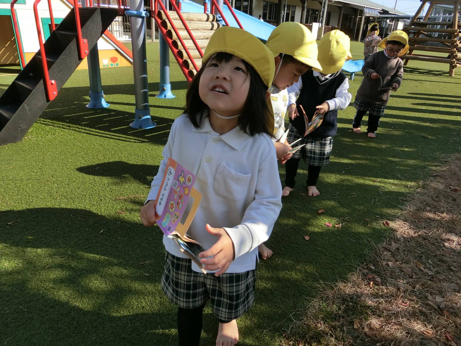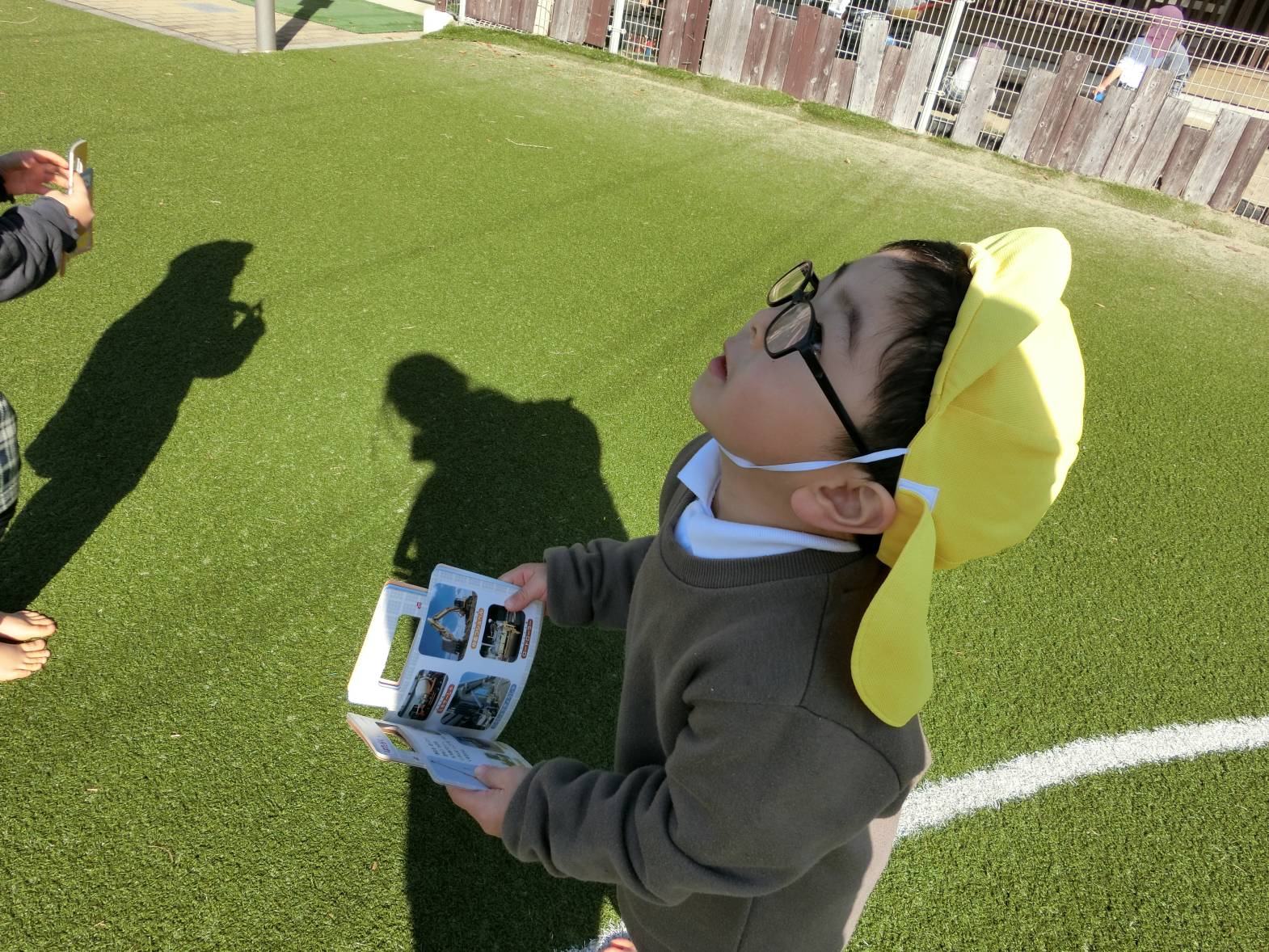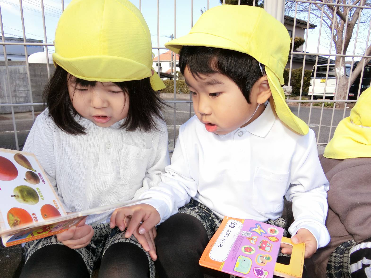図鑑に興味を持っている子どもたち! 保育室や外で図鑑を見ながらいろいろなことに気付いている様子が見られます。 保育者に「図鑑外に持って行っていい?」と許可をもらうと外に持って観察をするりす組さん。 外に持っていくと「木の上の葉っぱが一緒の形かも!」、「ここに虫がいるはずなんだけどな~。」、「僕は恐竜を見つけてくる!」、「空の上に、同じ飛行機が飛んでいるかも。」と会話も弾みます♪ 図鑑を見て友だちと教え合ったり、一緒に探したりすることを楽しんでいる姿が見られました!