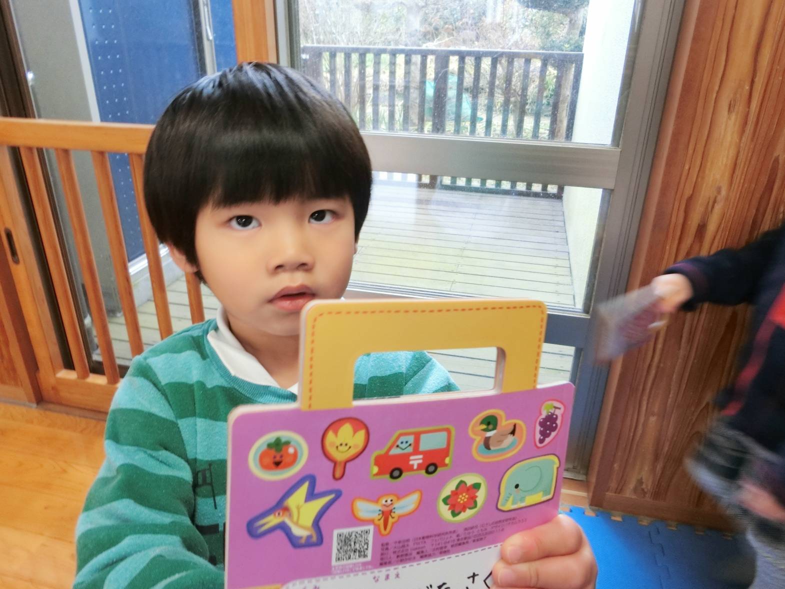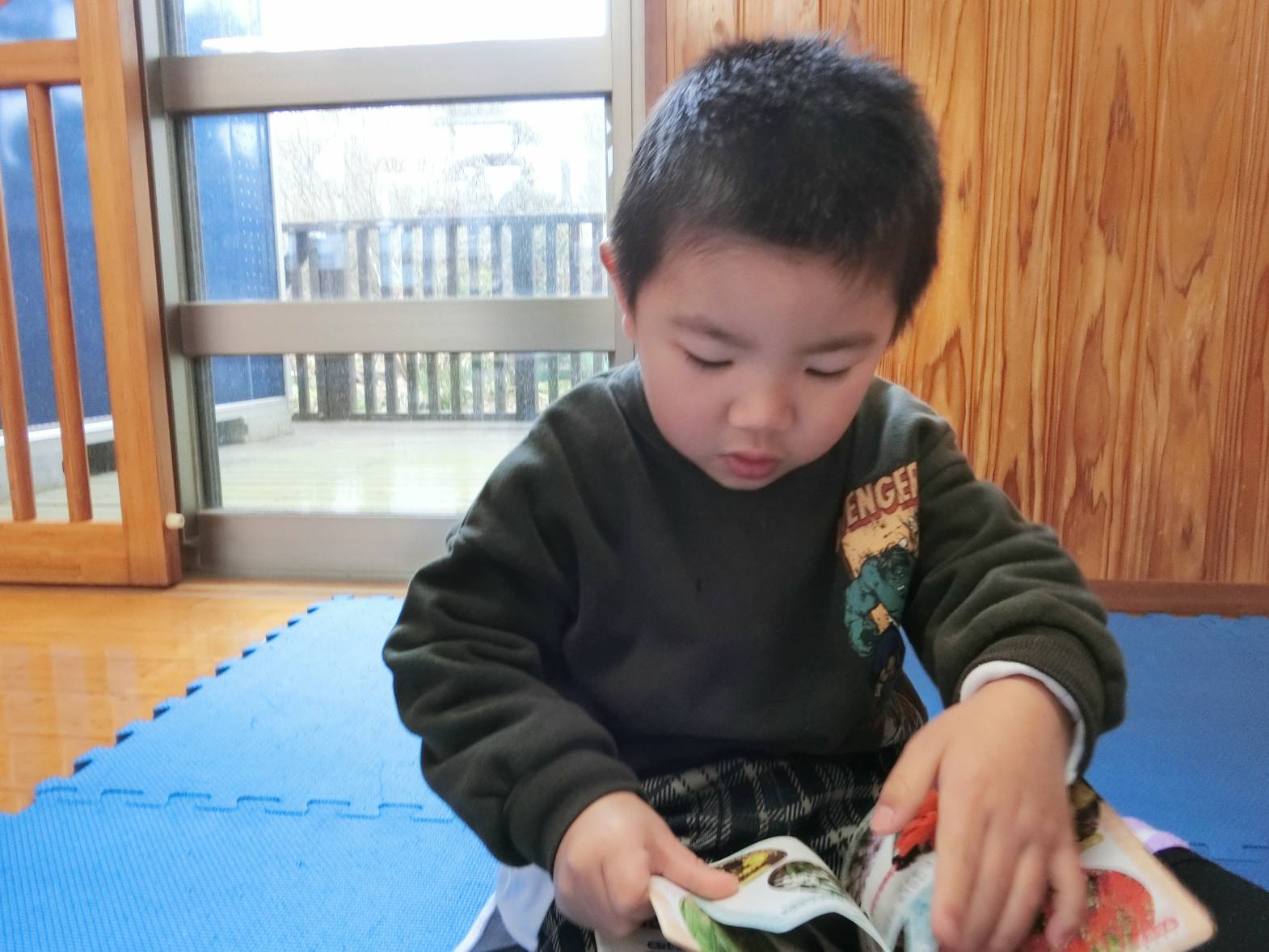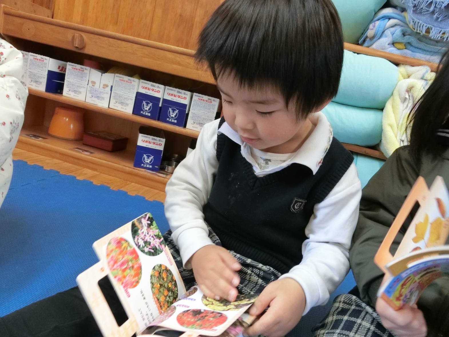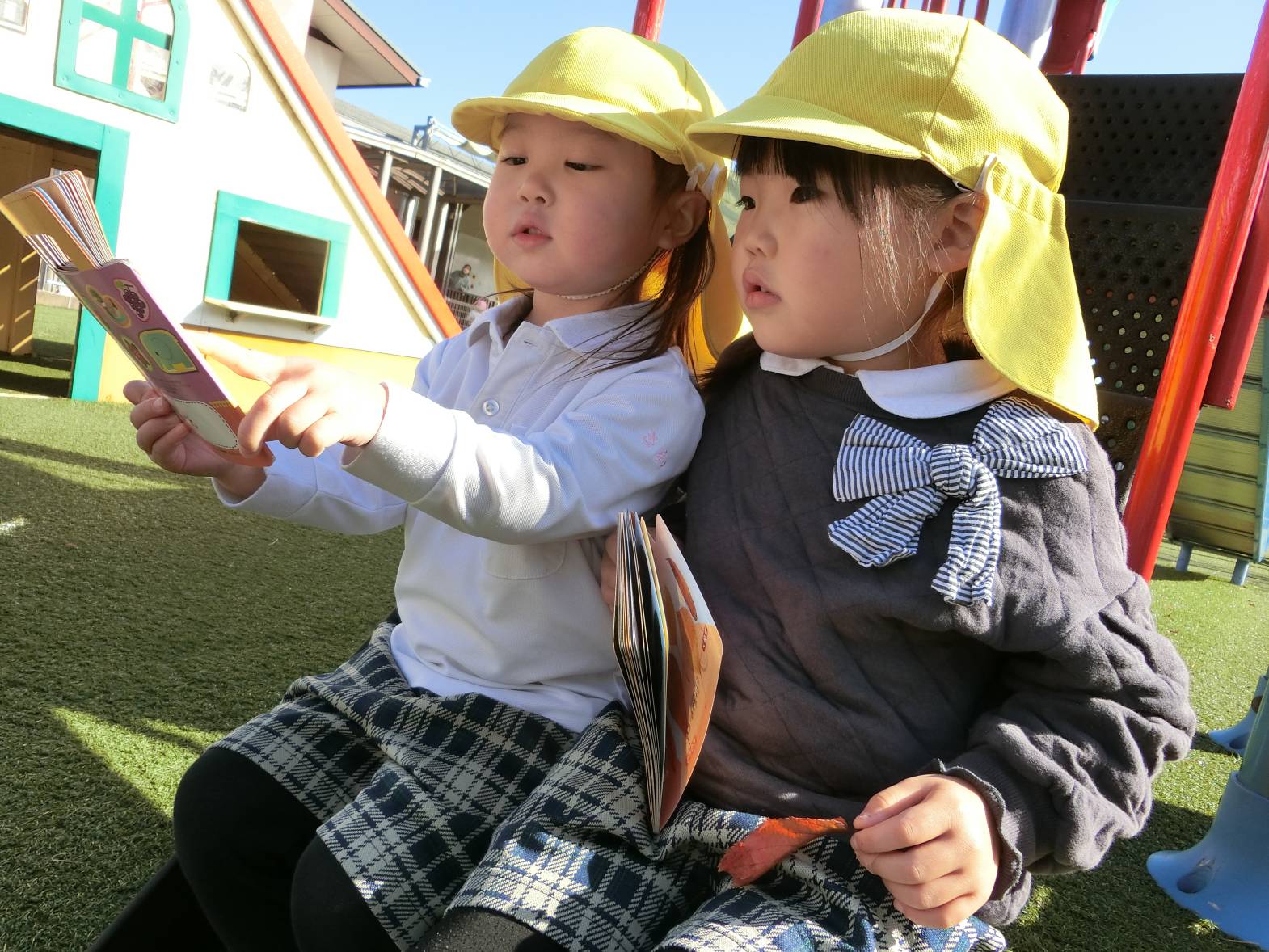 図鑑に興味を持っている子どもたち! 保育室や外で図鑑を見ながらいろいろなことに気付いている様子が見られます。 保育者に「図鑑外に持って行っていい?」と許可をもらうと外に持って観察をするりす組さん。 外に持っていくと「木の上の葉っぱが一緒の形かも!」、「ここに虫がいるはずなんだけどな~。」、「僕は恐竜を見つけてくる!」、「空の上に、同じ飛行機が飛んでいるかも。」と会話も弾みます♪ 図鑑を見て友だちと教え合ったり、一緒に探したりすることを楽しんでいる姿が見られました!