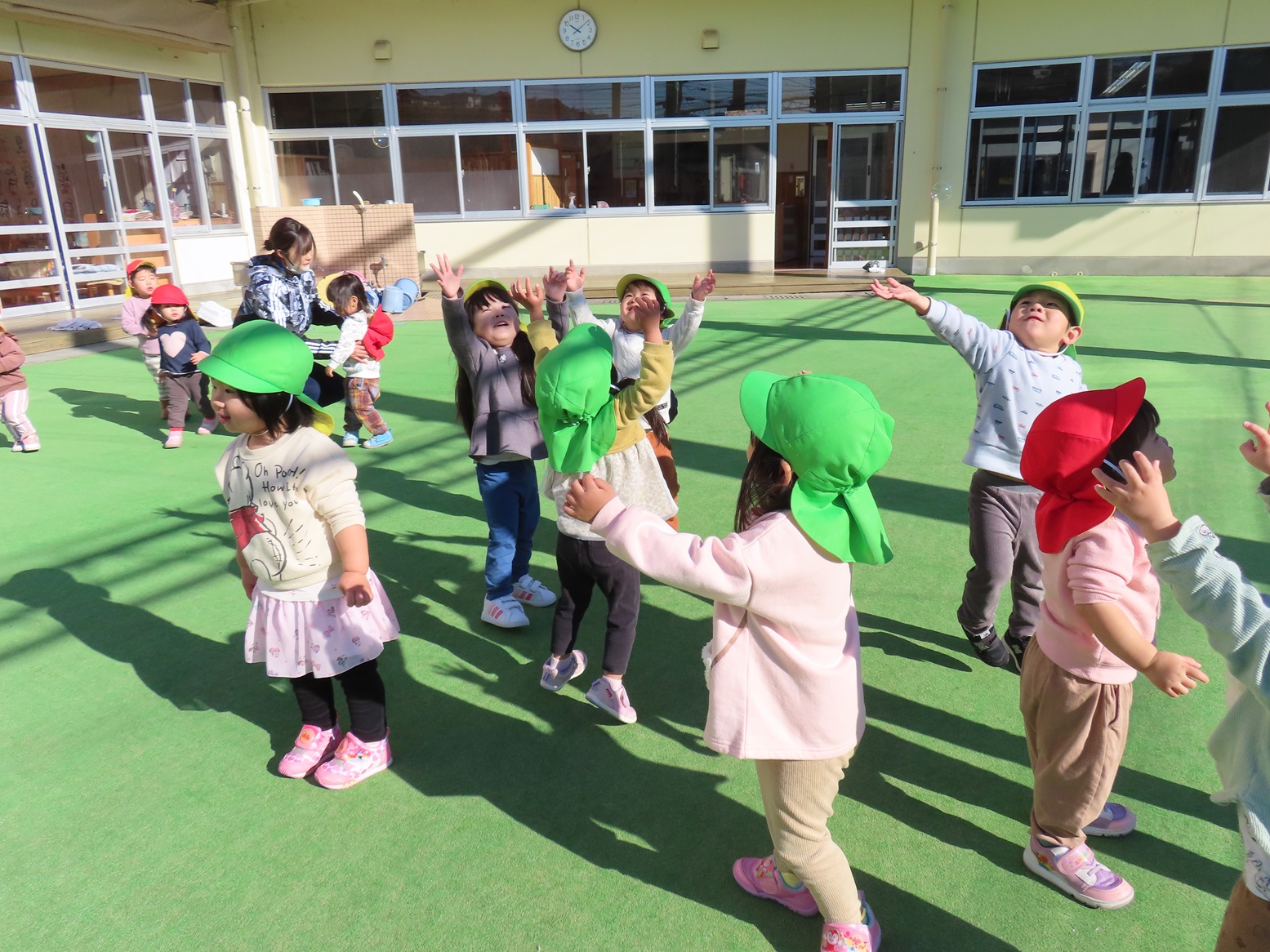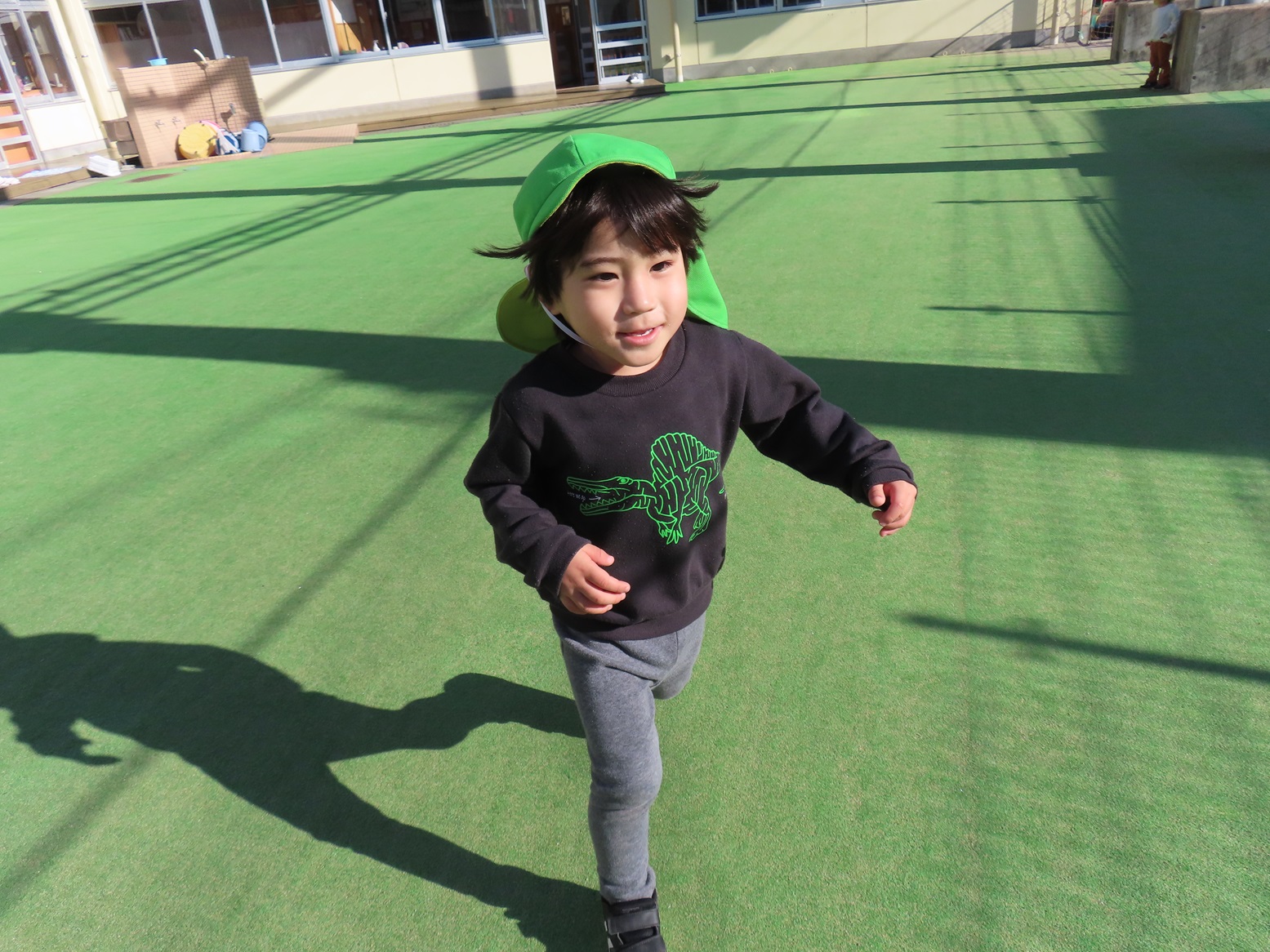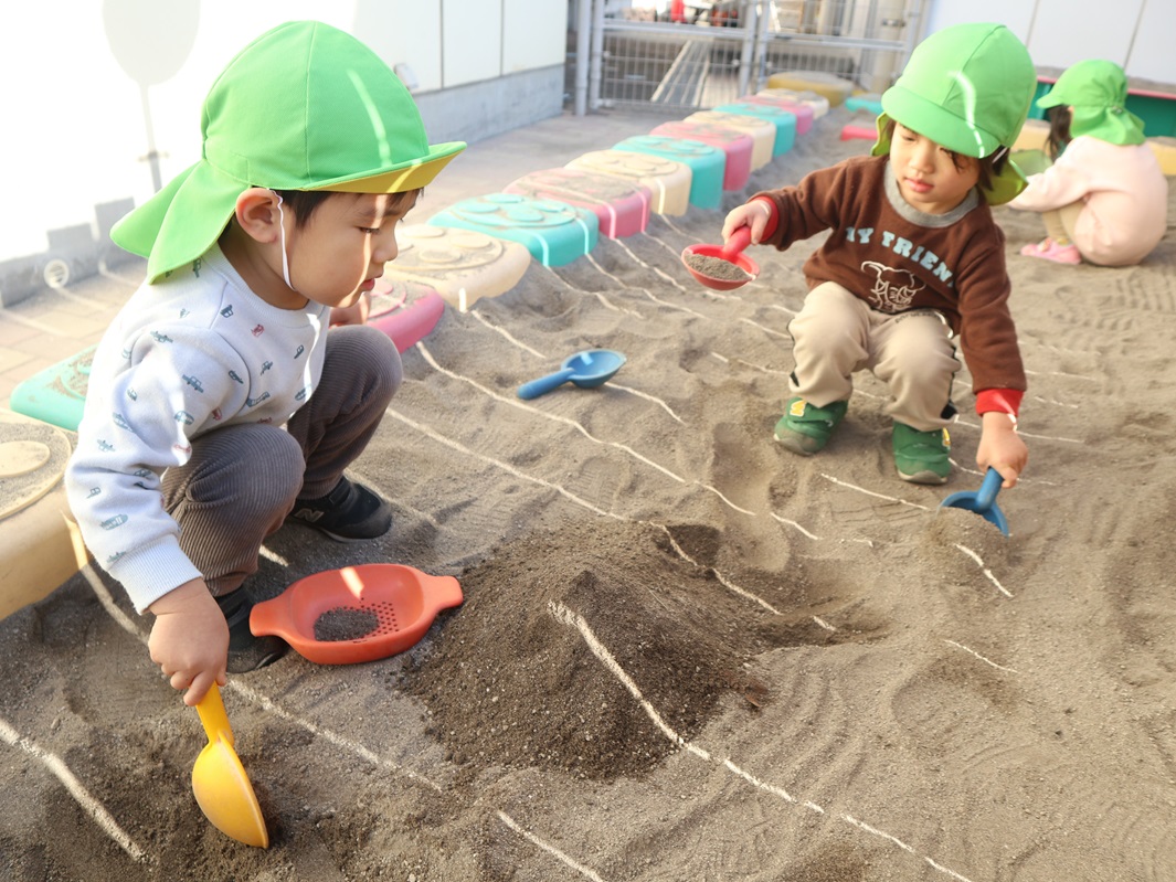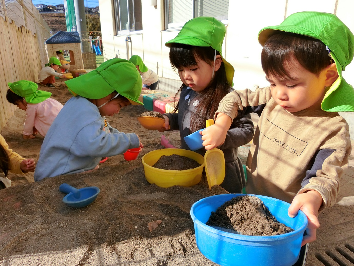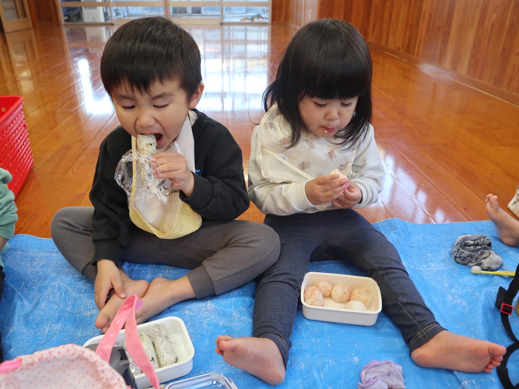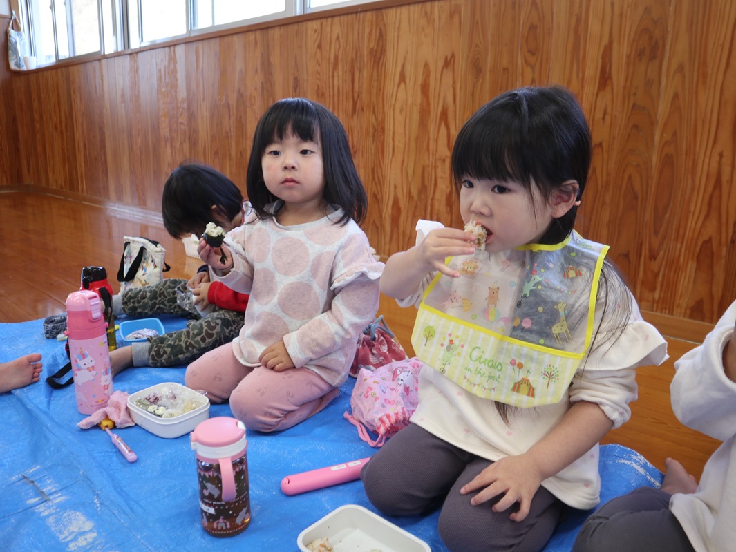 朝から「おむすび持ってきたよ!」と、嬉しそうに教えてくれた子どもたち。 今日は、園庭と砂場で元気いっぱい遊びました。 友だちとのかかわりも増え、「一緒に遊ぼう!」「お山作ろう。」と声を掛け合う姿が見られます。 外でたくさん体を動かした後は、楽しみにしていたおむすびの時間です。 大きなおむすびを口いっぱいに頬張り、大満足な子どもたちでした。