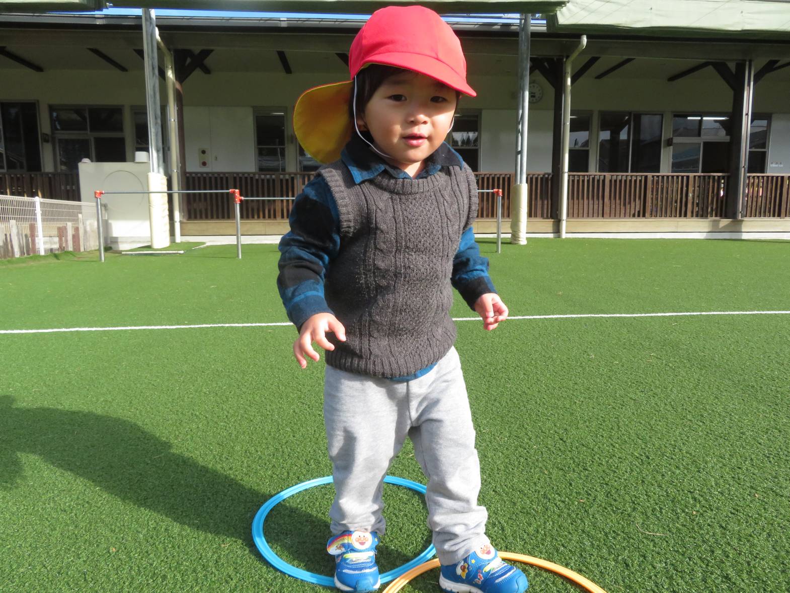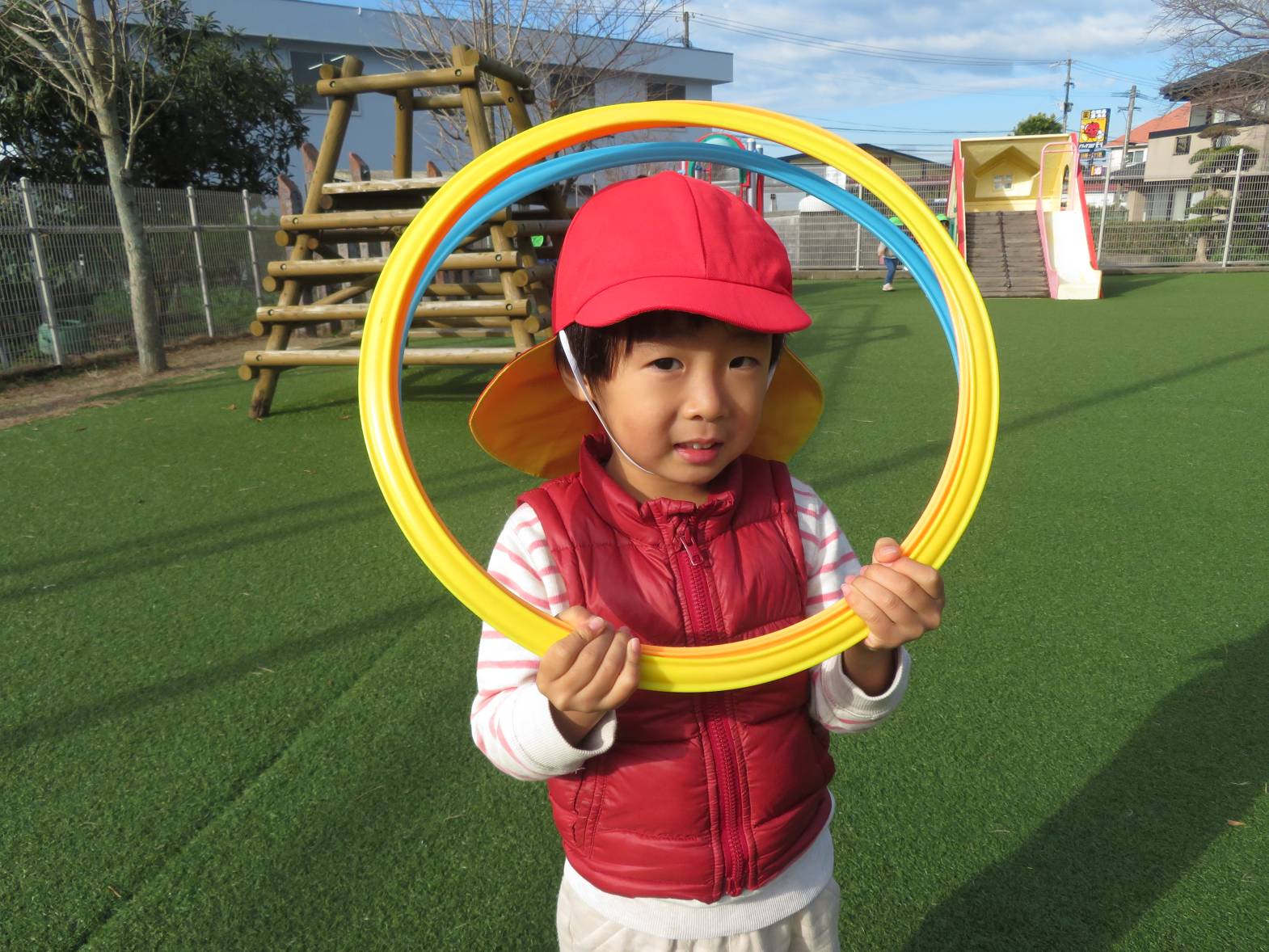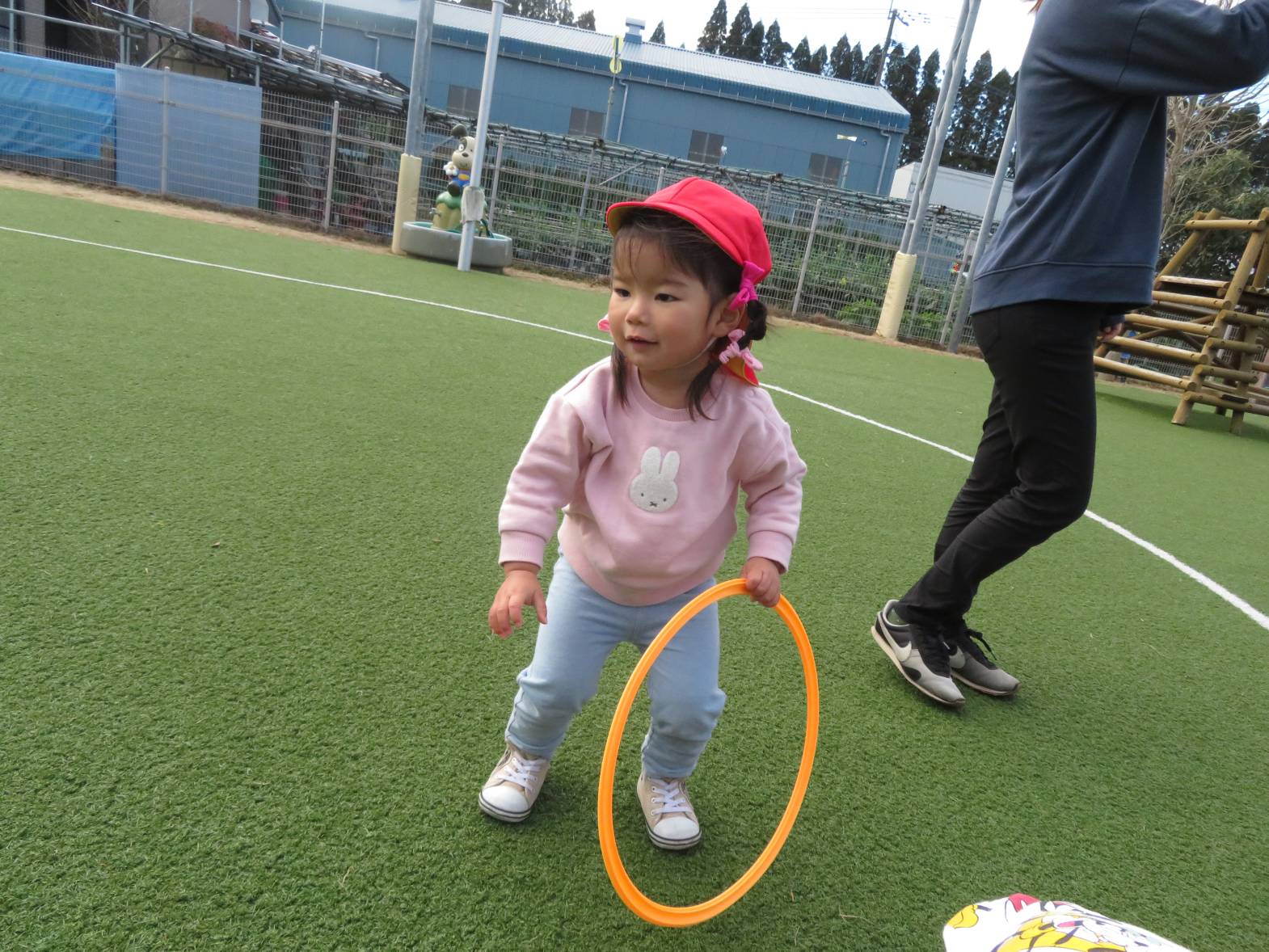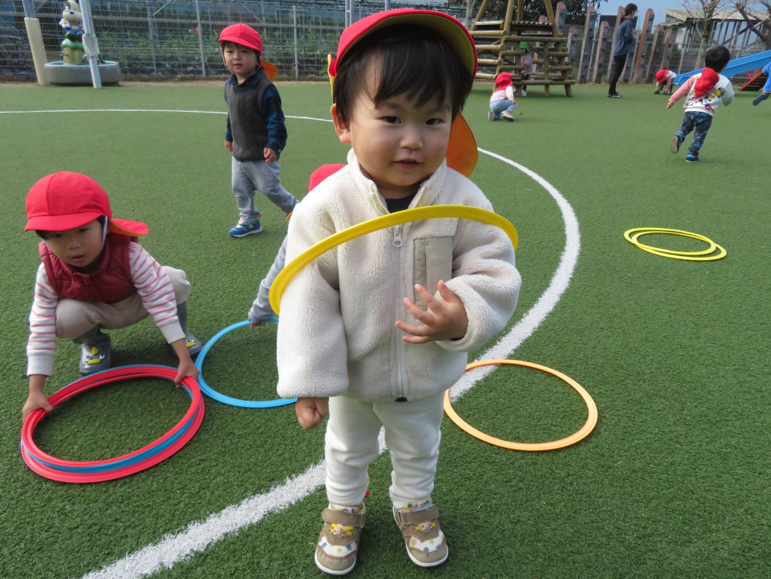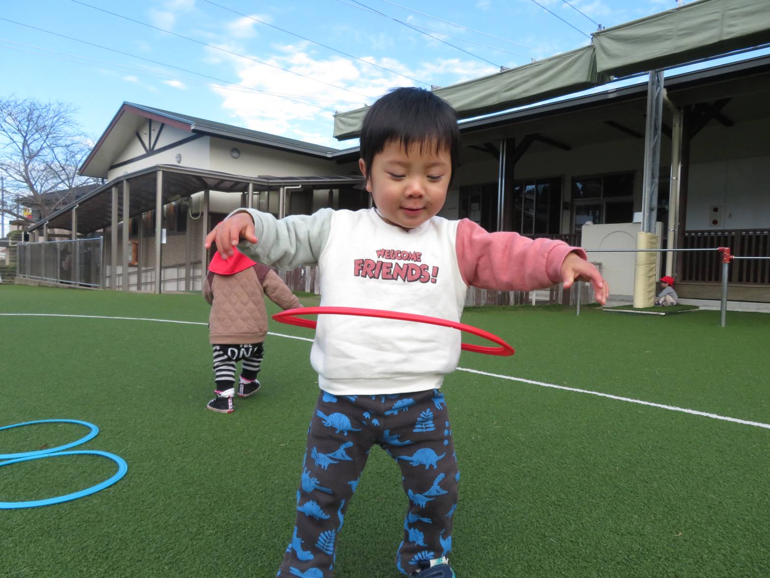 戸外遊びでは、輪っかを使って遊びました。 保育者が輪っかを並べると、「ジャーンプ!」と言って、輪っかから輪っかへ両足跳びができるようになってきている子どもたち! また、フラフープのようにお腹でくるくる~と回したり、「ころころ~!」と言って、転がしたりして遊ぶ姿が見られました♪ 玩具ひとつでも、自分なりに遊び方を考えたり、友だちの遊び方を真似したりして、どんどん遊びが広がっていくこあら組さんでした!