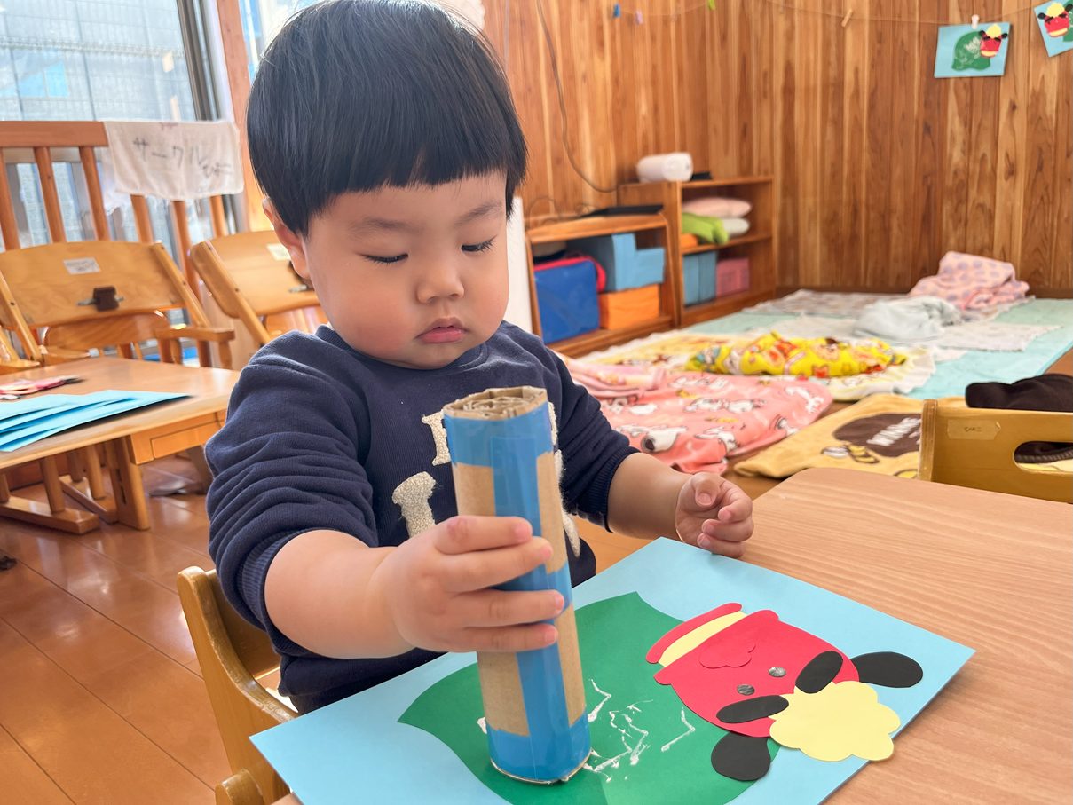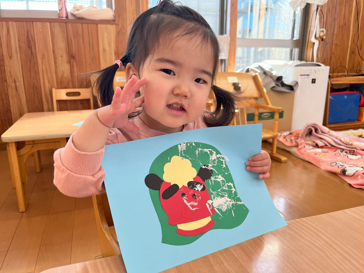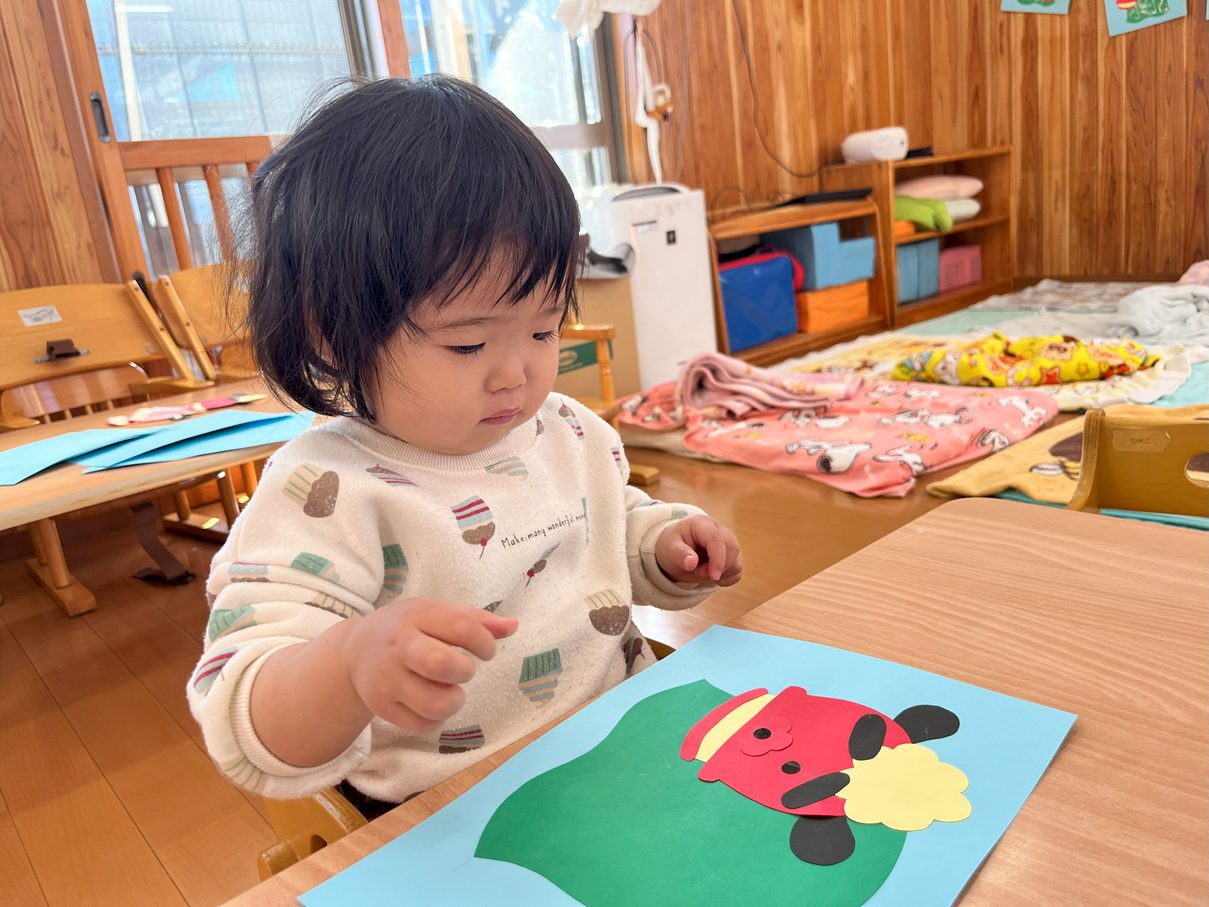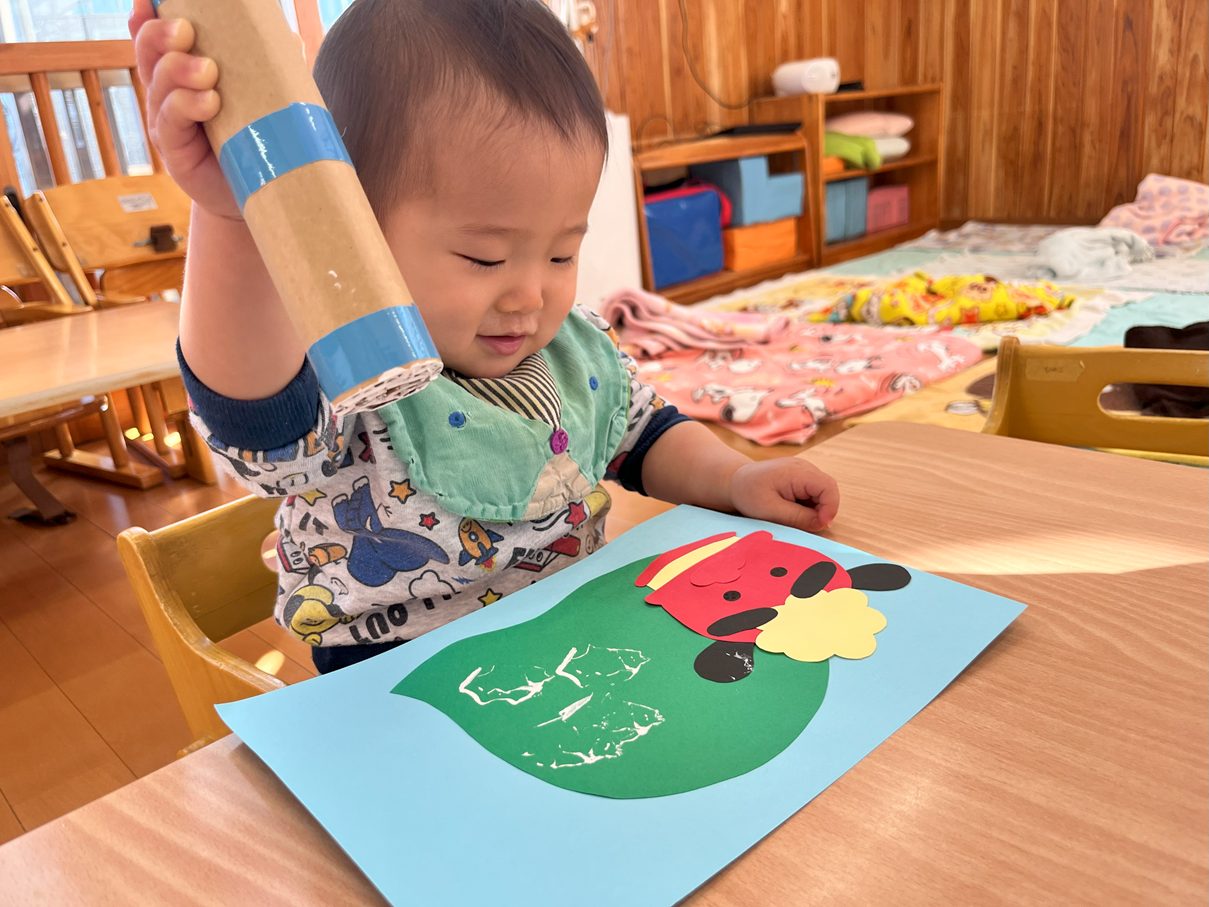 今月の製作は、獅子舞製作を行いました。 まずは、両面テープをはがしたり、丸シールを貼ったりと、保育者の説明や見本をよく見て取り組む子どもたち! 「ぺったんこ。」、「ビリビリ~」と言いながら進めていく姿が見られました。 また、段ボールスタンプでは紙に押してみることで、白い模様が付くことを不思議そうにするひよこ組さん。自身でペタペタとスタンプすることを楽しんでいました♪ どんどん進めていくと、かわいい獅子舞の完成です!持ち帰るまで楽しみにしていてください。