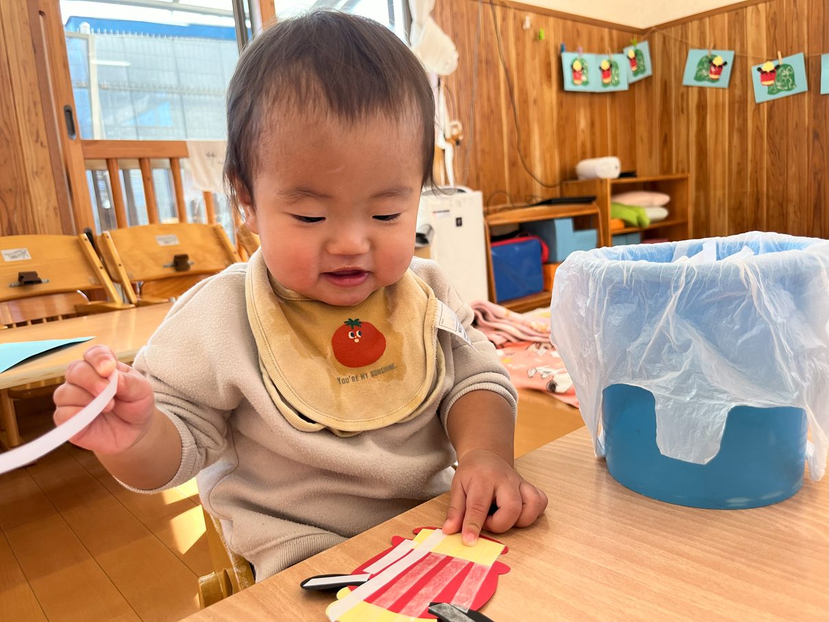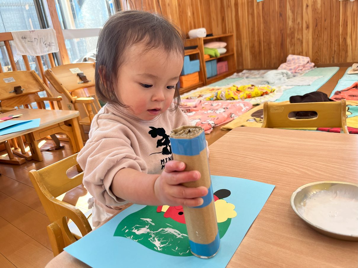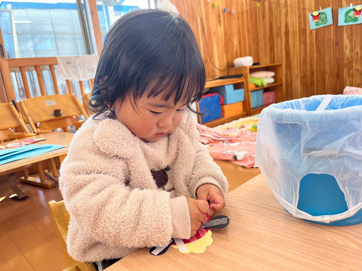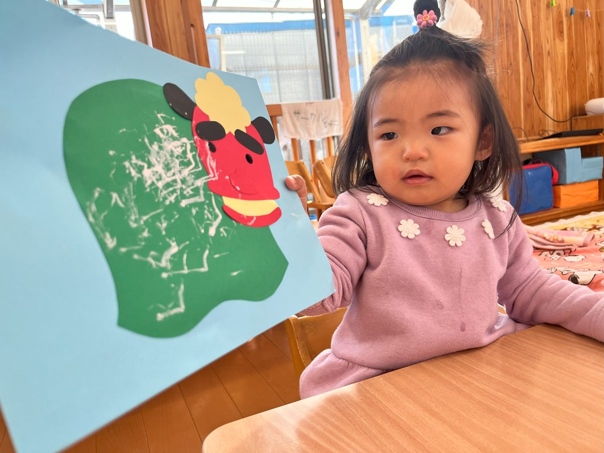 今月の製作は、獅子舞製作を行いました。 まずは、両面テープをはがしたり、丸シールを貼ったりと、保育者の説明や見本をよく見て取り組む子どもたち! 「ぺったんこ。」、「ビリビリ~」と言いながら進めていく姿が見られました。 また、段ボールスタンプでは紙に押してみることで、白い模様が付くことを不思議そうにするひよこ組さん。自身でペタペタとスタンプすることを楽しんでいました♪ どんどん進めていくと、かわいい獅子舞の完成です!持ち帰るまで楽しみにしていてください。