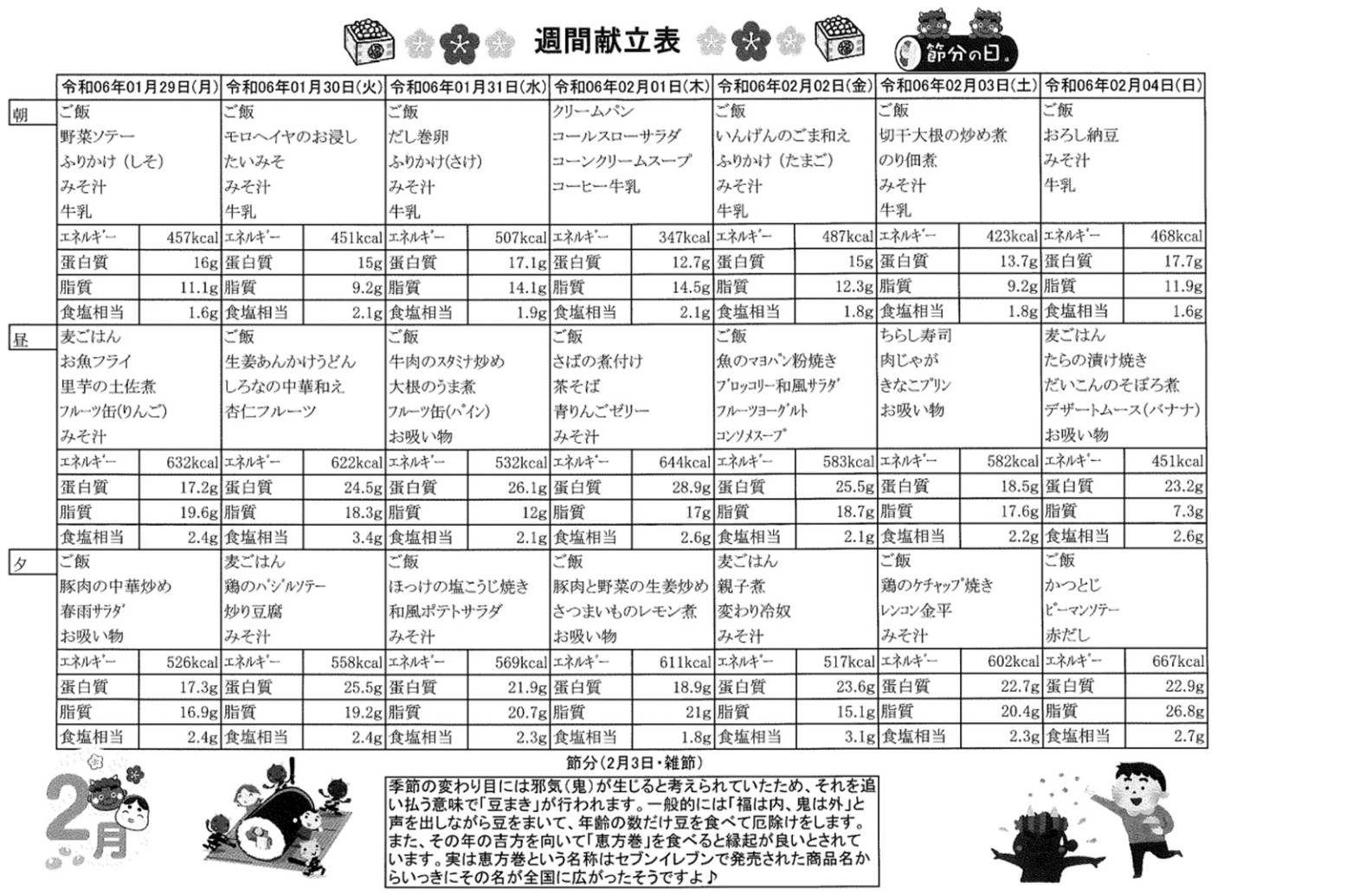1月29日(月)~2月4日(日)の献立表になります。ぜひご覧ください。
