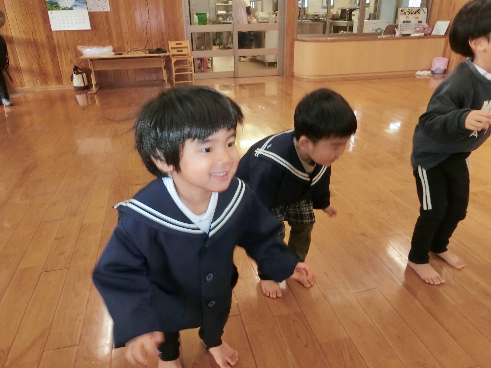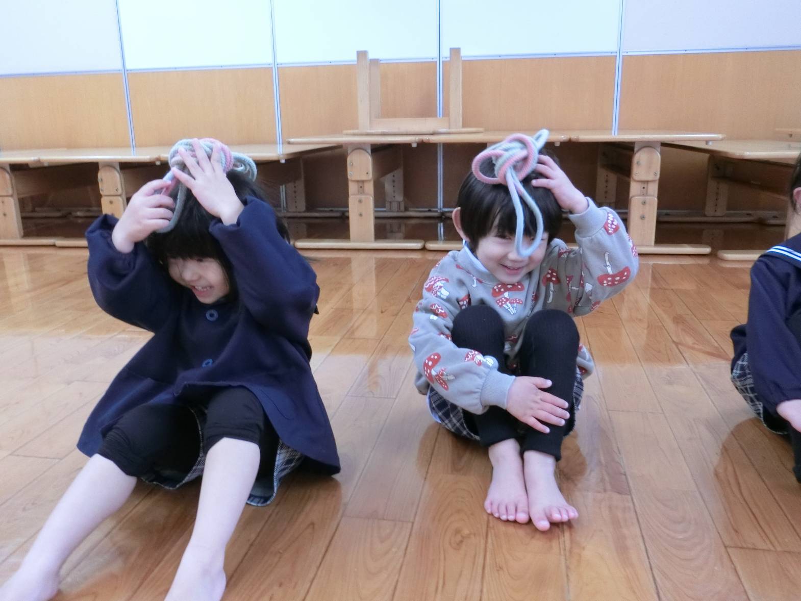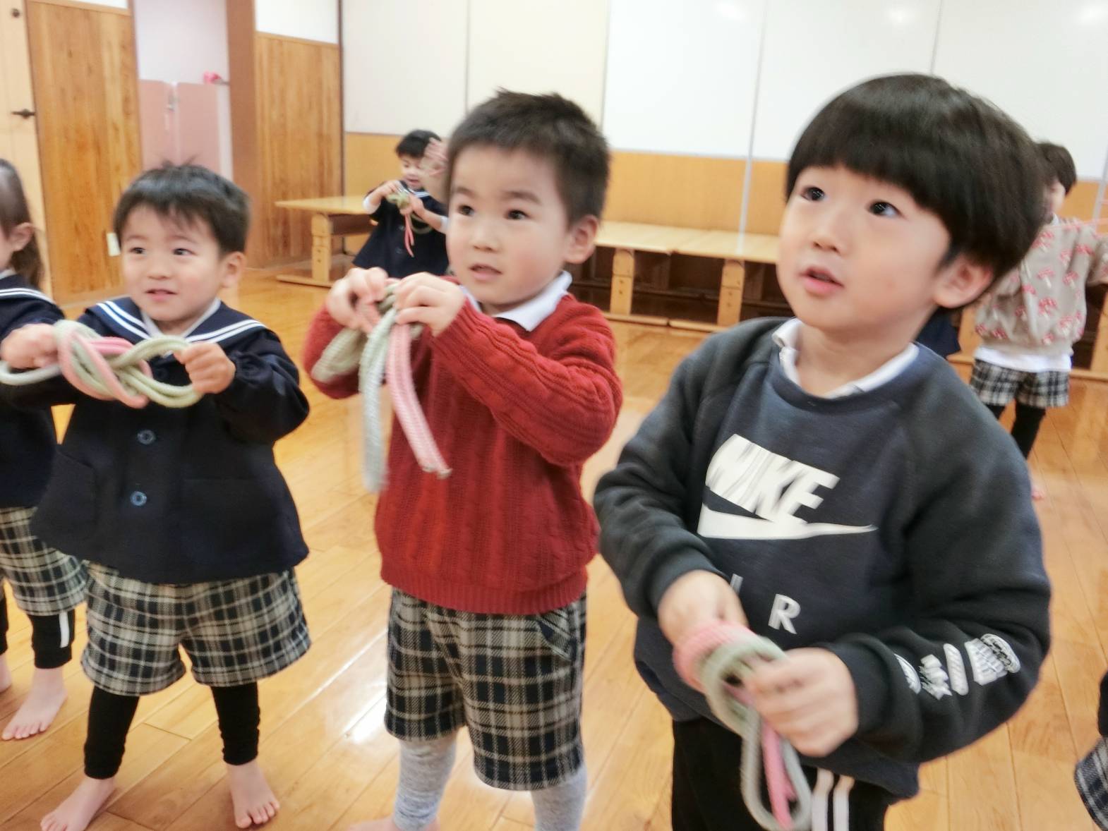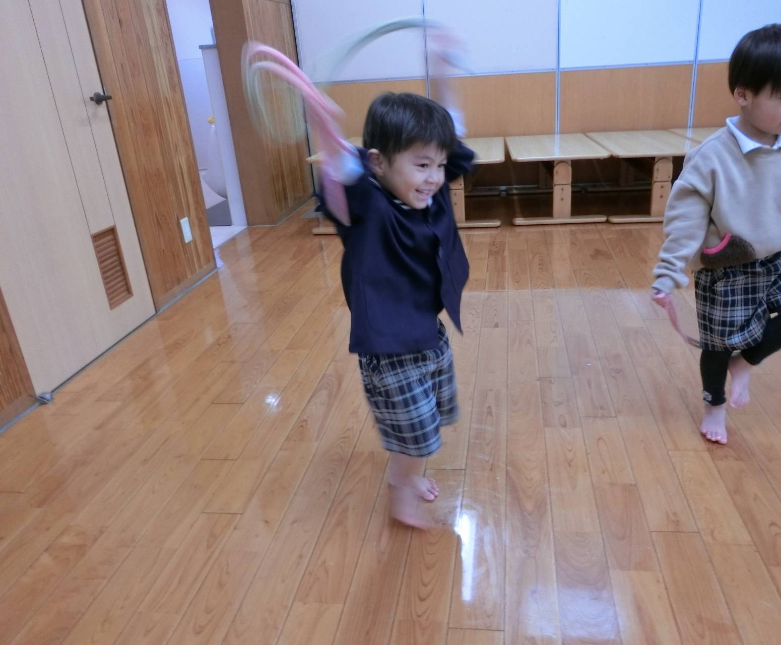 運動遊びをしました! 前回に引き続き、縄跳びとボール遊びの活動を行います。 運動遊びを通して、色々な体の動かし方を知り運動が上手になっているりす組さん。 縄跳びでは「パンツを履いて、シャツを脱ぐ。」の掛け声に合わせて縄の回し方を練習しました! ボール遊びでは、“爆弾ゲーム”をした子どもたち! 「爆弾から逃げるんだ!」、「遠くに逃げたらいいんだよ。」と逃げることが上手なりす組さん。当たったら休憩の約束も守って少しずつルールのある遊びもできるようになっている姿が見られました。