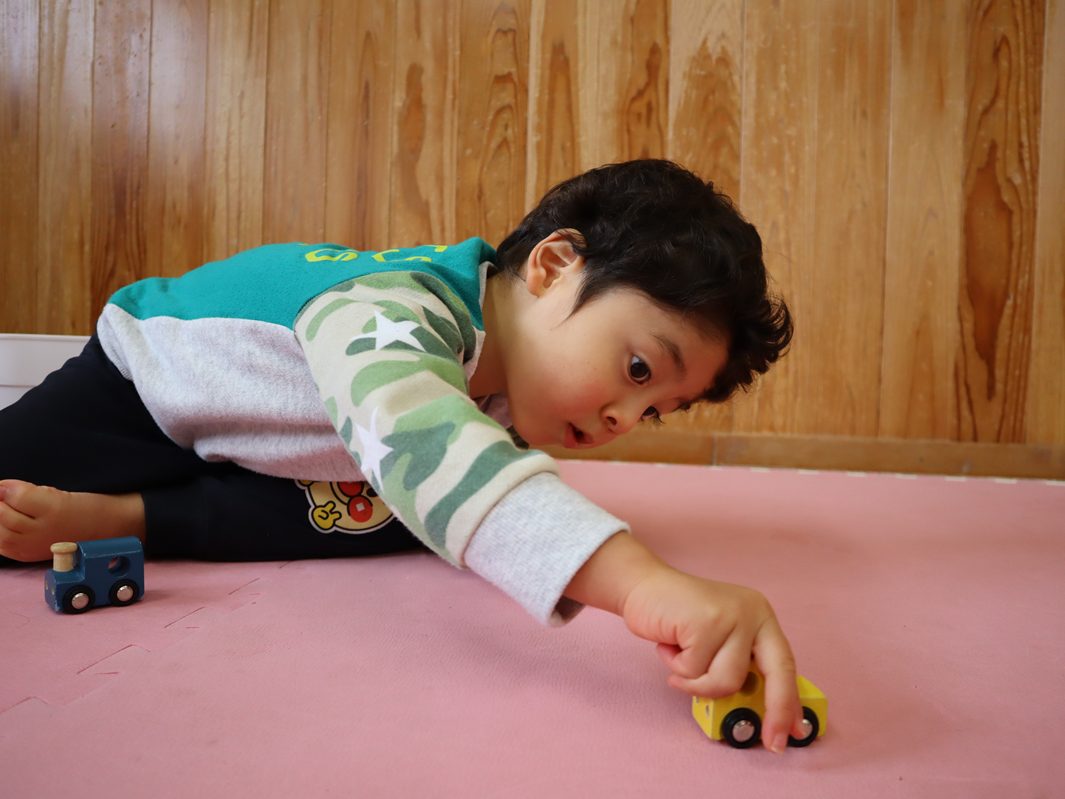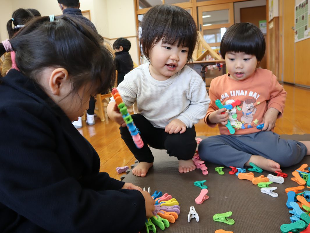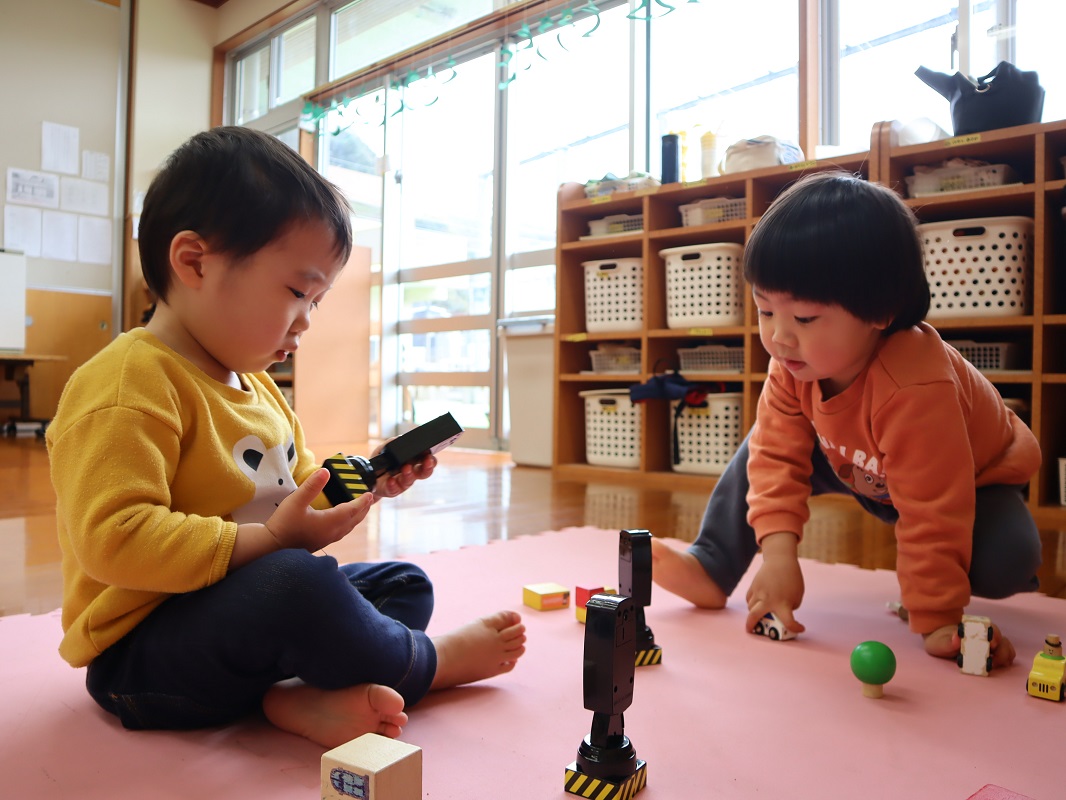 今日はりす組さんの部屋に遊びに行きました。 普段遊ぶことのないおもちゃに大興奮の子どもたち。 中でも電車セットが人気でした。 光る信号機のおもちゃを見つけ、「見て~!」「信号だ!」と大喜び! しばらく遊んでいると、外遊びからりす組さんが帰ってきました。 一緒に遊ぶと楽しさ倍増! 作ったものをもらったり、一緒に会話を楽しんだりと楽しむこあら組さんでした。