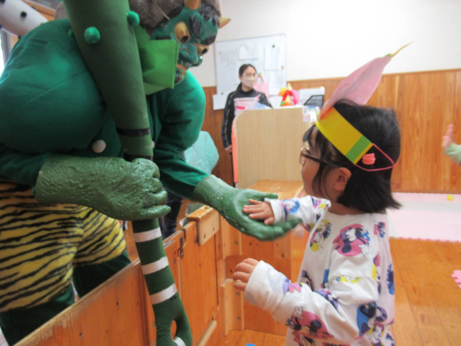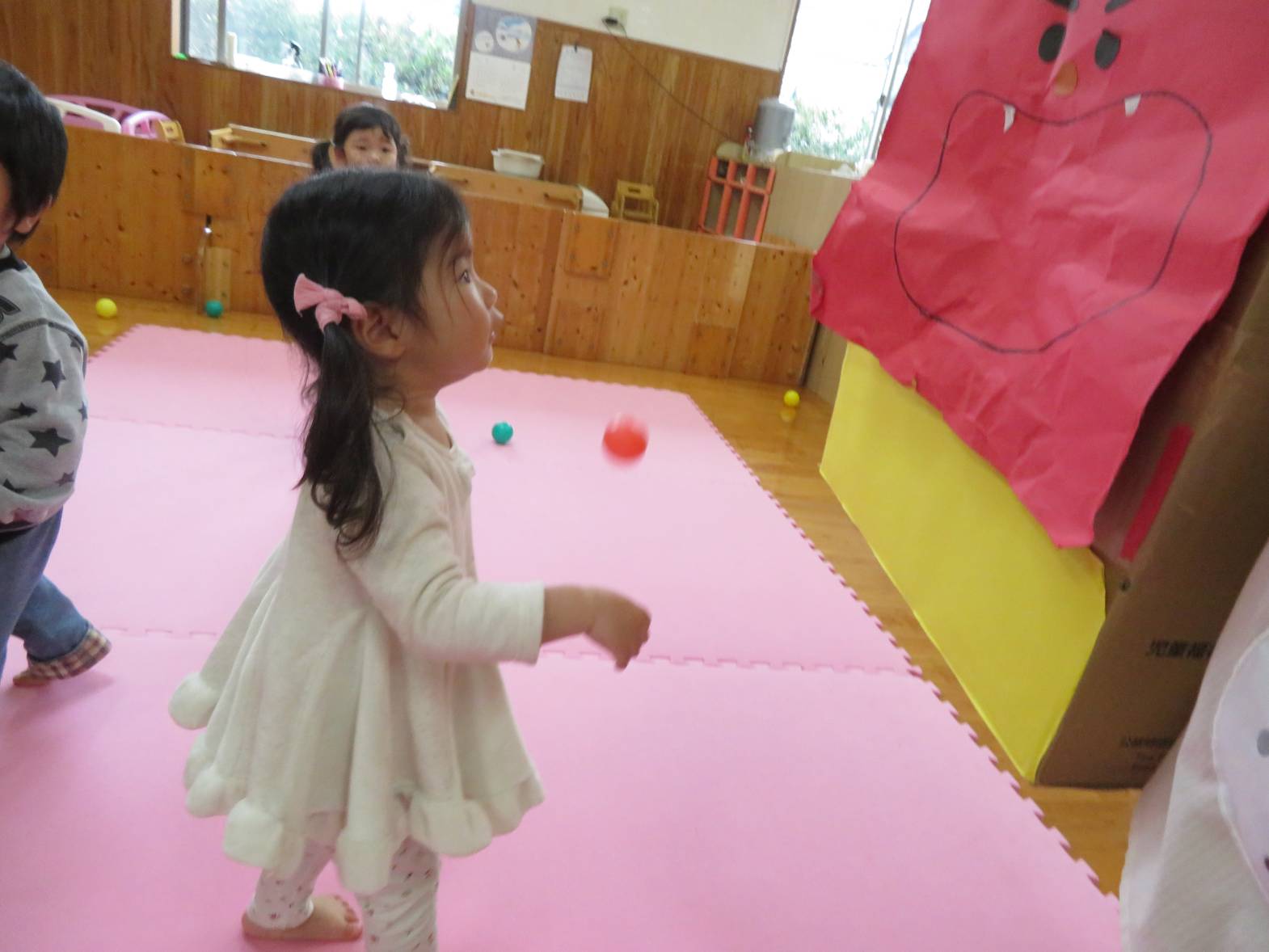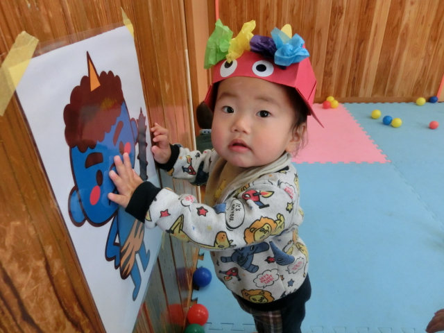 小さい組さんは、鬼のお面をつけて歌を歌ったり鬼の的にボールを投げたりする様子が見られました。