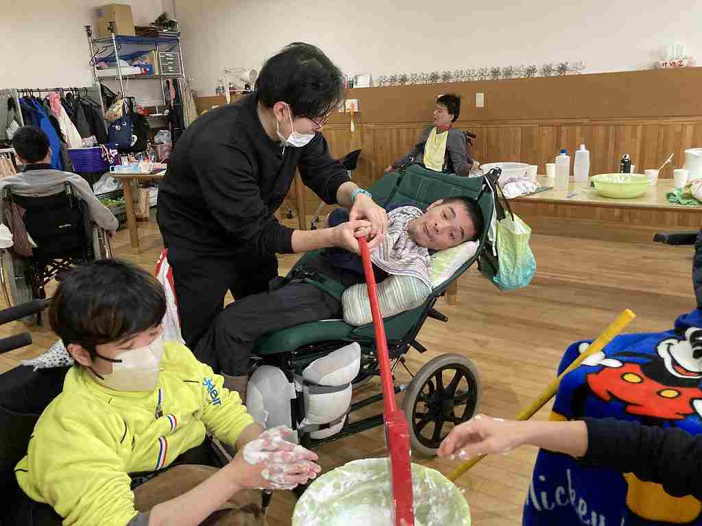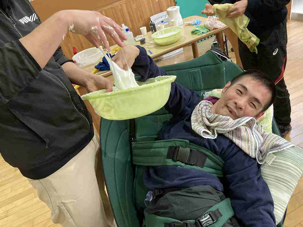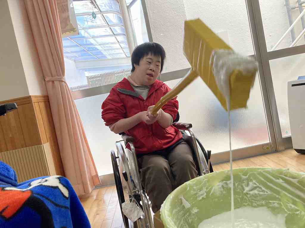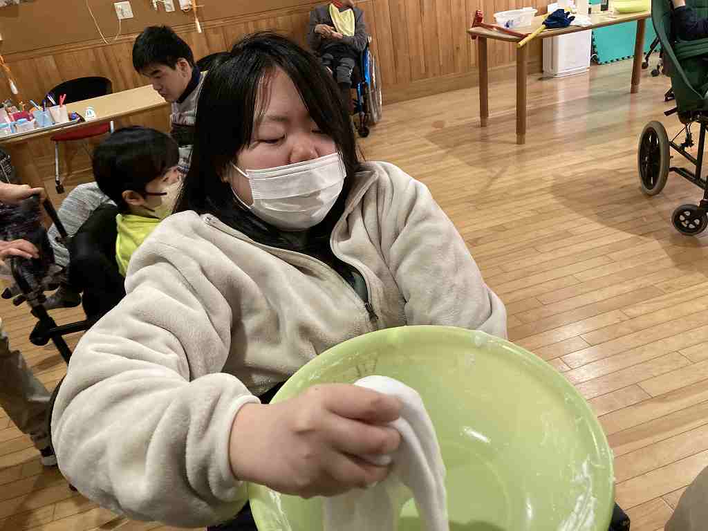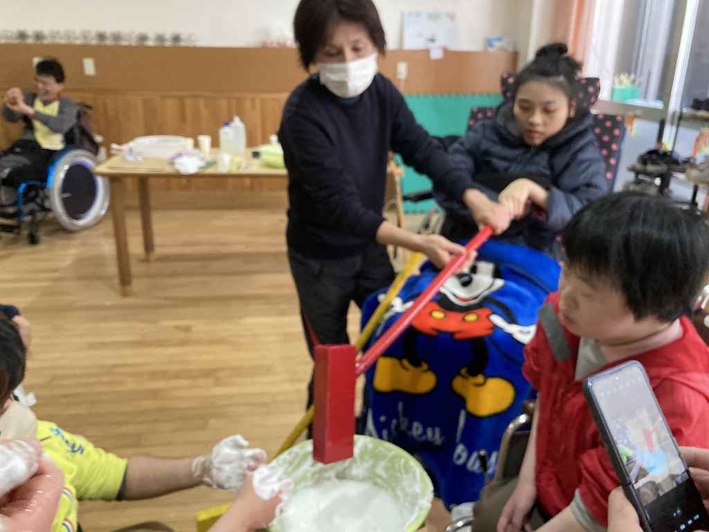 今日はレクリエーション活動で、餅つきゲームを行いました! 新年初めてのレクリエーションということで、今回は1月にちなんで「餅」をテーマに活動を行いました。 材料を入れてひたすらこねます! 材料を混ぜて、根気よく混ぜます! 少し固まってきたら、次は杵でつきながら手でこねます! 「よいしょー!」の掛け声で息を合わせます。 すると・・・段々と固まってきました! 取り出して形を整え・・・立派な鏡餅が完成しました★ 鏡餅ひとつあるだけで、新年の雰囲気を味わえますね。