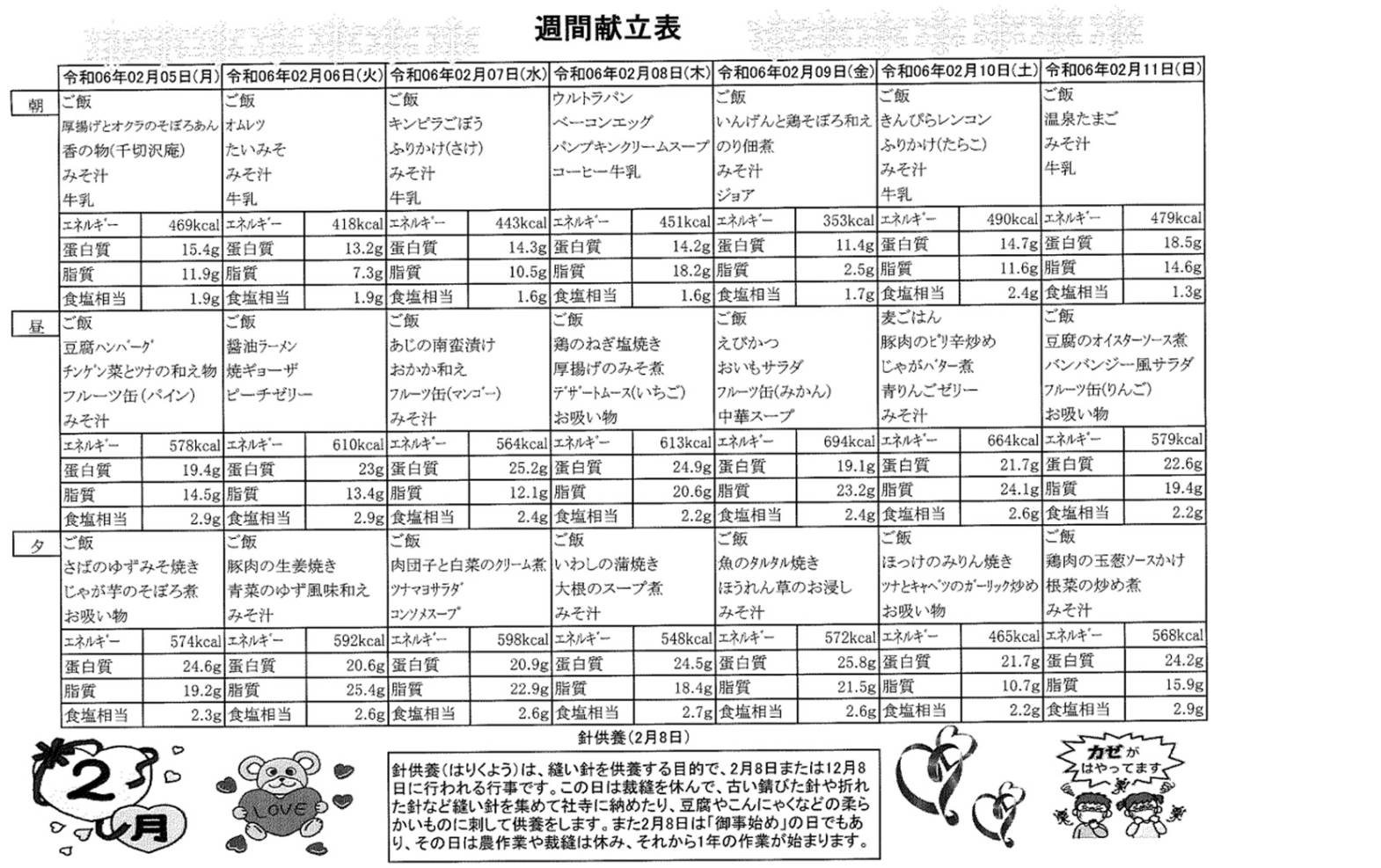 2月5日(月)~2月11日(日)の献立表になります。ぜひご覧ください。