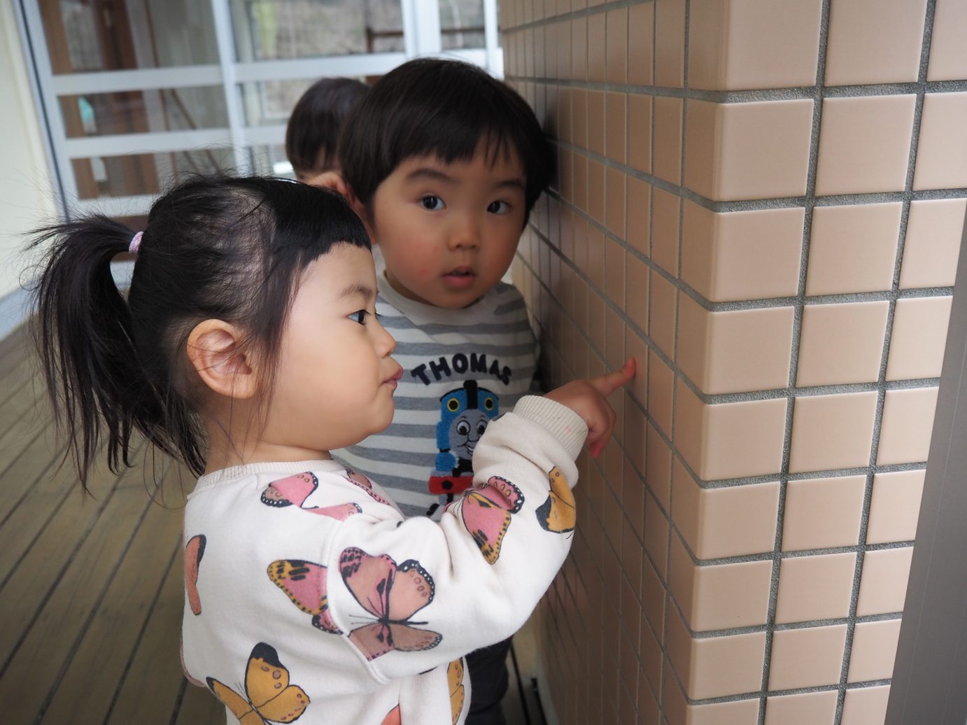 今日はいつもと違う景色を発見!園庭にあったはずの滑り台がなくなっていることに気付き、「滑り台ないよ!」、「どこ行ったかな?」と不思議に思う子どもたち。一生懸命滑り台を探しに行く姿が見られました。また、壁を自動販売機に見立てながら「ピッ。ジュースどうぞ。」等見立て遊びを楽しんでいます。