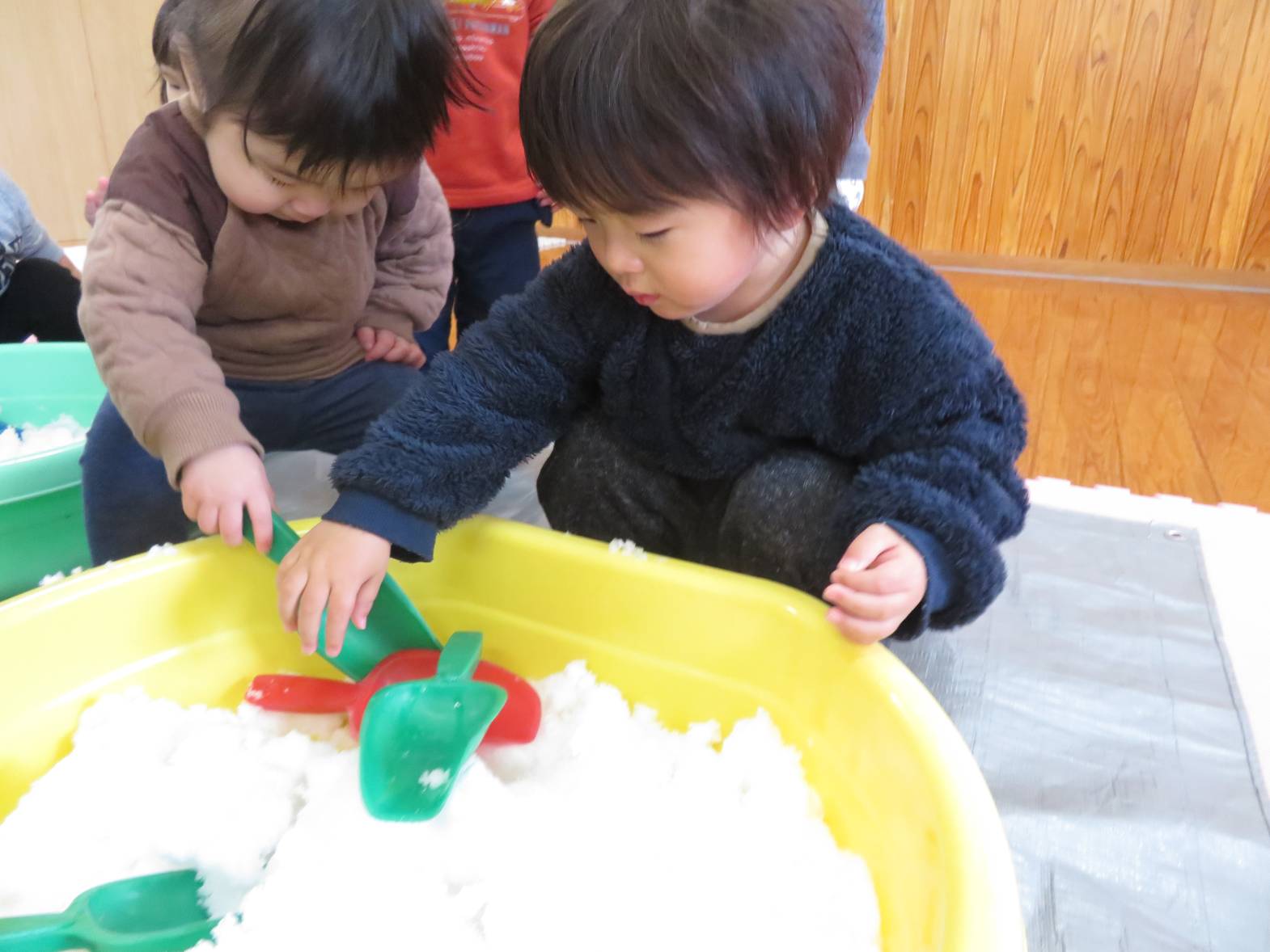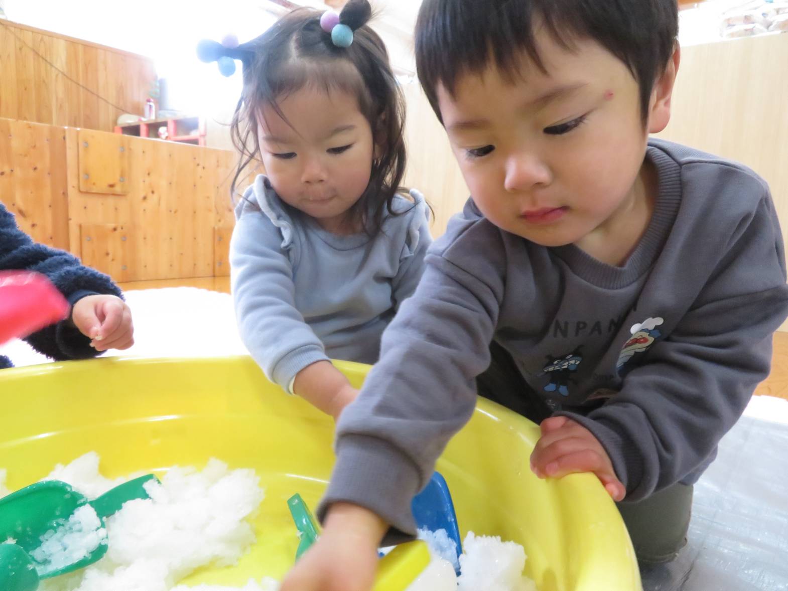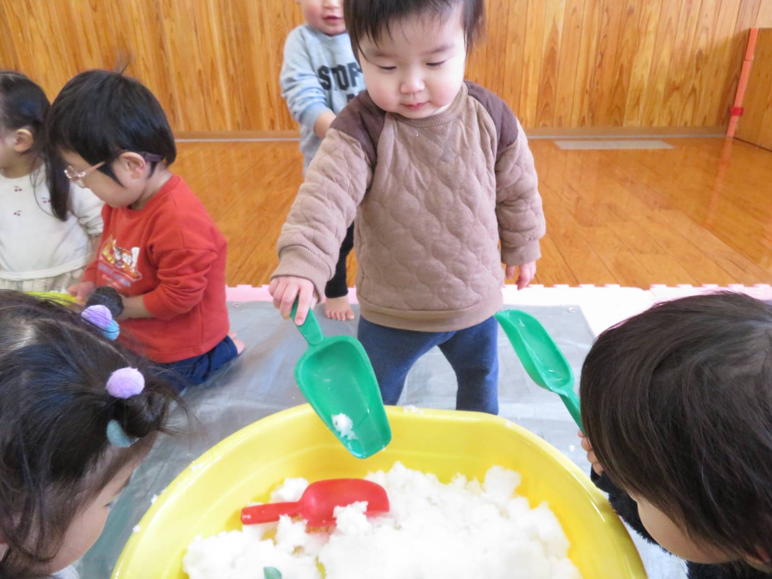 先日、保育園にも雪が降りました。 登園してくると、「雪だー!」、「あれ何?」と、雪への興味が高まる子どもたち! 部屋に雪を持って来ると、「わ~!」と目を輝かせる姿が見られました。 雪を触ると、「冷たーい!」と嫌がる姿も見られましたが、だんだんと慣れ、スコップを使って触れたり、手で触ってみたりしながら楽しみました。 雪遊びの楽しさや雪の感触を知ったこあら組さんでした♪