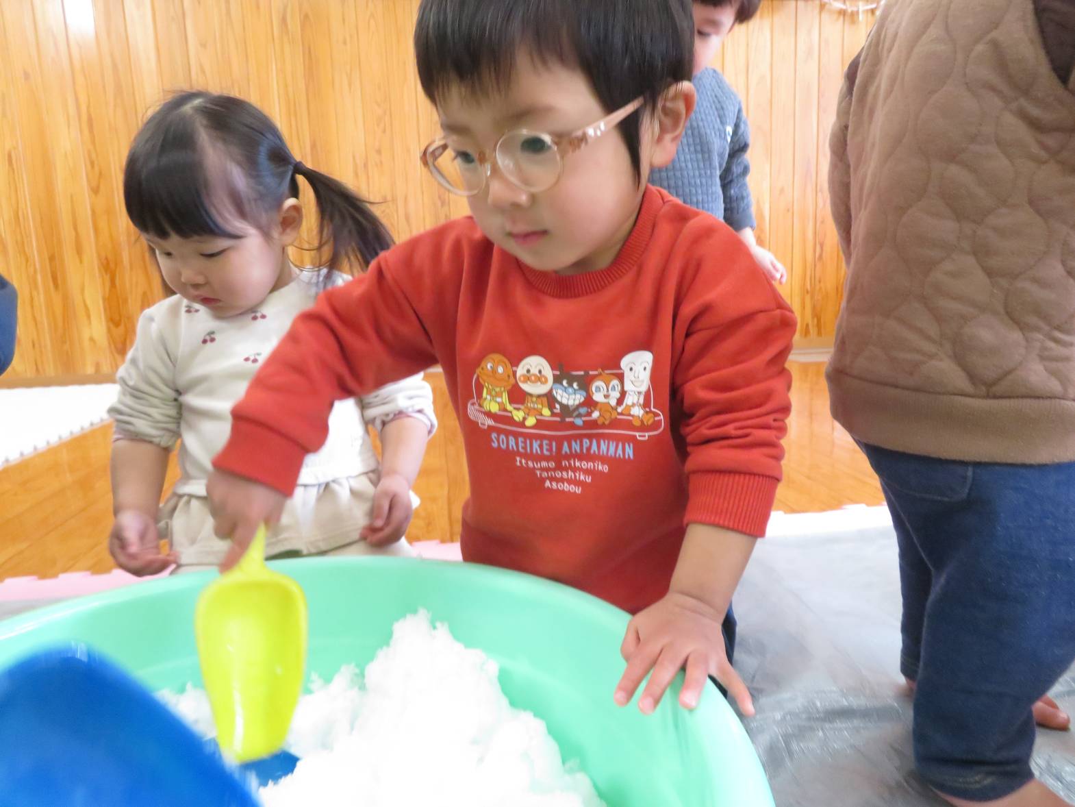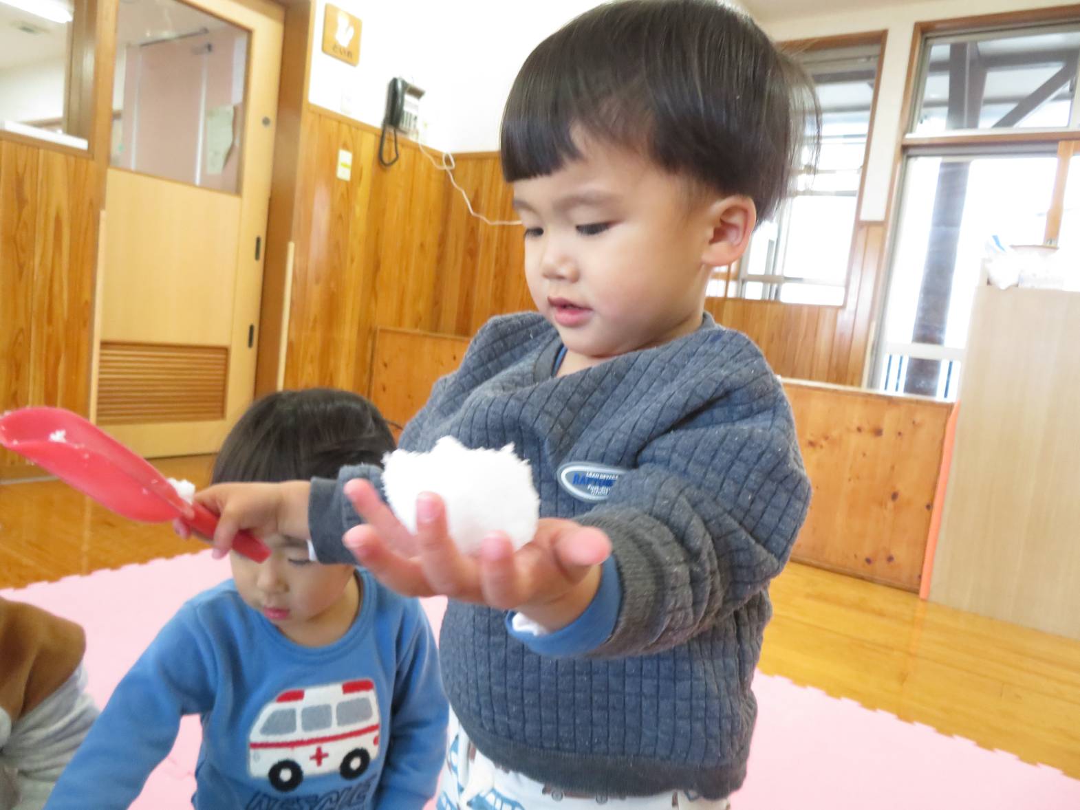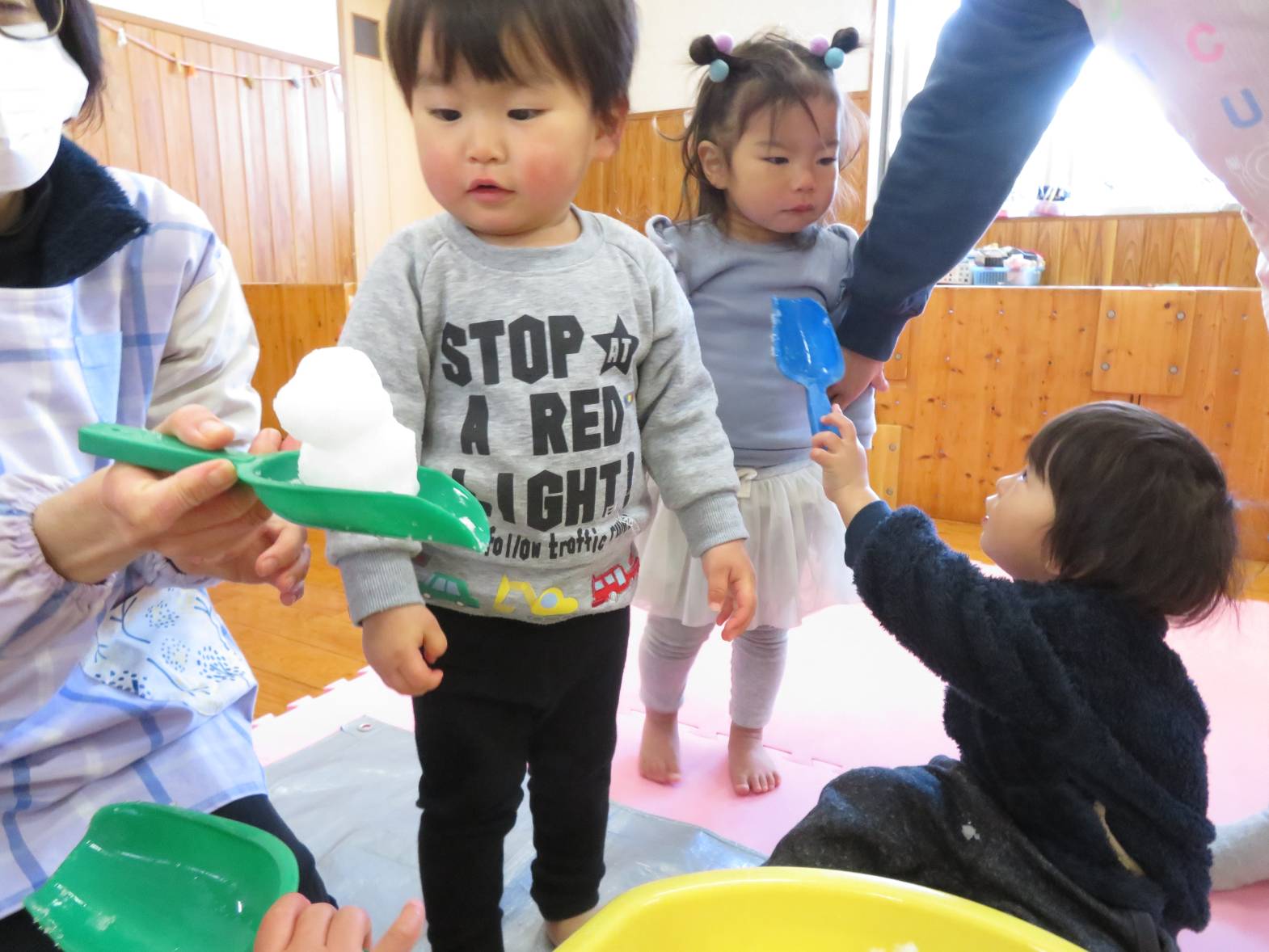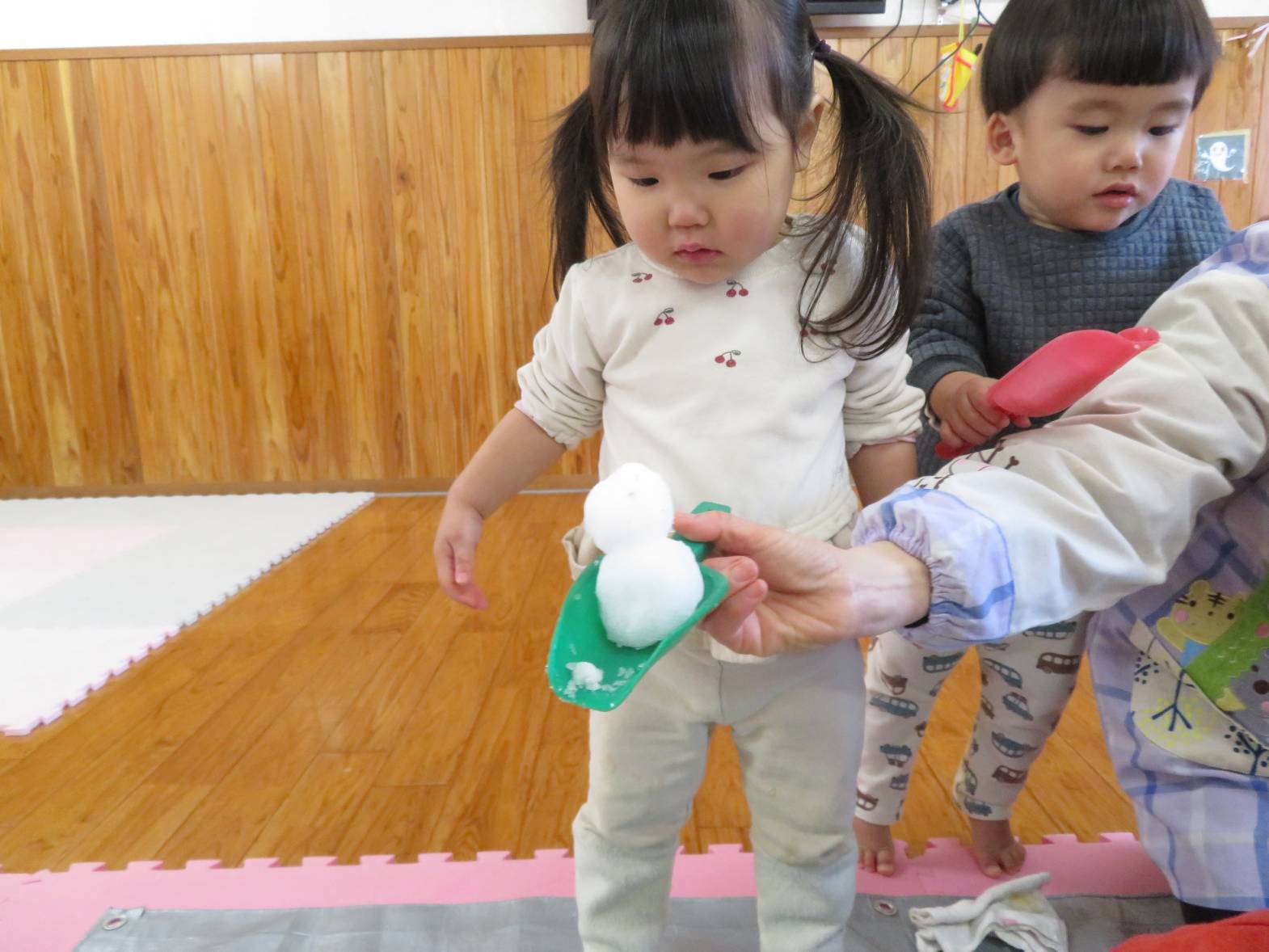 先日、保育園にも雪が降りました。 登園してくると、「雪だー!」、「あれ何?」と、雪への興味が高まる子どもたち! 部屋に雪を持って来ると、「わ~!」と目を輝かせる姿が見られました。 雪を触ると、「冷たーい!」と嫌がる姿も見られましたが、だんだんと慣れ、スコップを使って触れたり、手で触ってみたりしながら楽しみました。 雪遊びの楽しさや雪の感触を知ったこあら組さんでした♪