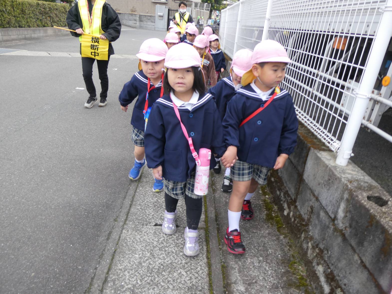 歩道を歩く時も、「白い線からはみ出さないように歩くんだよね。」と約束事もしっかり覚えていた子どもたち。