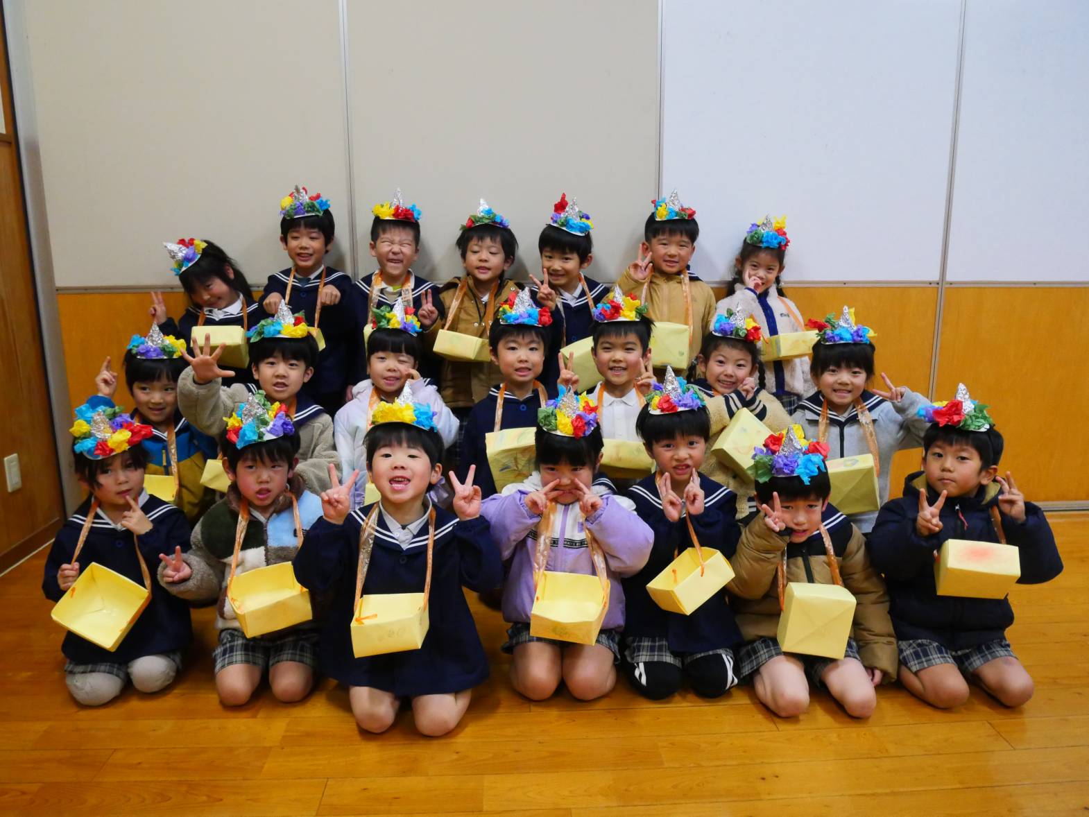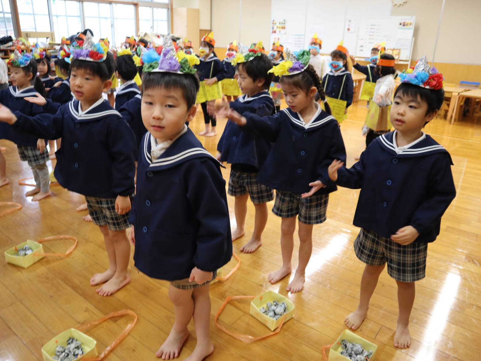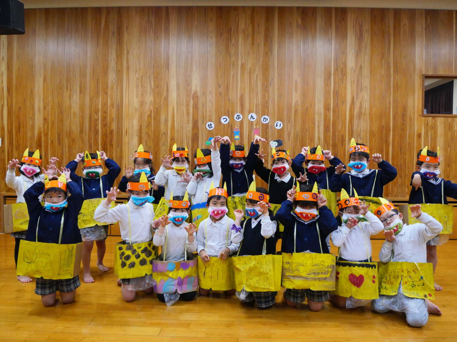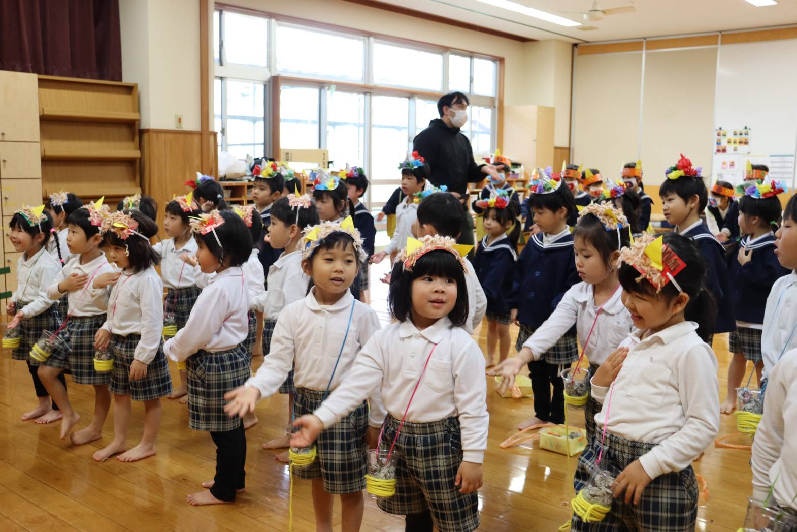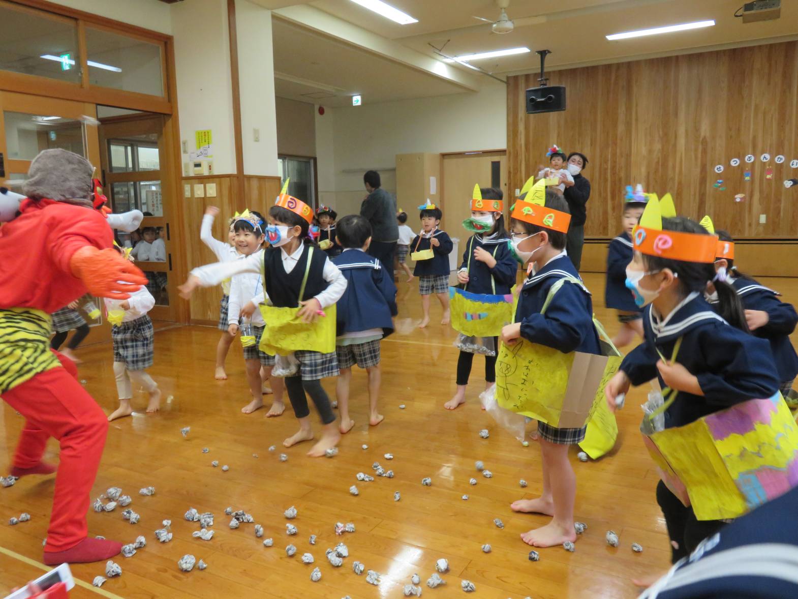 日々の歌の時間に練習した豆まきの歌やのパンツの体操も、大きな声で歌いながら楽しい雰囲気でみんな笑顔です。