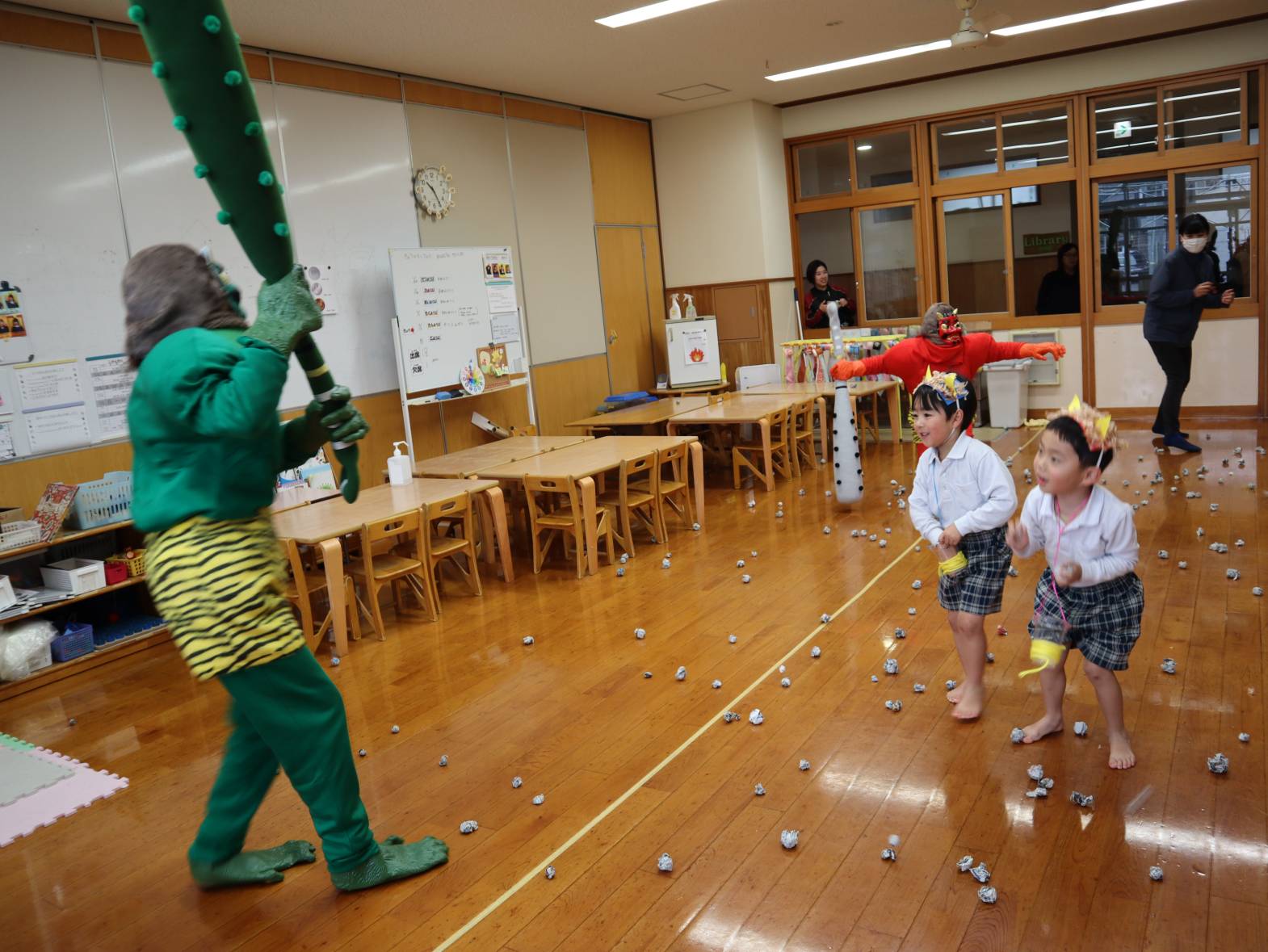 丸めた新聞紙を使って、「鬼はーそと!福はーうち!」と掛け声をかけながら投げる練習をしていると・・・後ろから鬼が登場!