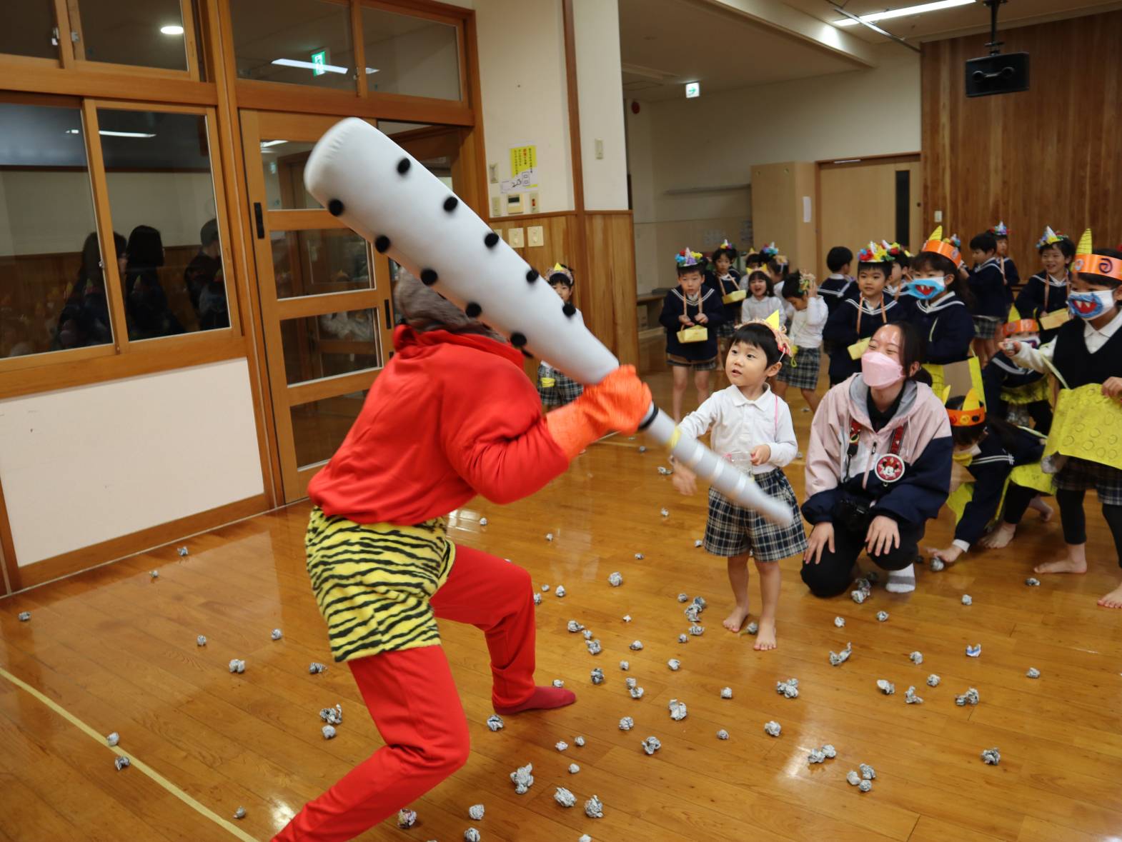 「えい!」、「僕がやっつける!」とたくさんの子どもが勇敢に立ち向かい、みんなの頑張りで無事に鬼を退治できました。