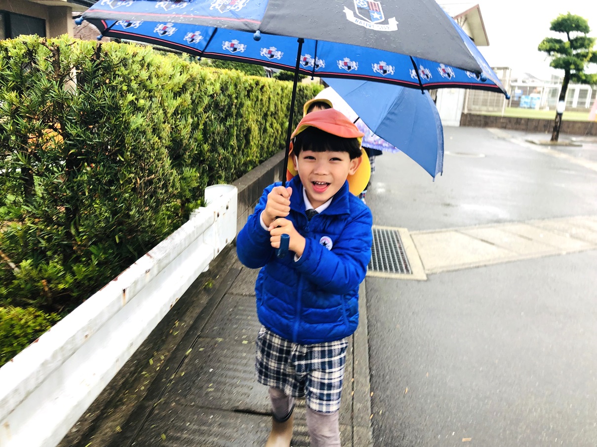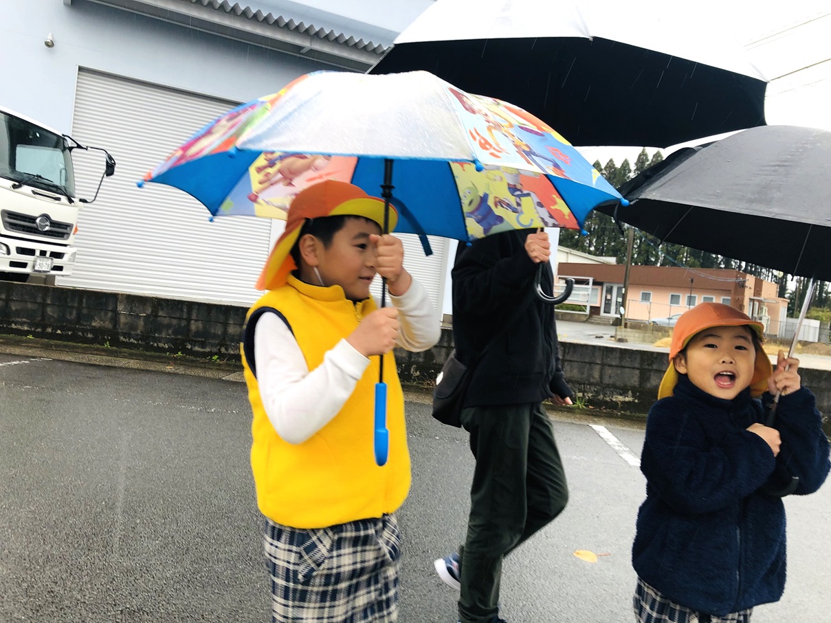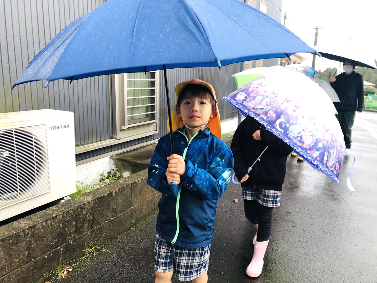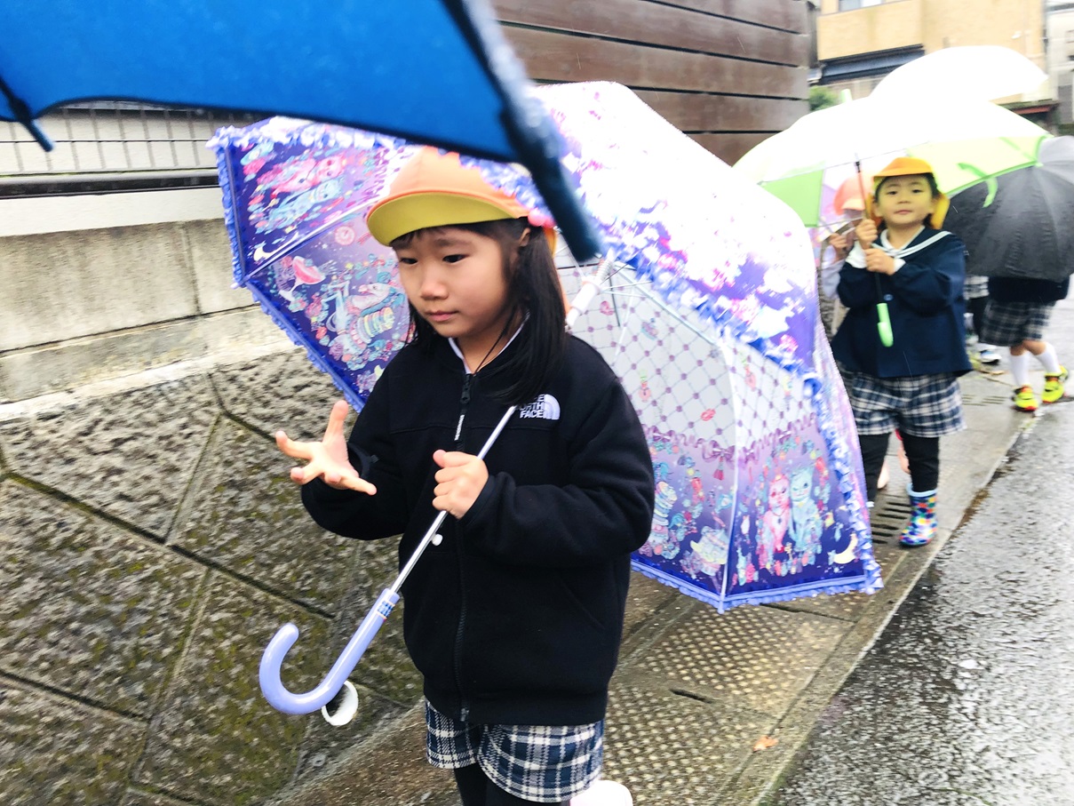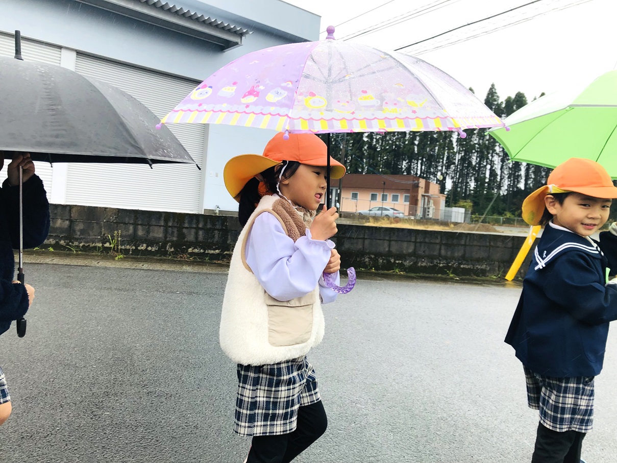 就学に向けて、傘をさして歩く練習を行いました! まず初めに傘の使い方を確認し、早速出発です。 最初は風に飛ばされないように一生懸命に傘を持っていた子どもたちも、慣れてくると体が濡れないように傘をコントロールしてさすことができるようになりました! 「雨の日も小学校まで歩いていけるかも!」「傘難しかったけど、楽しかった!」と自信に繋がった子どもたちでした♪