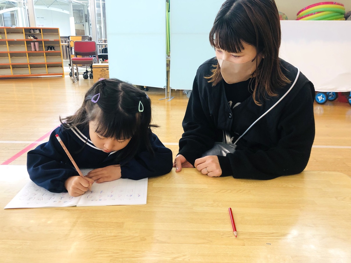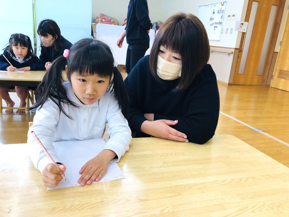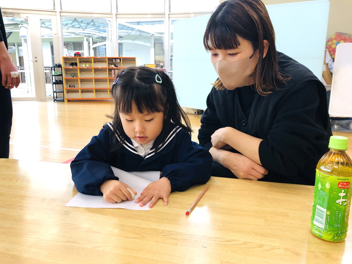 最初は文字遊びからスタートです。年長さんになり毎日文字遊びに取り組んでいる、ぞう①グループさん。集中している姿や成長した姿をお母さんに見てもらい、頑張ったご褒美として花丸を付けてもらいました♪